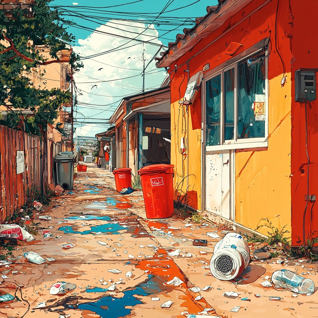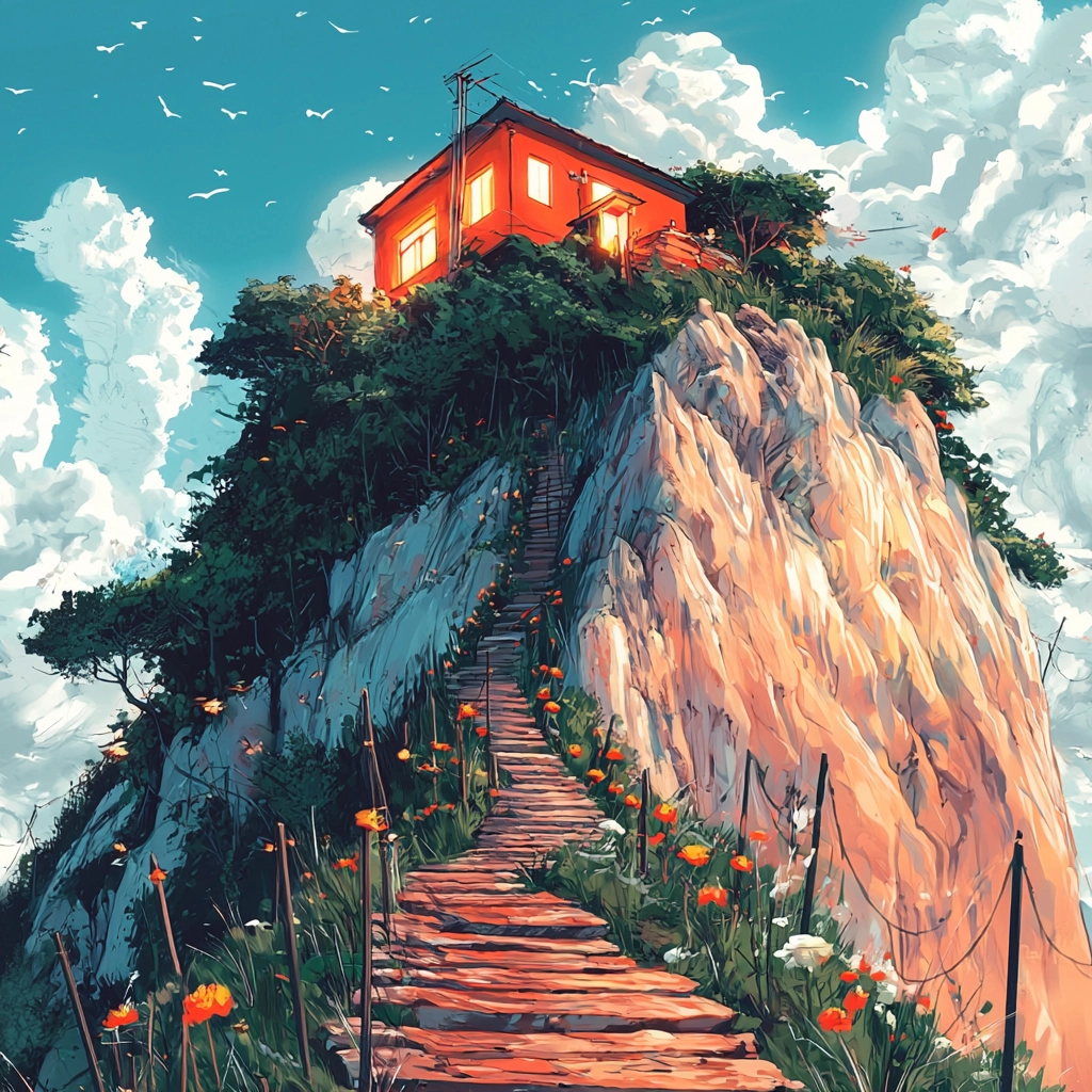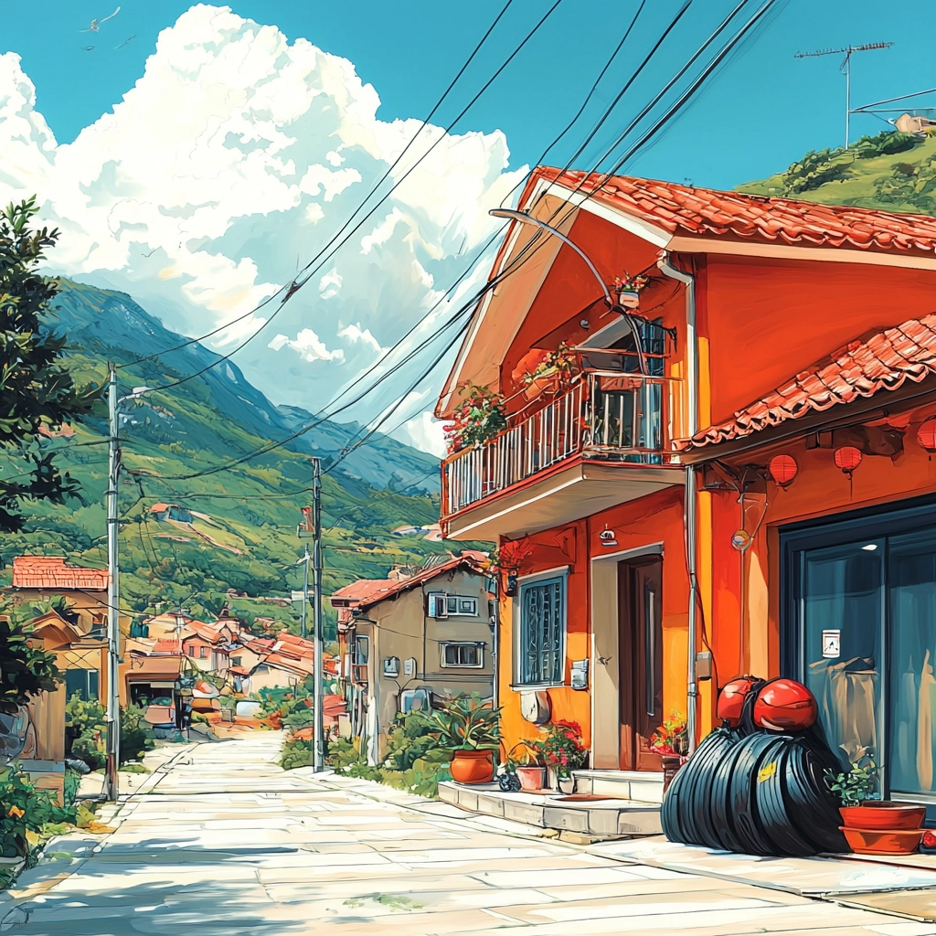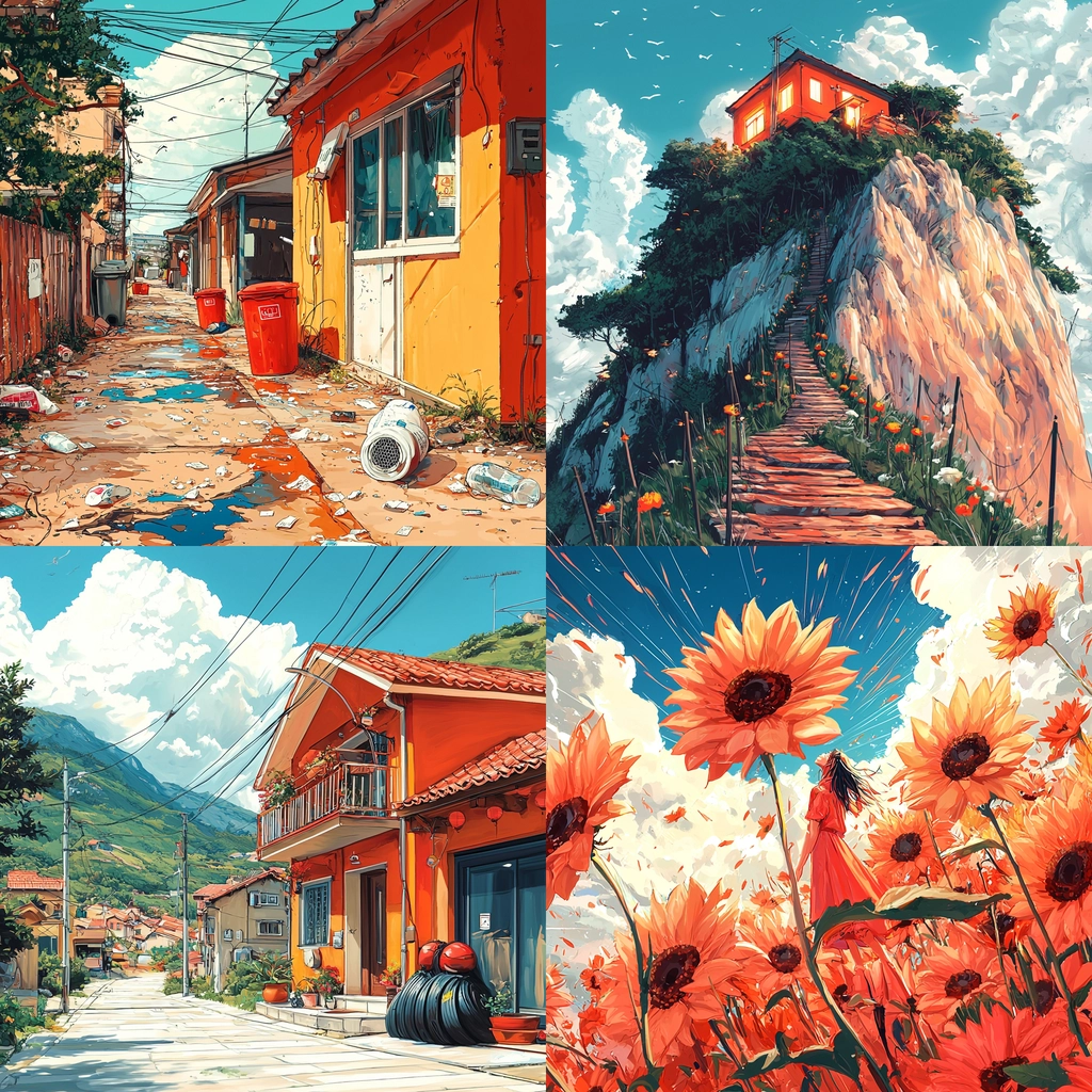 Rich lighting effects highlight the vibrant palette, with bold colors enhancing the spatial depth. Textures are detailed, bringing attention to the intricate surface elements. The overall composition is grounded in realistic portrayals with heightened color contrasts.