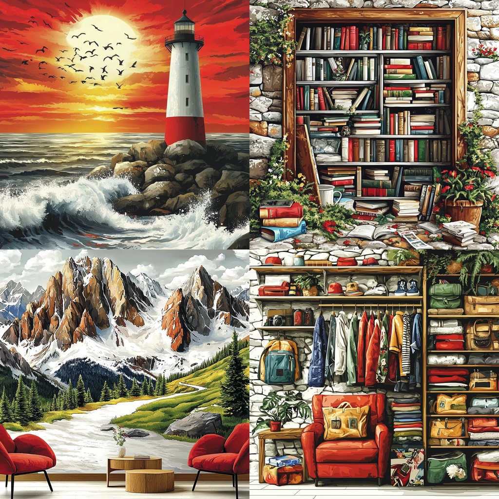 The lighting effects accentuate the colors, creating stark contrasts that highlight the depth and intricacy of each scene. The textures convey a tangible sensation with pronounced details, giving a three-dimensional feel to the various elements captured with a realistic approach.