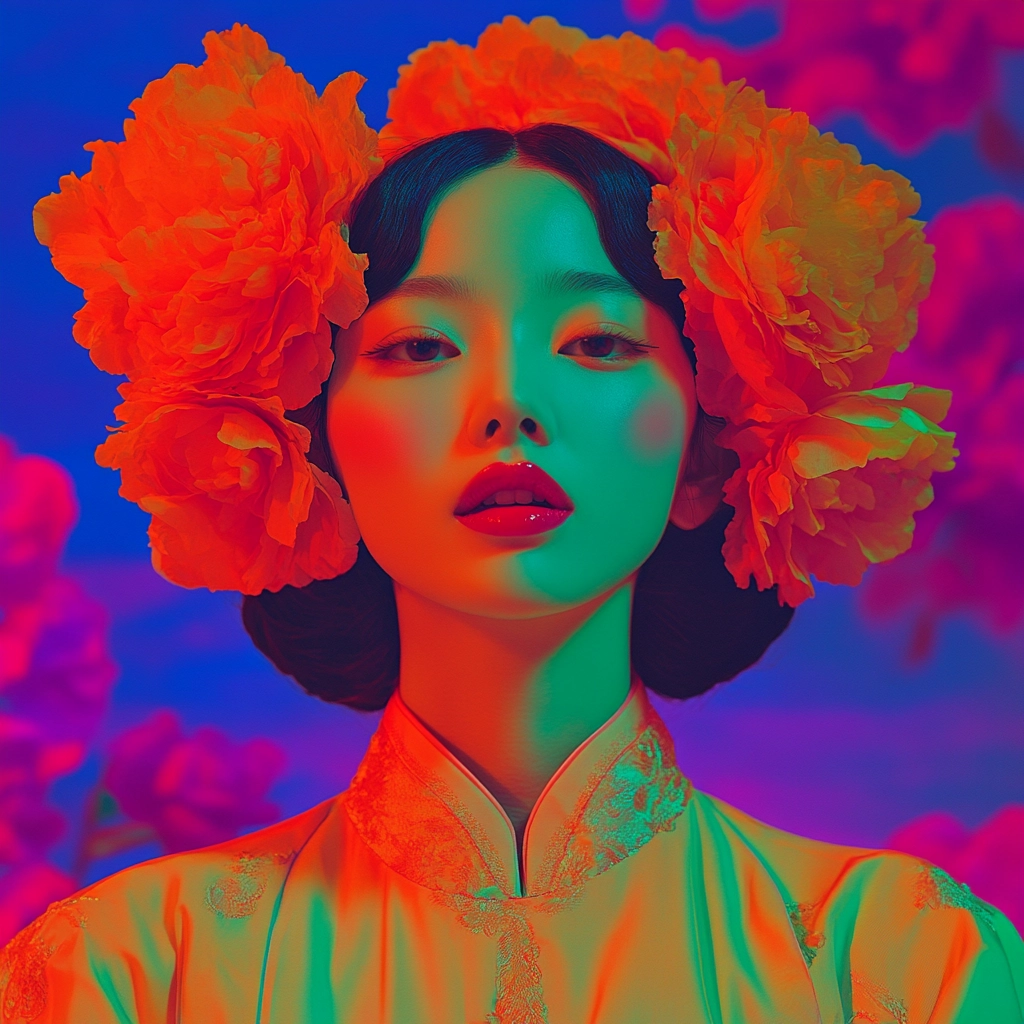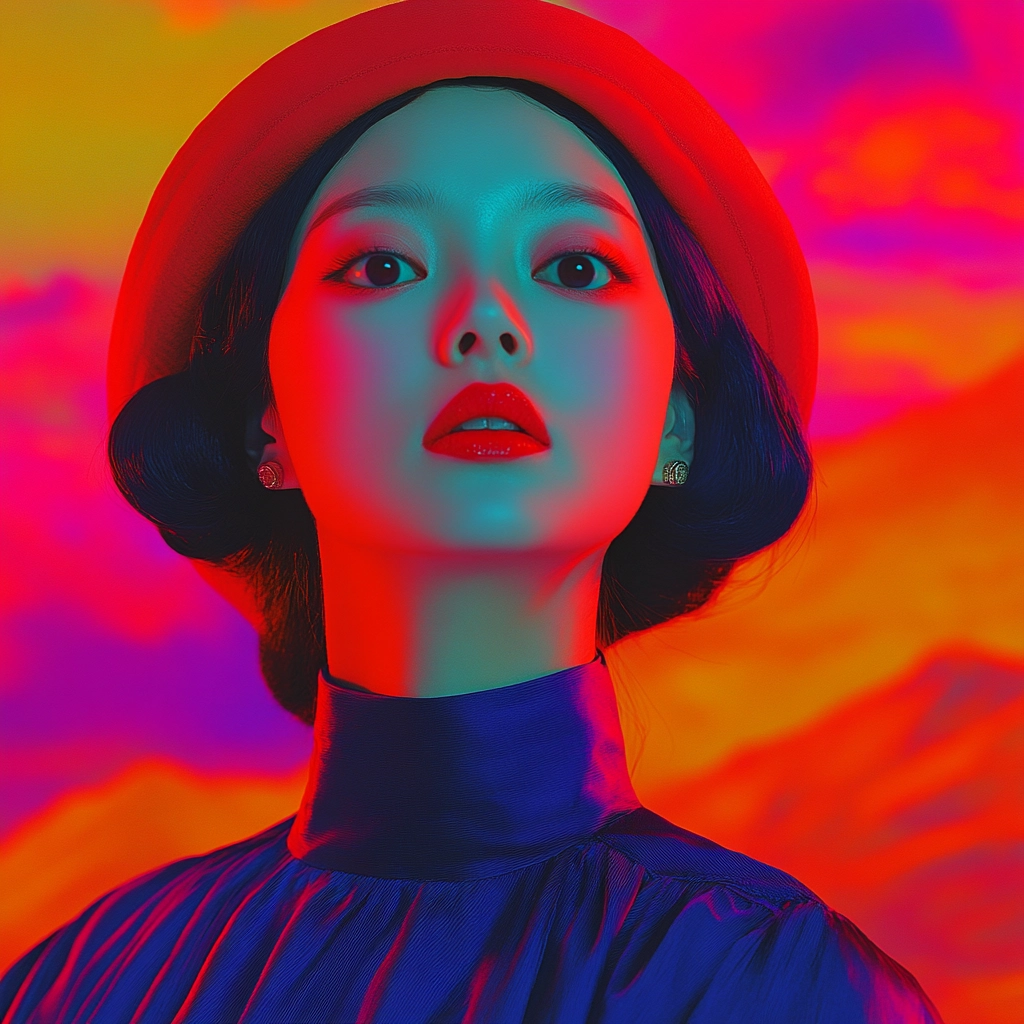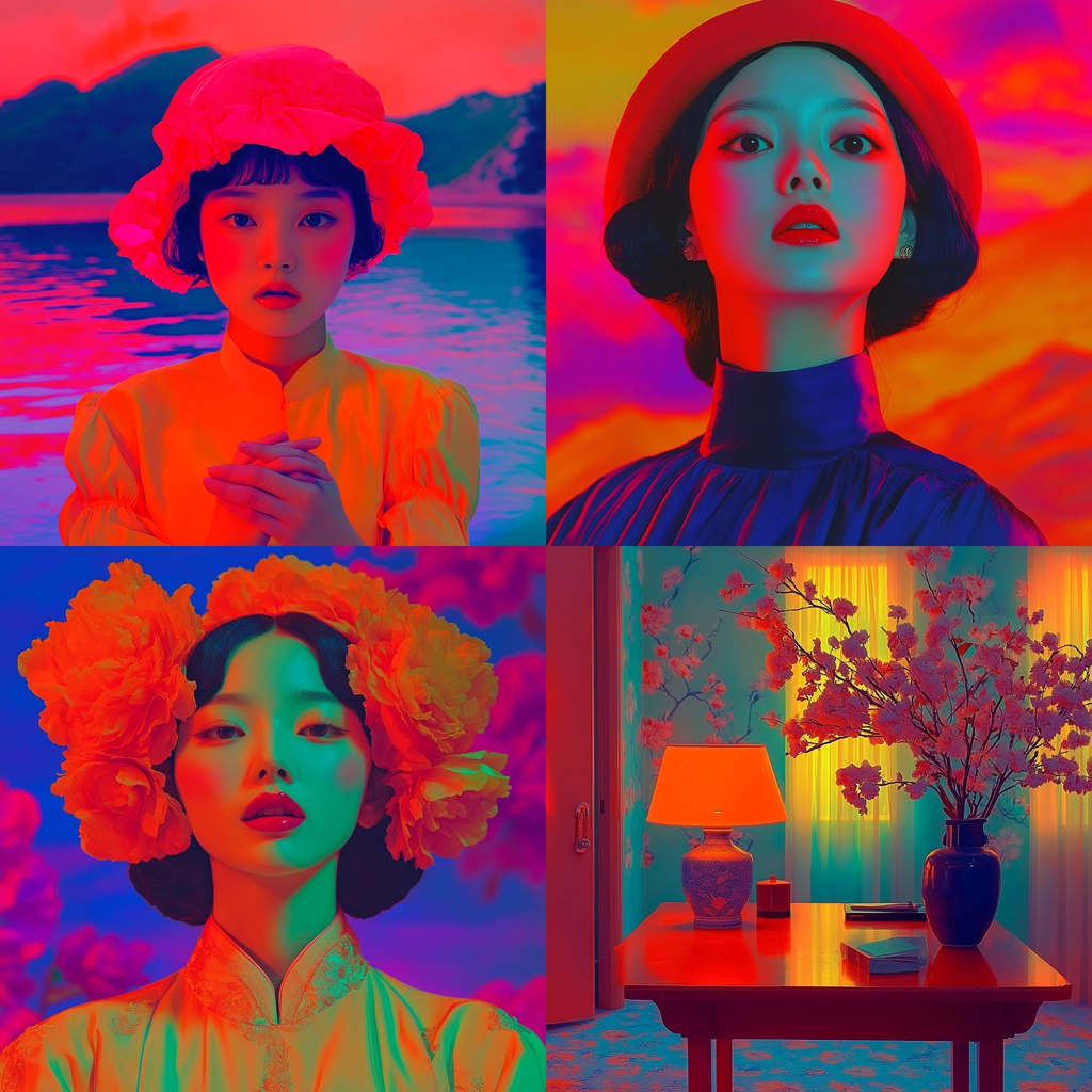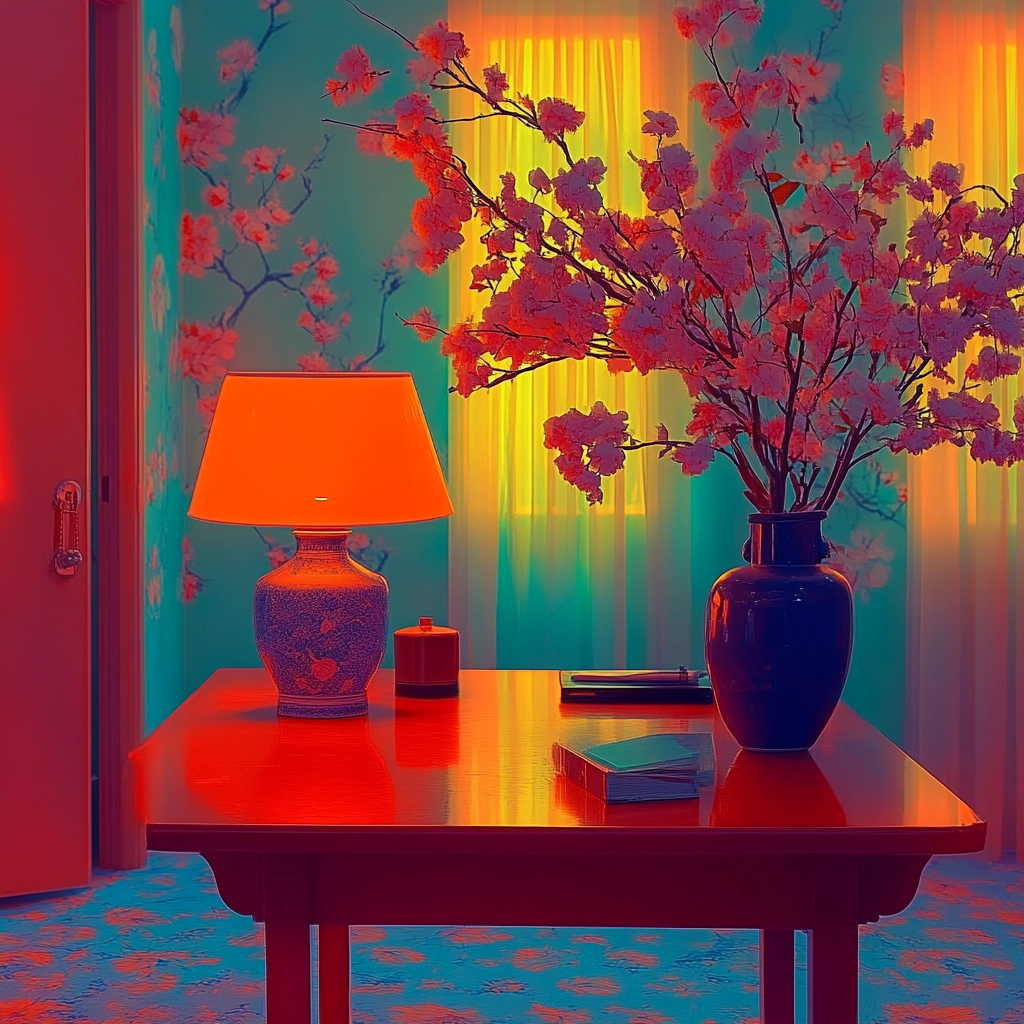 The images showcase dynamic lighting that accentuates the bold and saturated color palette. Textures are sharply defined, creating a vivid spatial sense. The composition utilizes color contrast effectively, with spaces flowing seamlessly into one another.