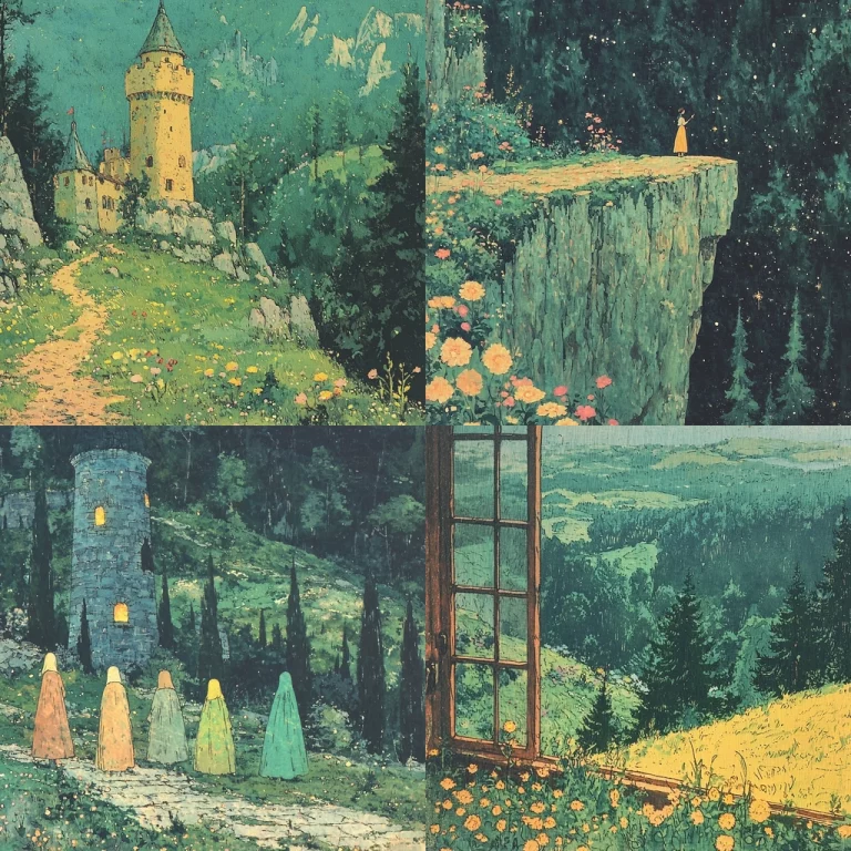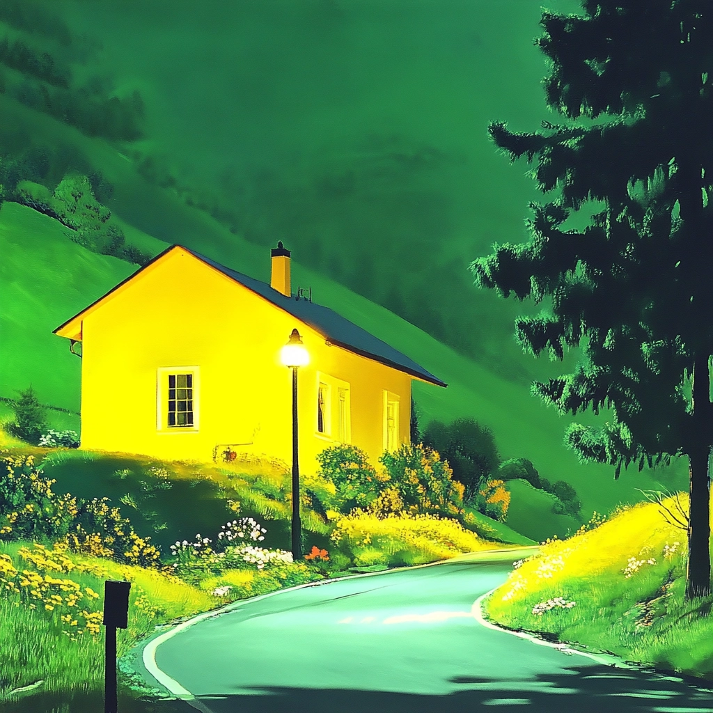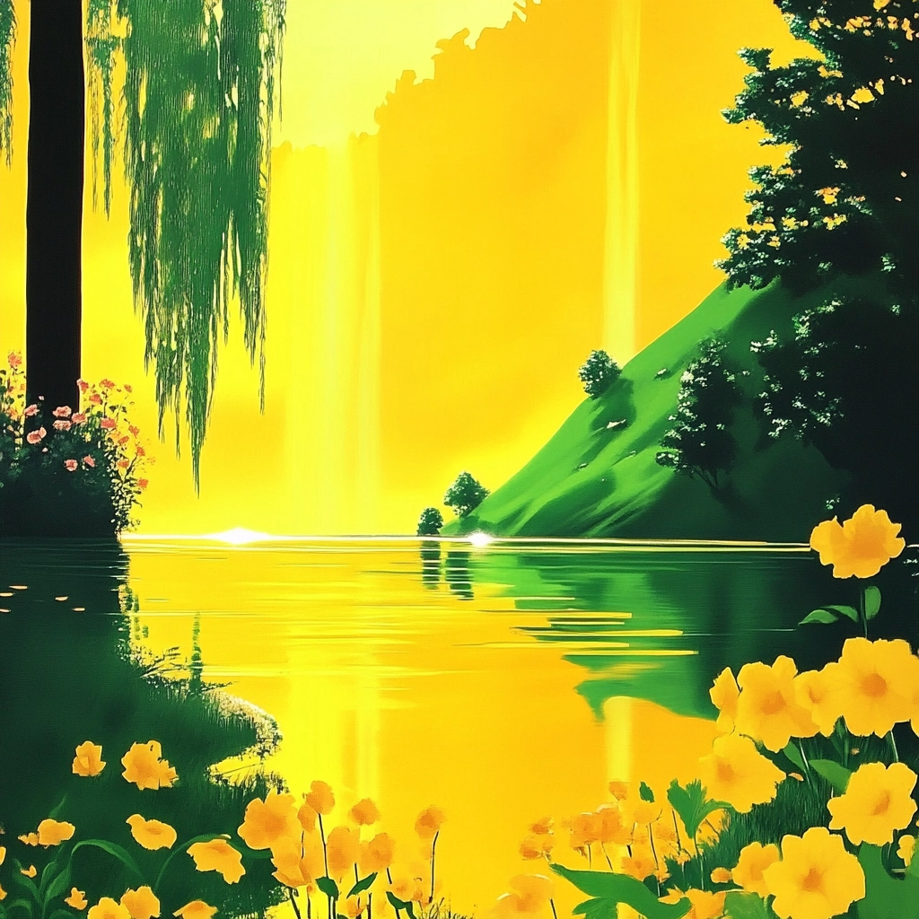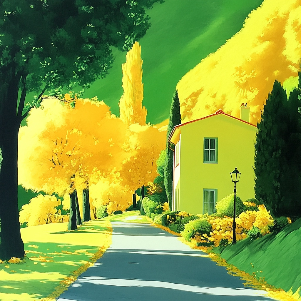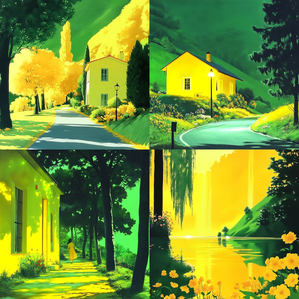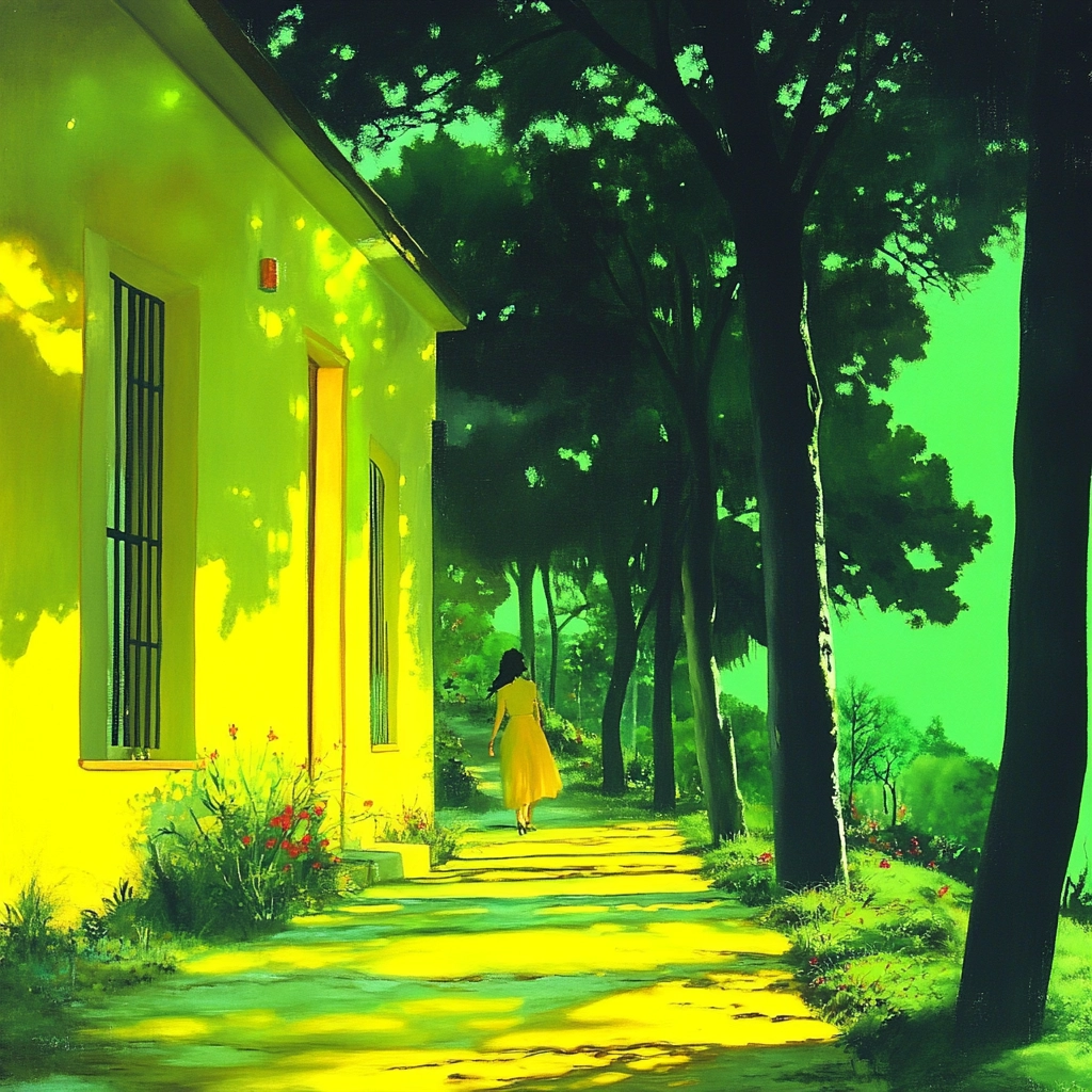 Strong lighting enhances the sharp contrast between illuminated yellows and deep greens, creating a vibrant spatial atmosphere. Textures are smooth with strategic use of shadows giving depth to linear elements.