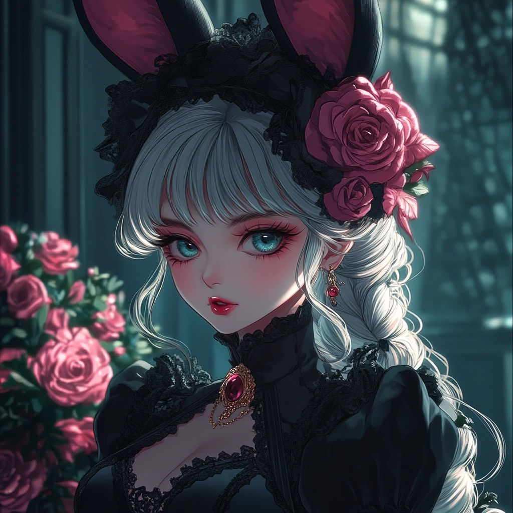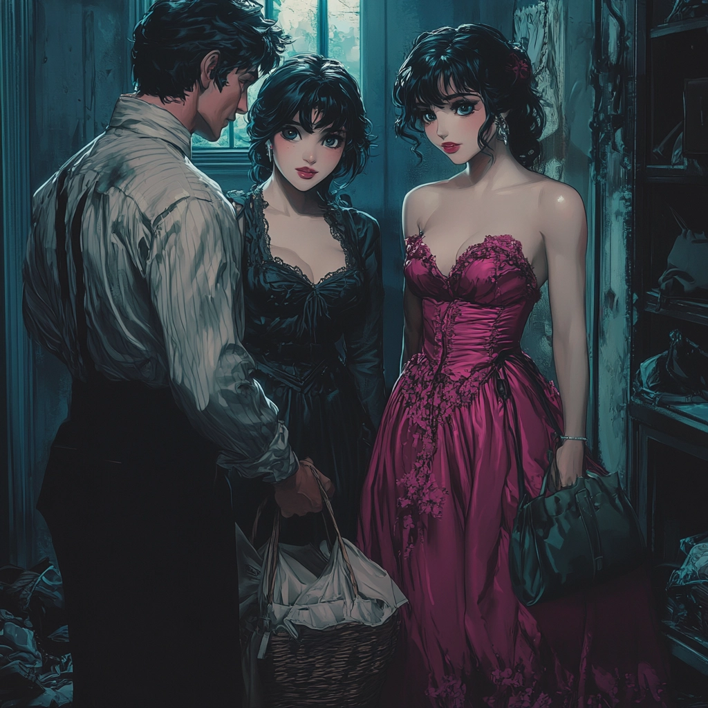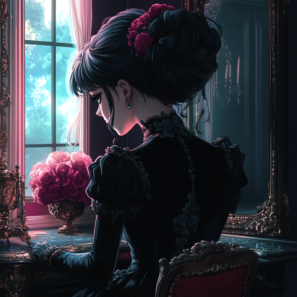 Soft lighting accentuates fabric textures and ornate details, creating a depth that mingles with floral elements. The contrast between rich pinks and deep blacks establishes a lush, textured arrangement within enclosed spaces.