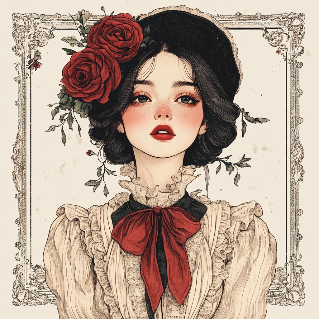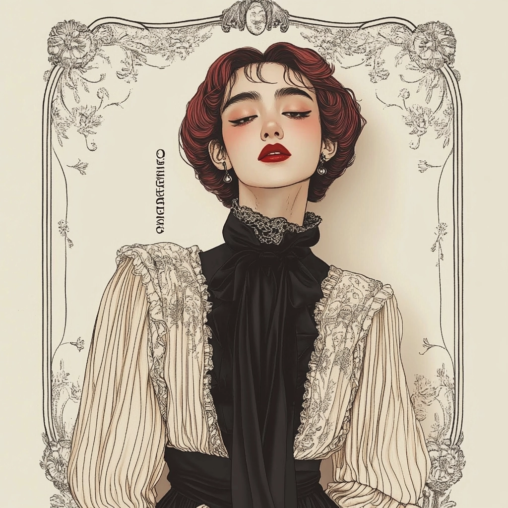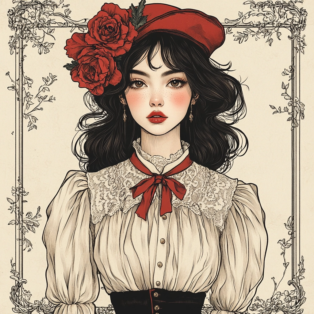 The illustration uses a soft beige backdrop, allowing the deep reds and black details to stand out with a harmonious contrast. The lace and floral elements are enhanced by delicate line work, giving a tactile quality. This results in a sophisticated spatial composition enriched by articulated ornamentation.
