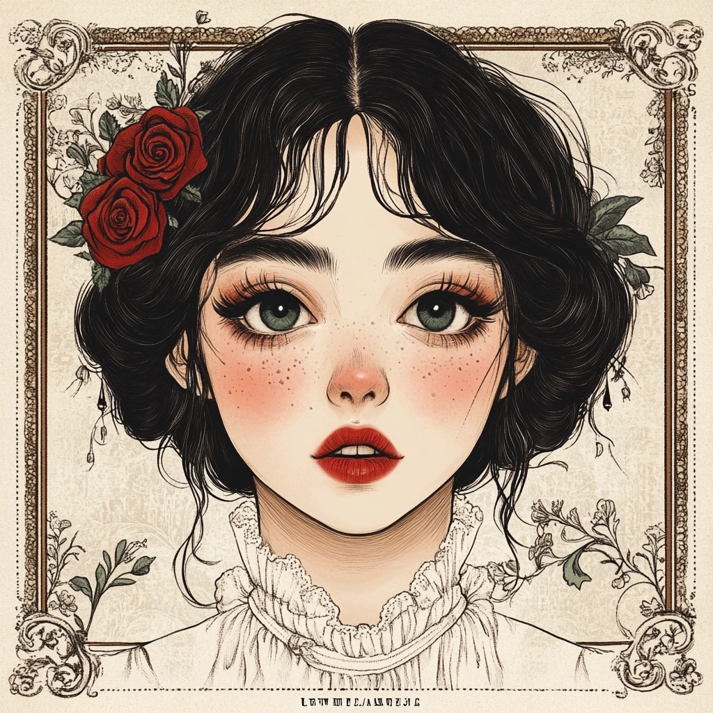 The design features detailed floral and lace motifs with an emphasis on vintage textures and intricate line work.