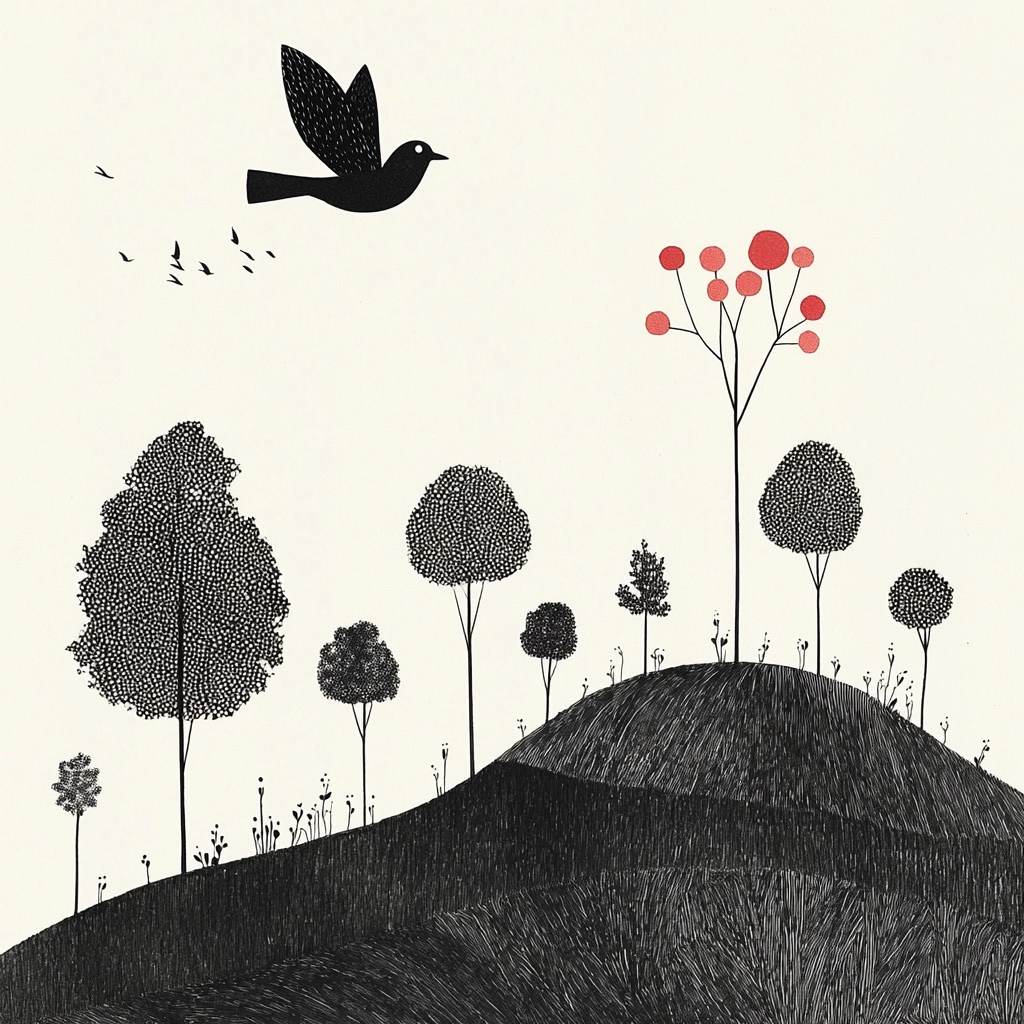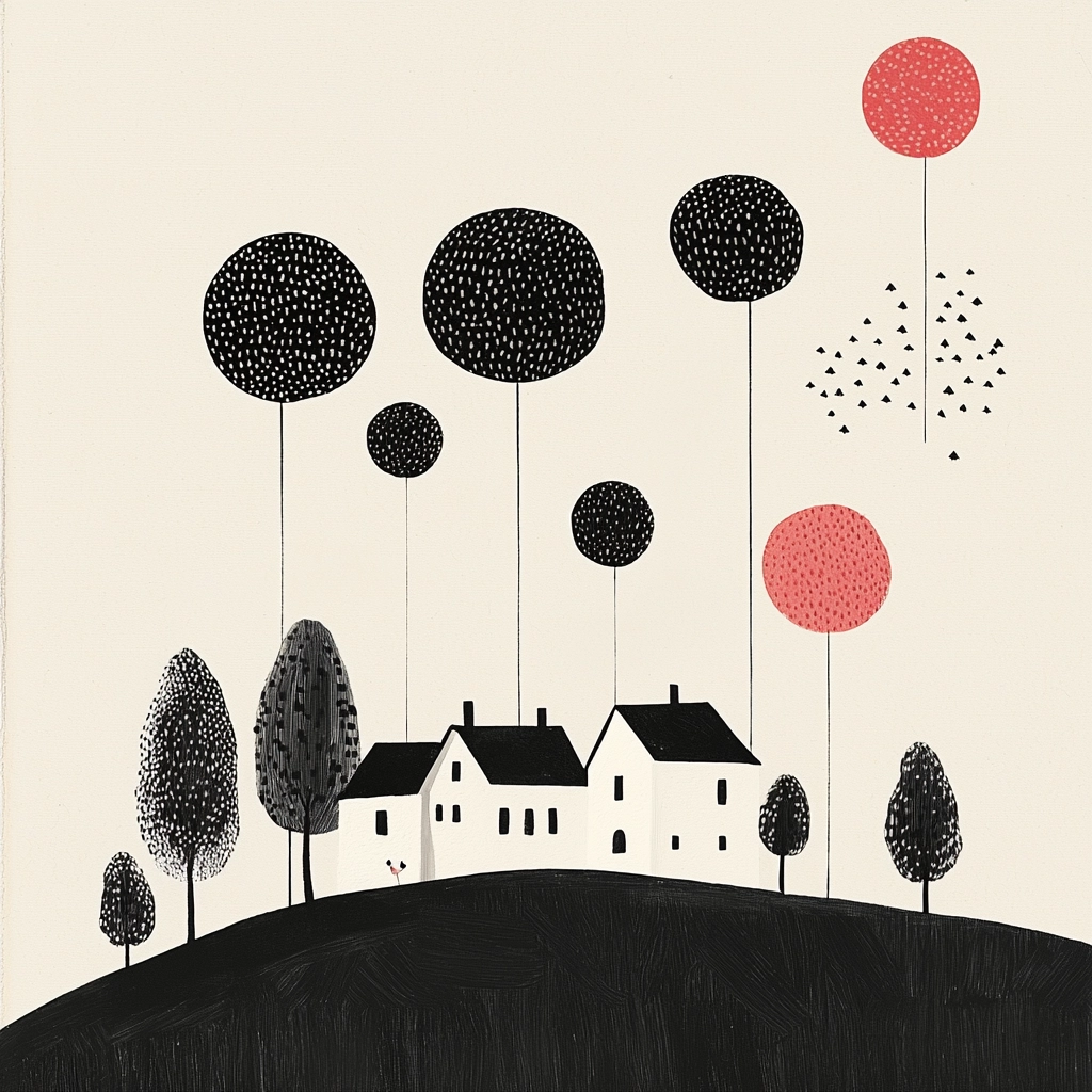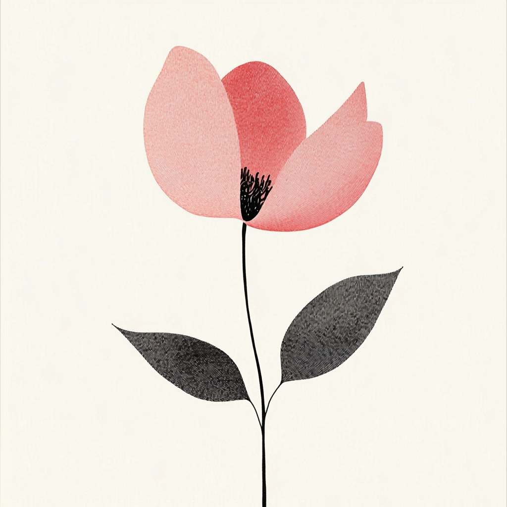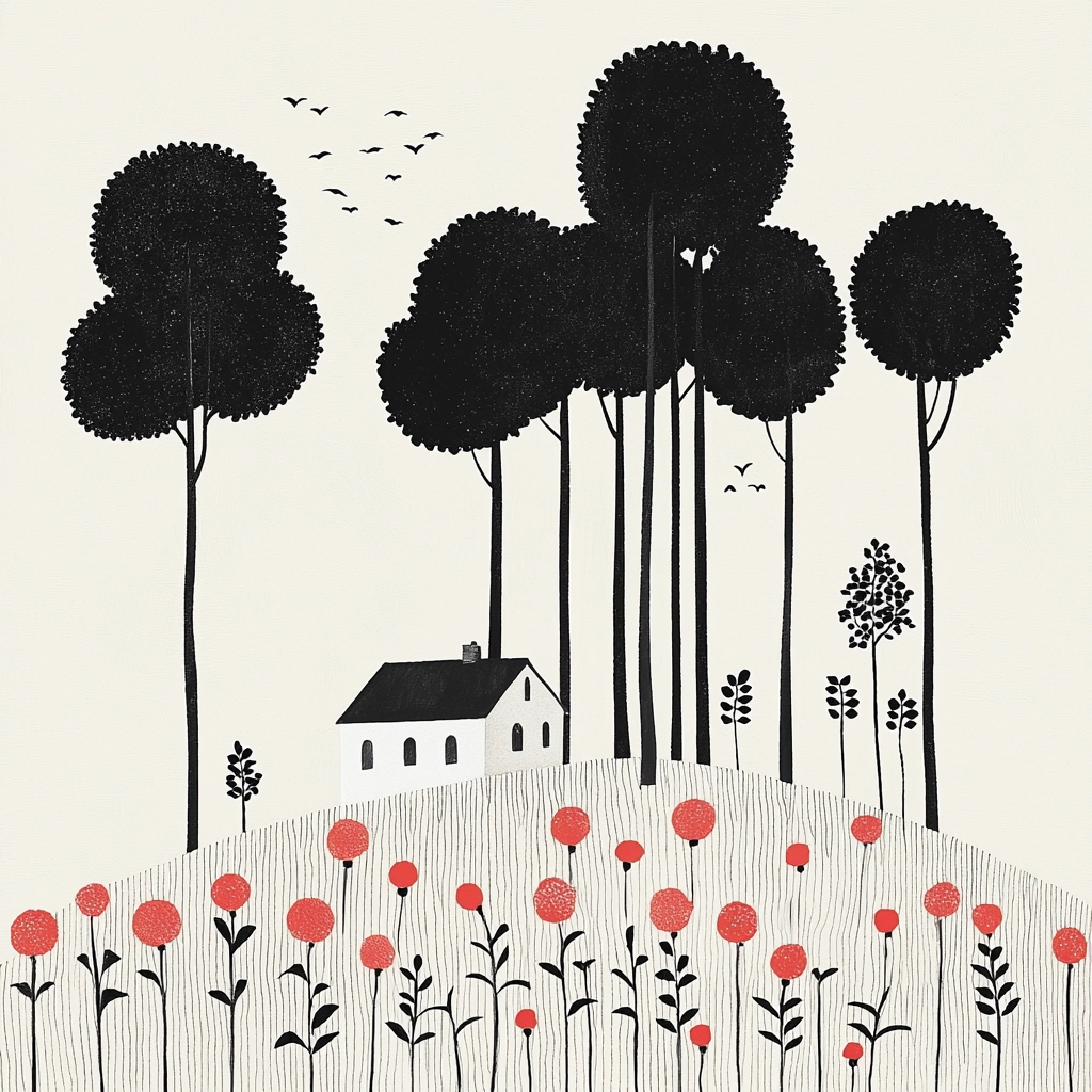 Uses a delicate balance of stark black and white tones contrasted with vibrant red accents. Shapes are simplified to their basic forms, creating a geometric sense of space. Texture is minimal yet precise, distinguishing soft reds from the sharp blacks.
