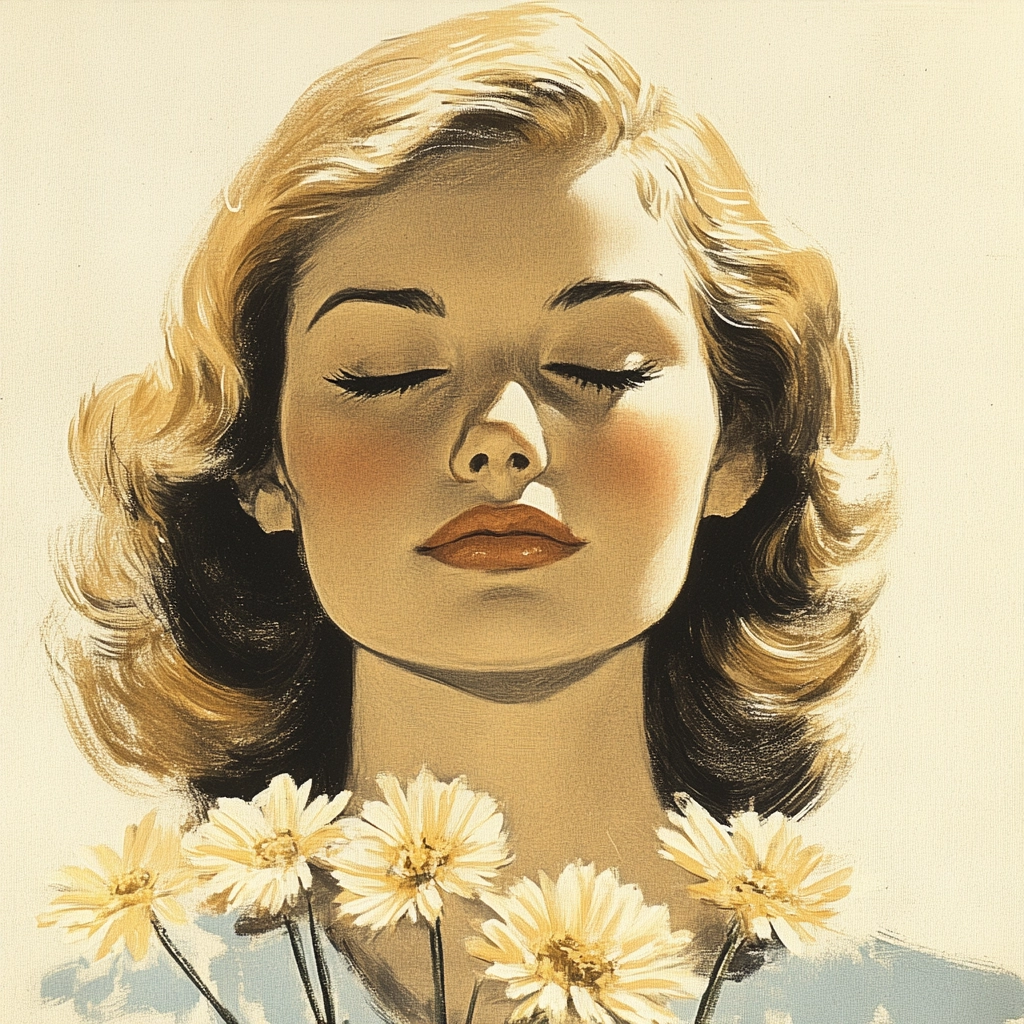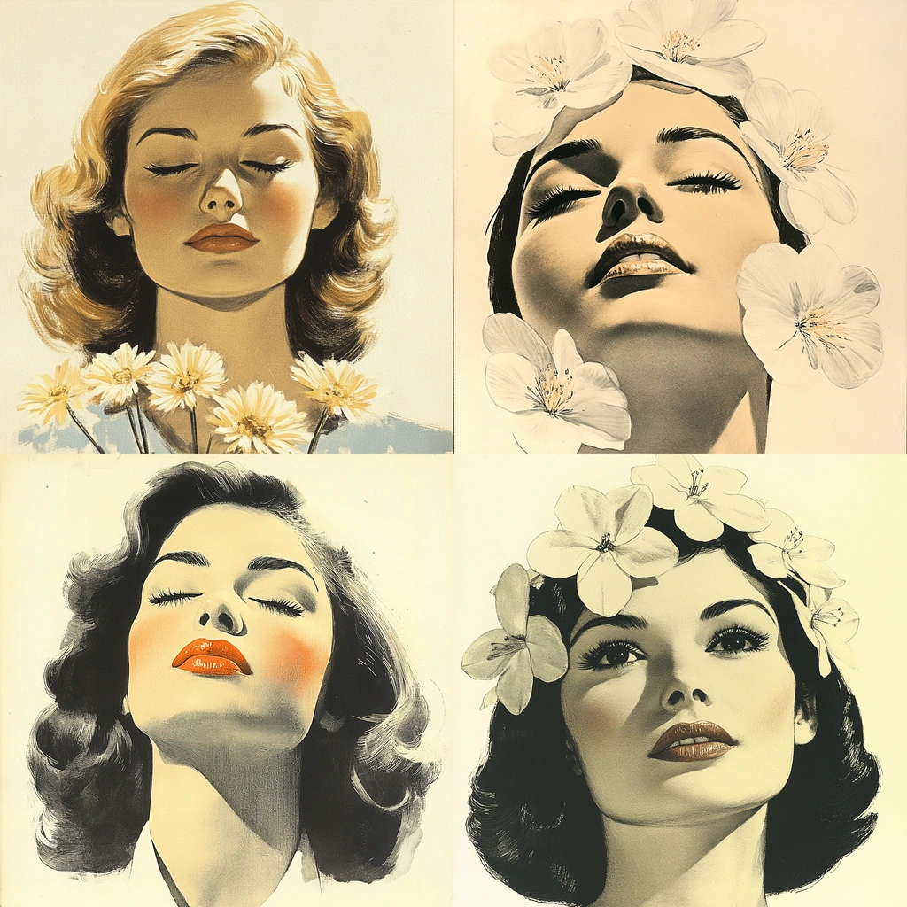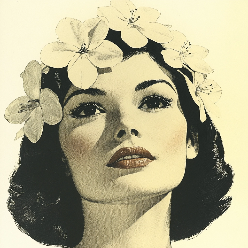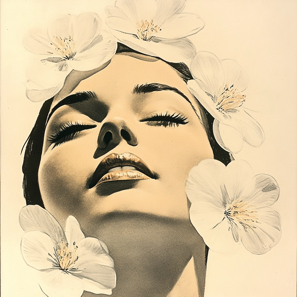 The composition uses beige and black to create subtle contrasts, offering a vintage feel. Floral motifs add texture, with clear lines enhancing separation between elements, suggesting an interplay of space and form.
