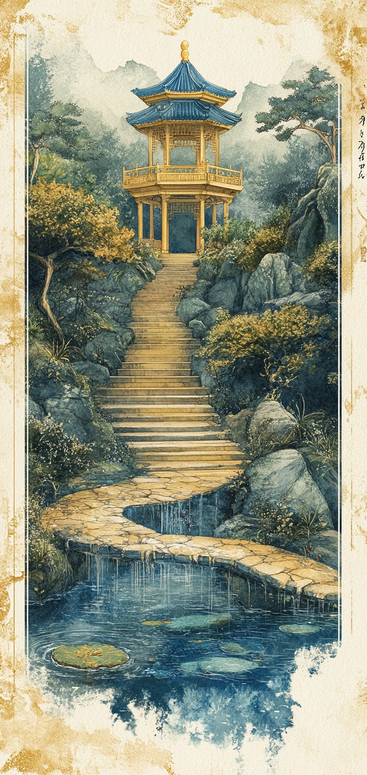 The interplay of warm gold with cool blue creates depth and dimensionality, with highlights and shadowing enhancing a vintage ambiance. Textural details are accentuated with delicate brushwork.