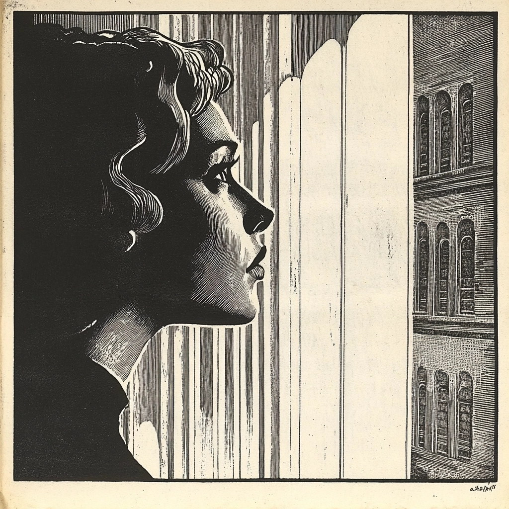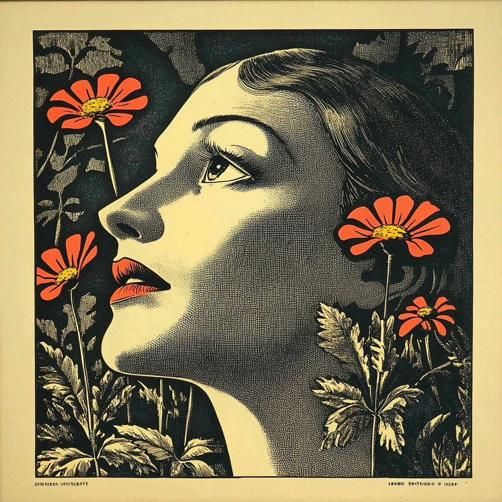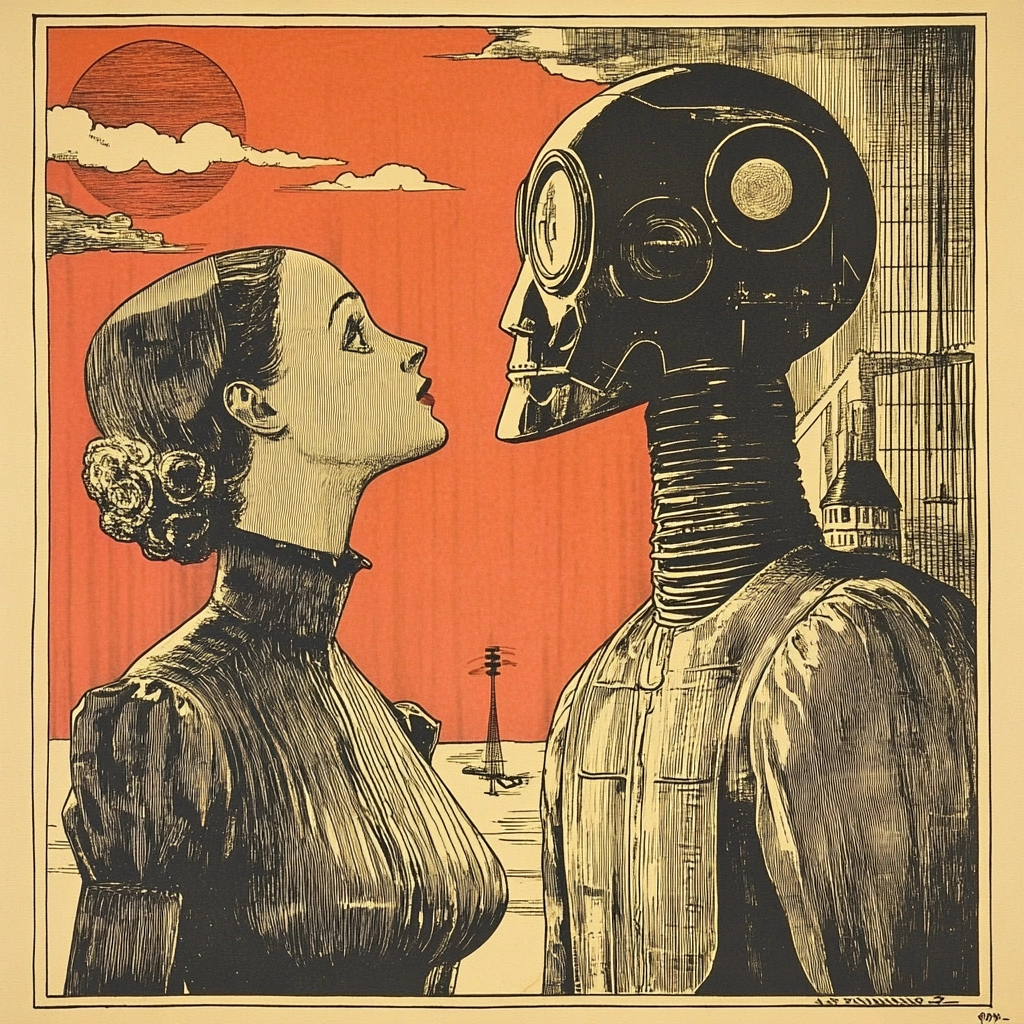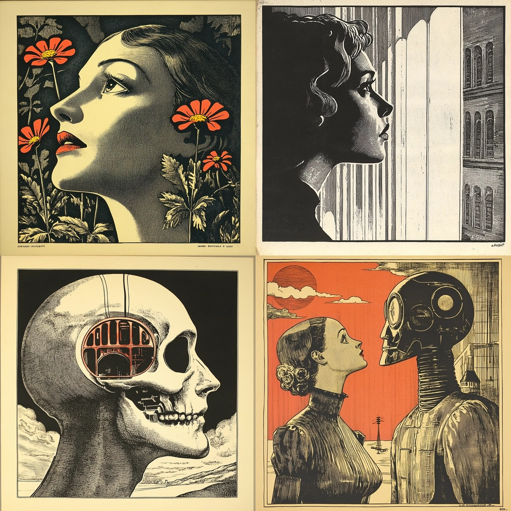 Utilizes a stark black and white palette with strategic, bold splashes of orange, creating contrast and drawing attention. The compositions exhibit detailed line work and a focus on crisp mechanical textures, layered with subtle depth and shadow to enhance spatial perspectives.
