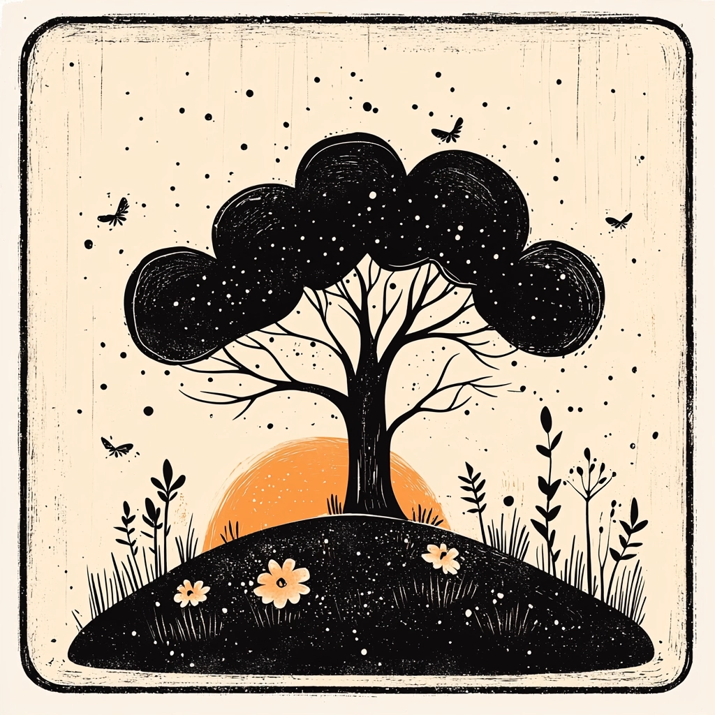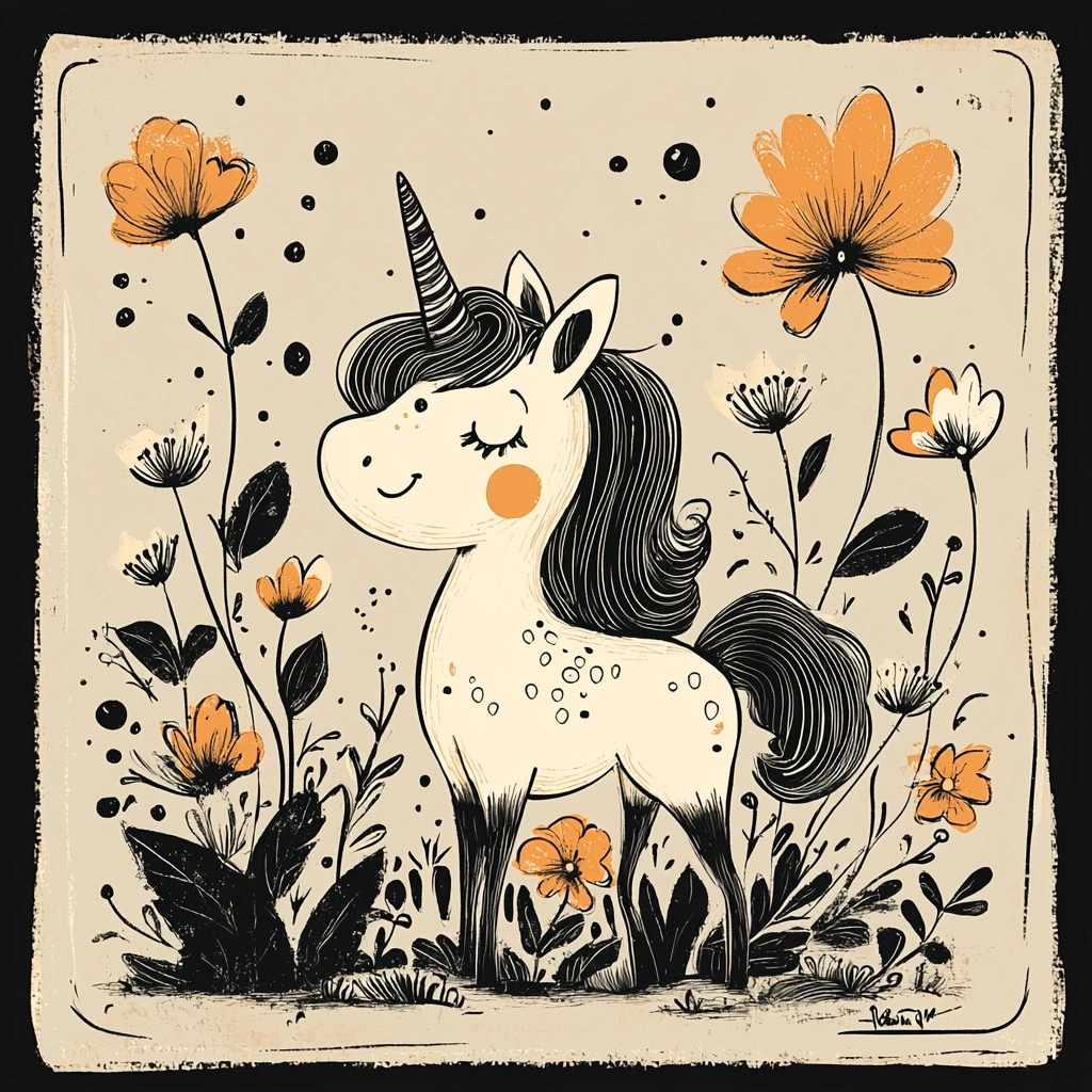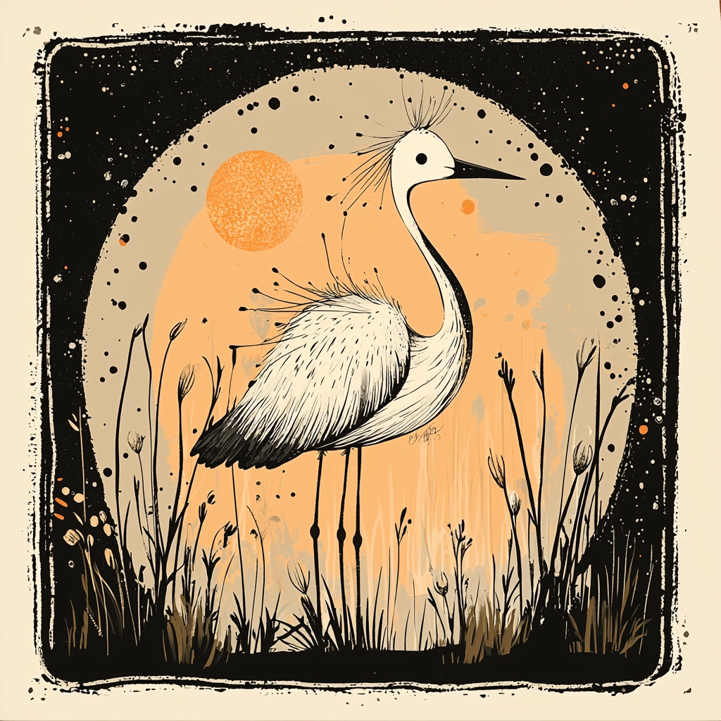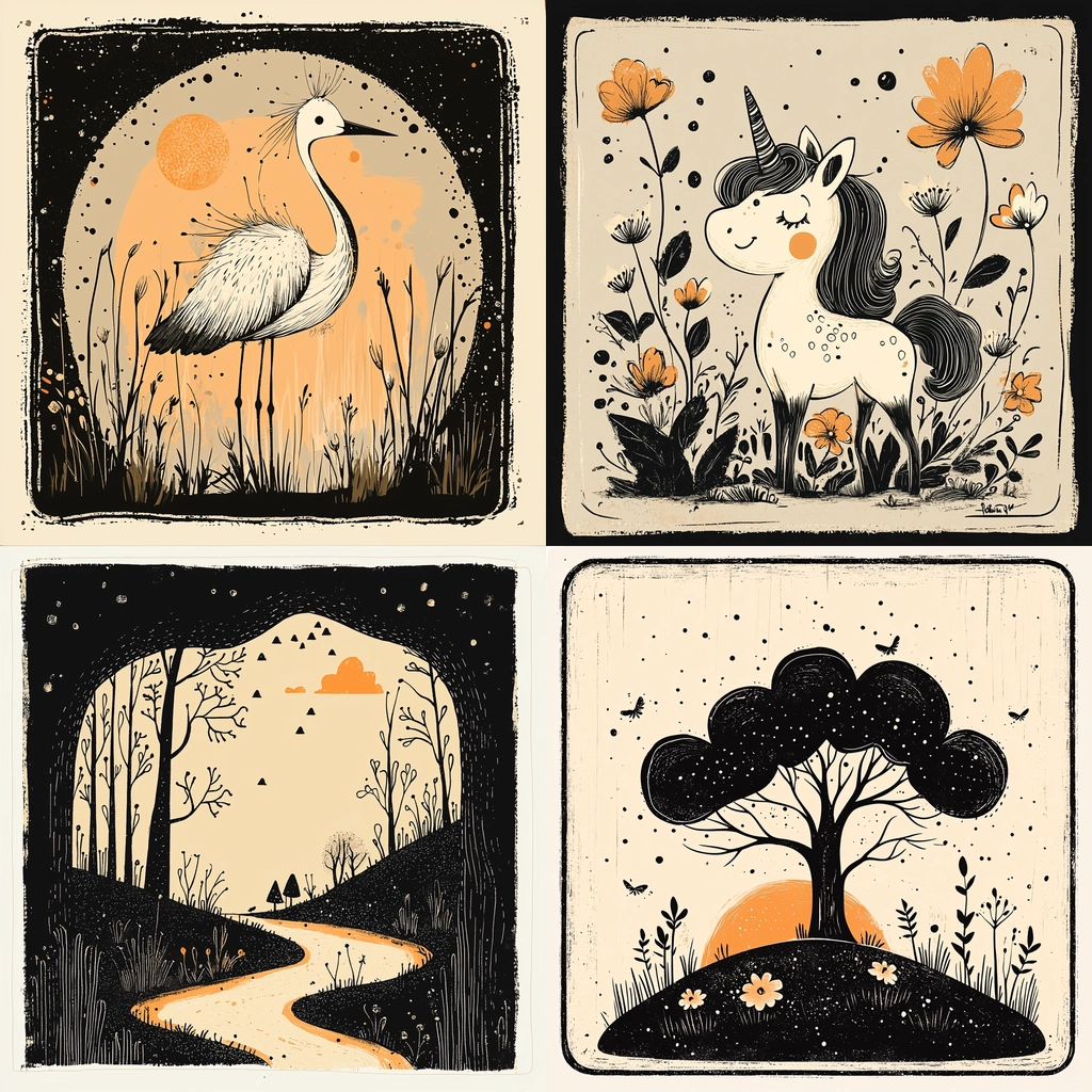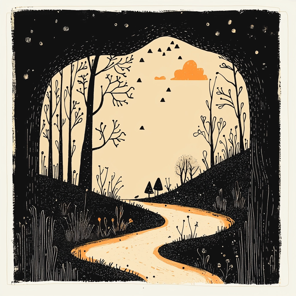 The lighting is subtle, with contrasts mainly arising from the use of black outlines. Orange serves as a focal highlight against a beige backdrop. The sense of space is defined by delicate line work, creating a balance between filled and open areas, and the texture appears smooth yet illustrative.