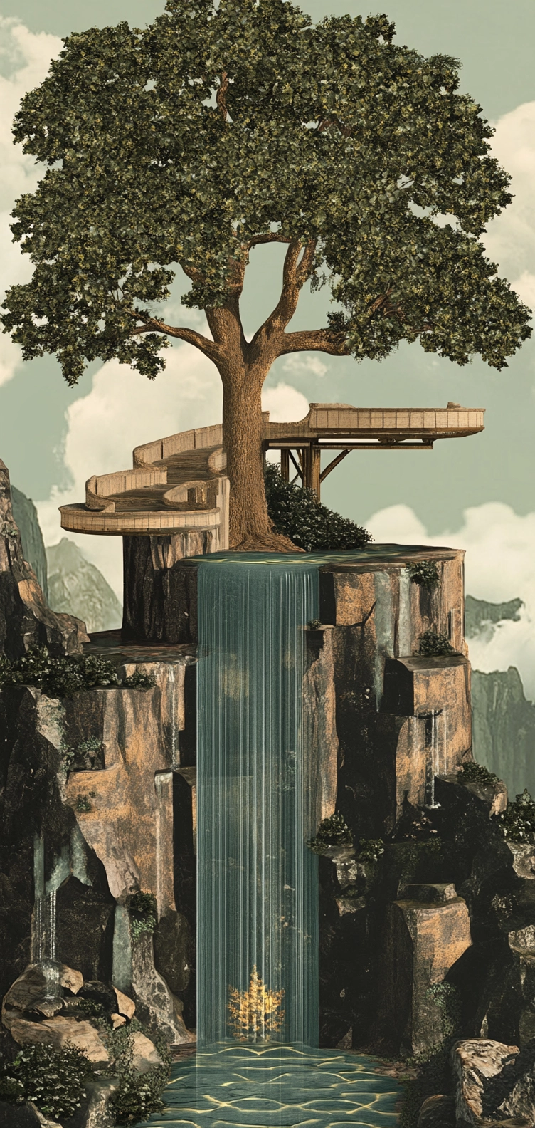 This piece employs a harmonious blend of earthy and cool tones, creating a tranquil presentation with balanced composition featuring intricate details.