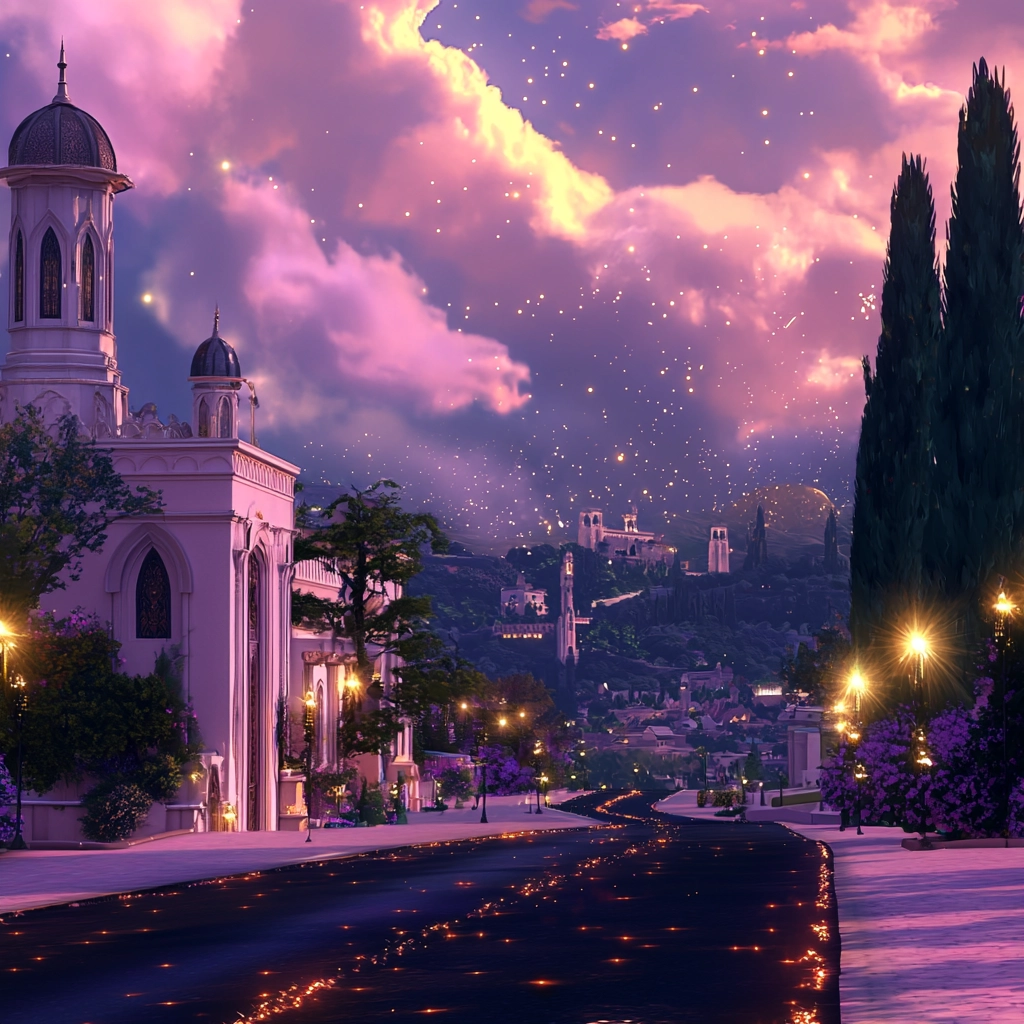 The scene uses rich purples and golds throughout with a focus on atmospheric lighting effects for visual impact.