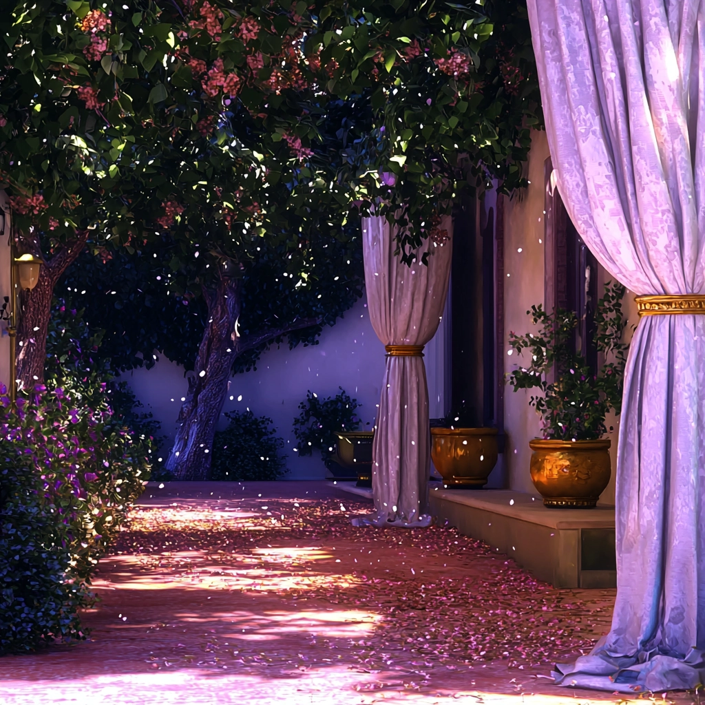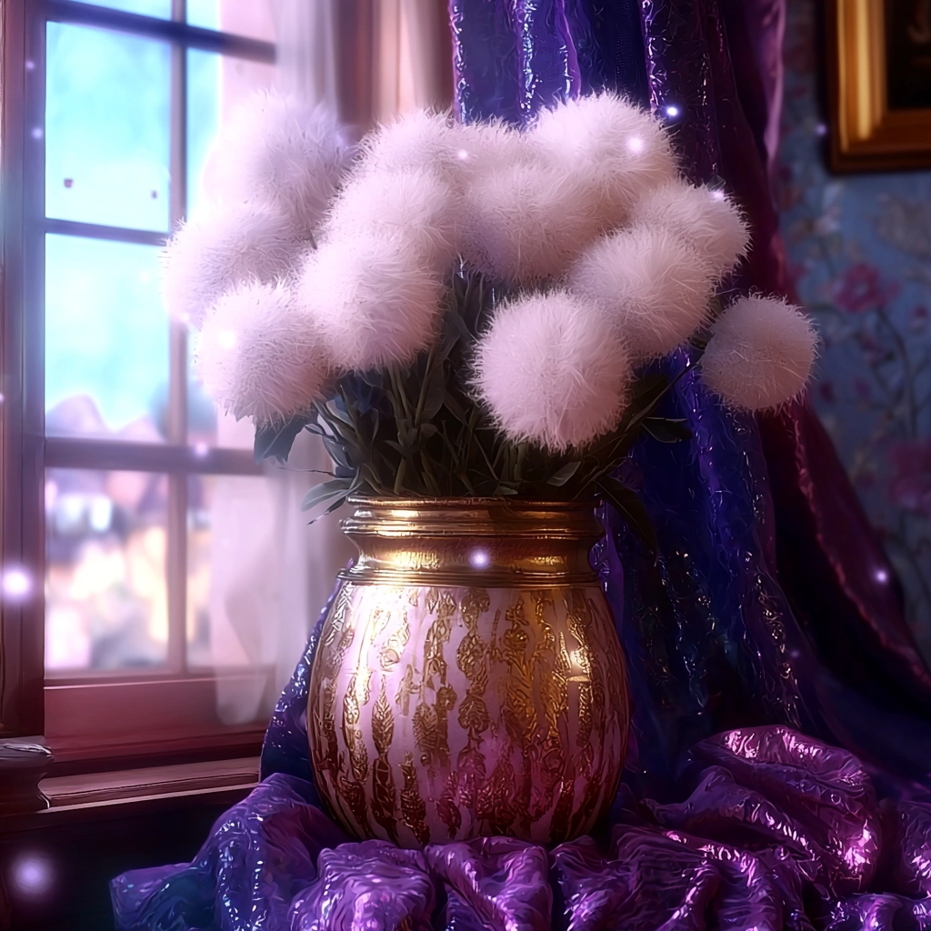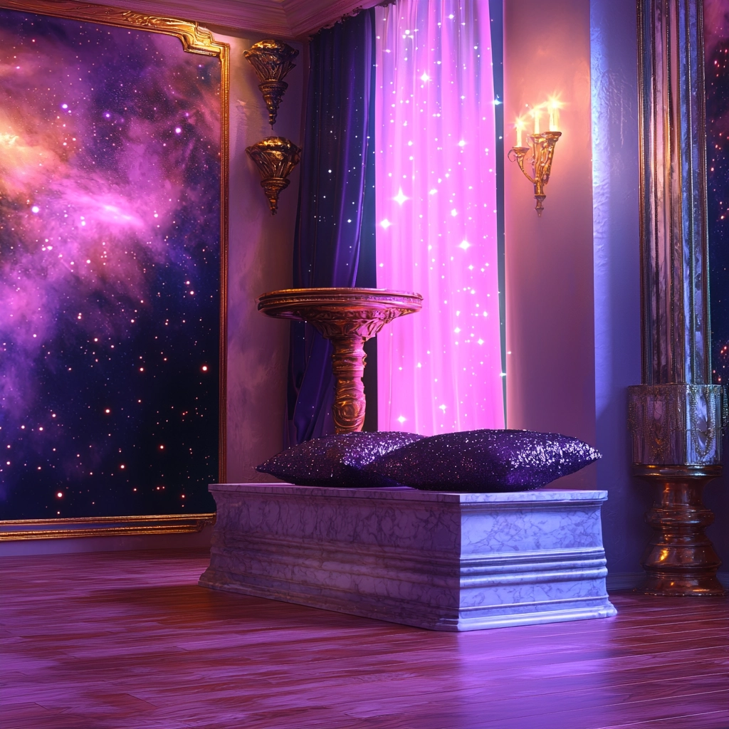 Soft lighting casts a delicate glow across varied textures, creating depth with luminous reflections. The interplay of purple hues enhances a layered aesthetic. The spatial arrangement allows light to guide the eye seamlessly, emphasizing detail with shimmering gold accents.