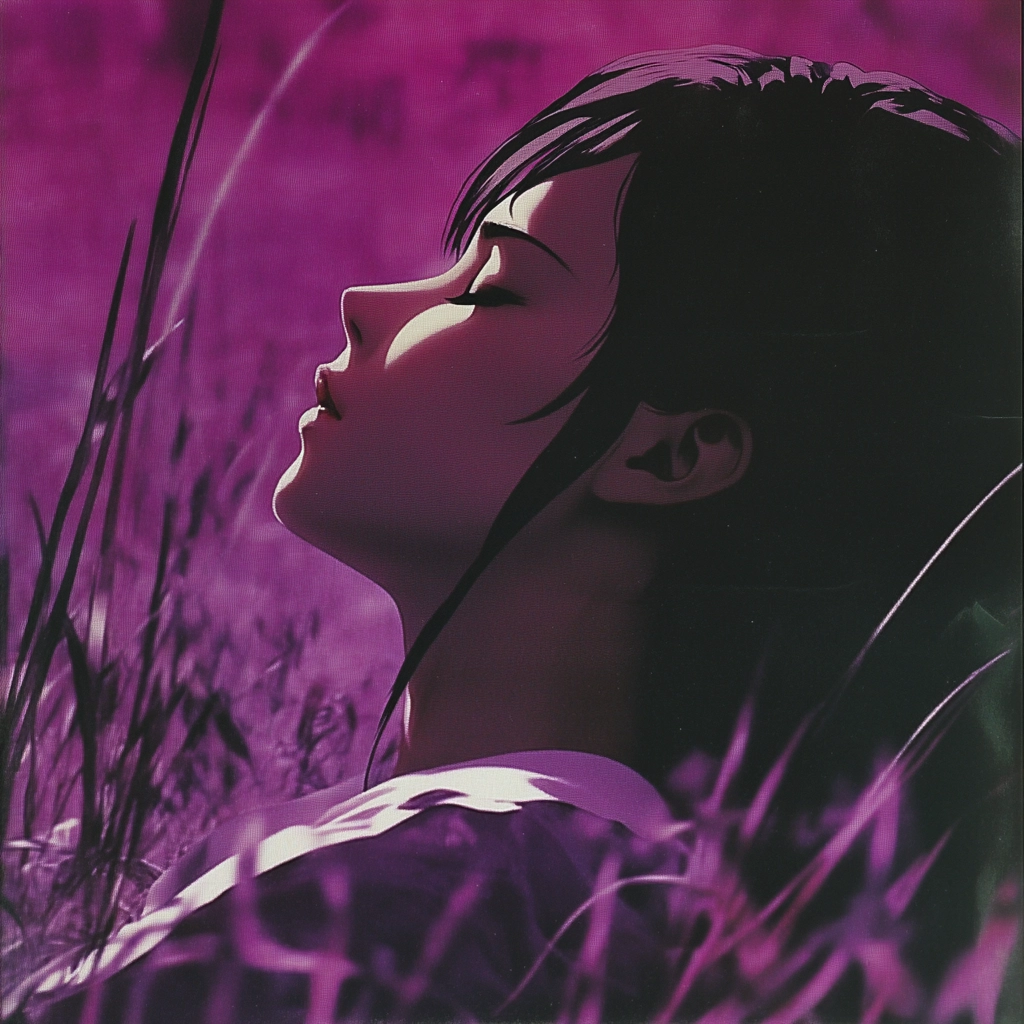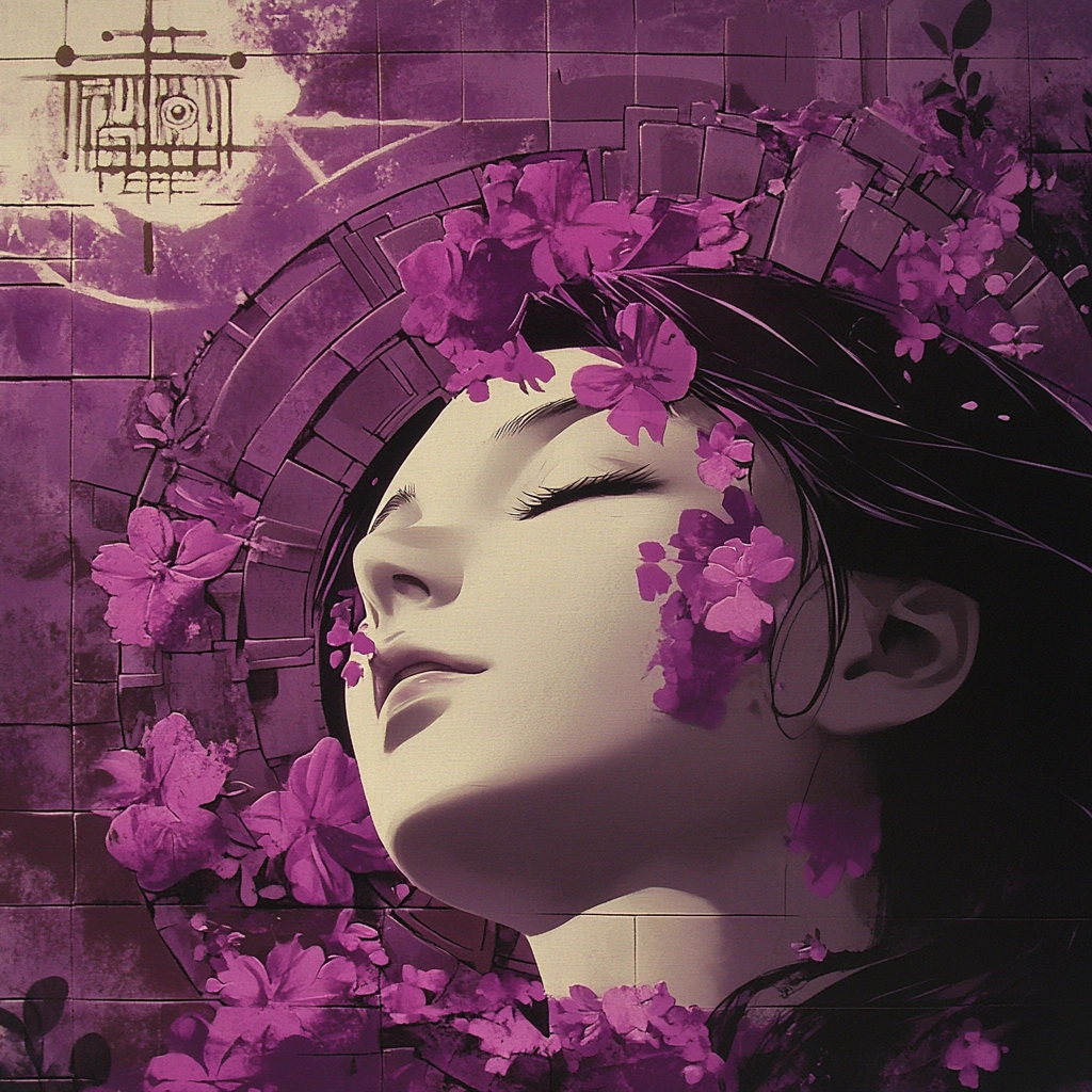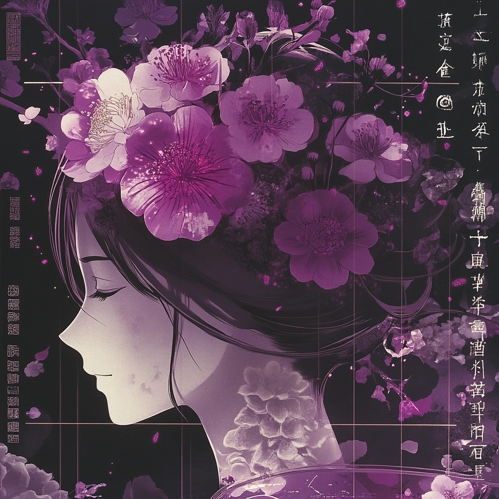 The usage of lighting accentuates the delicate floral details against a deep purple background, creating a strong spatial dimension. The textures range from the smoothness of digital rendering to the nuanced softness of hand-drawn botanical elements.