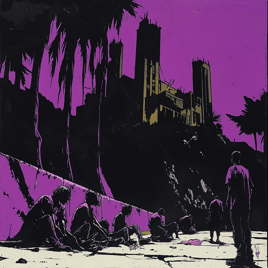 Dominant use of purple against black creates a stark and impactful visual experience.