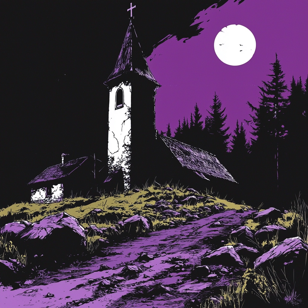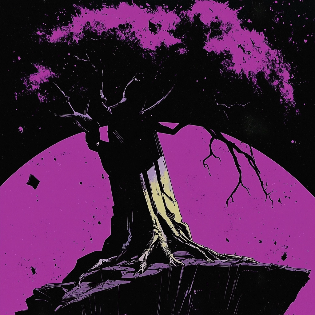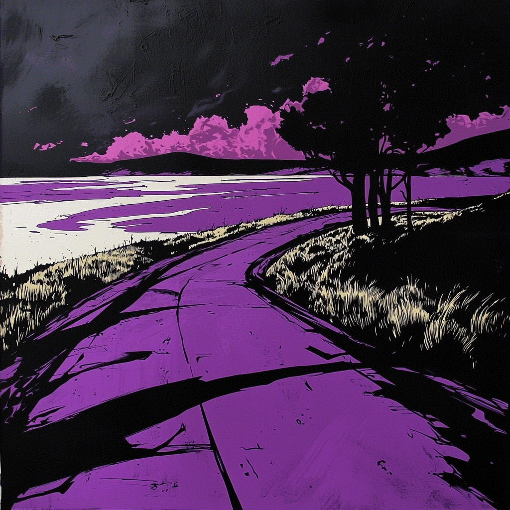 The strong contrast between the dark black and vibrant purple enhances depth, with bold outlines and stark lighting effects contributing to a strong graphic quality, while textures appear smooth yet defined.