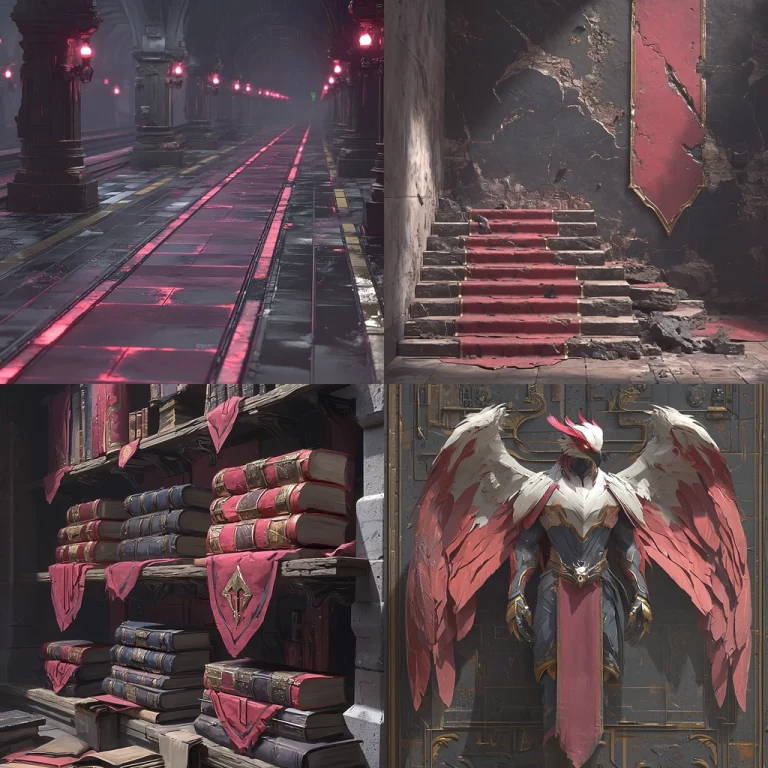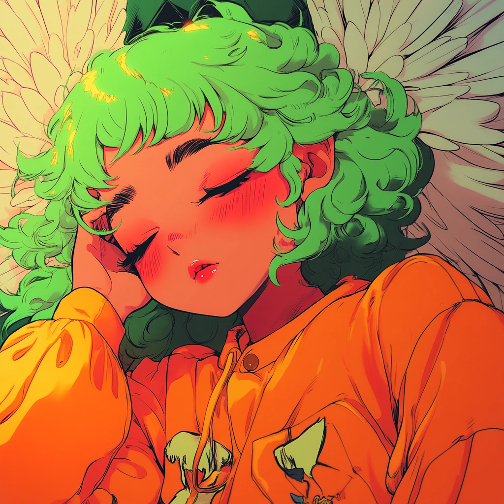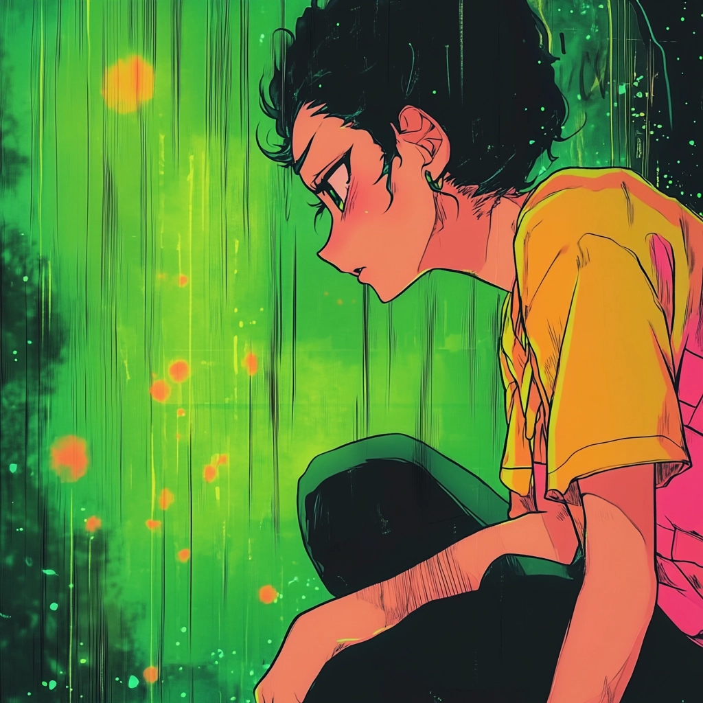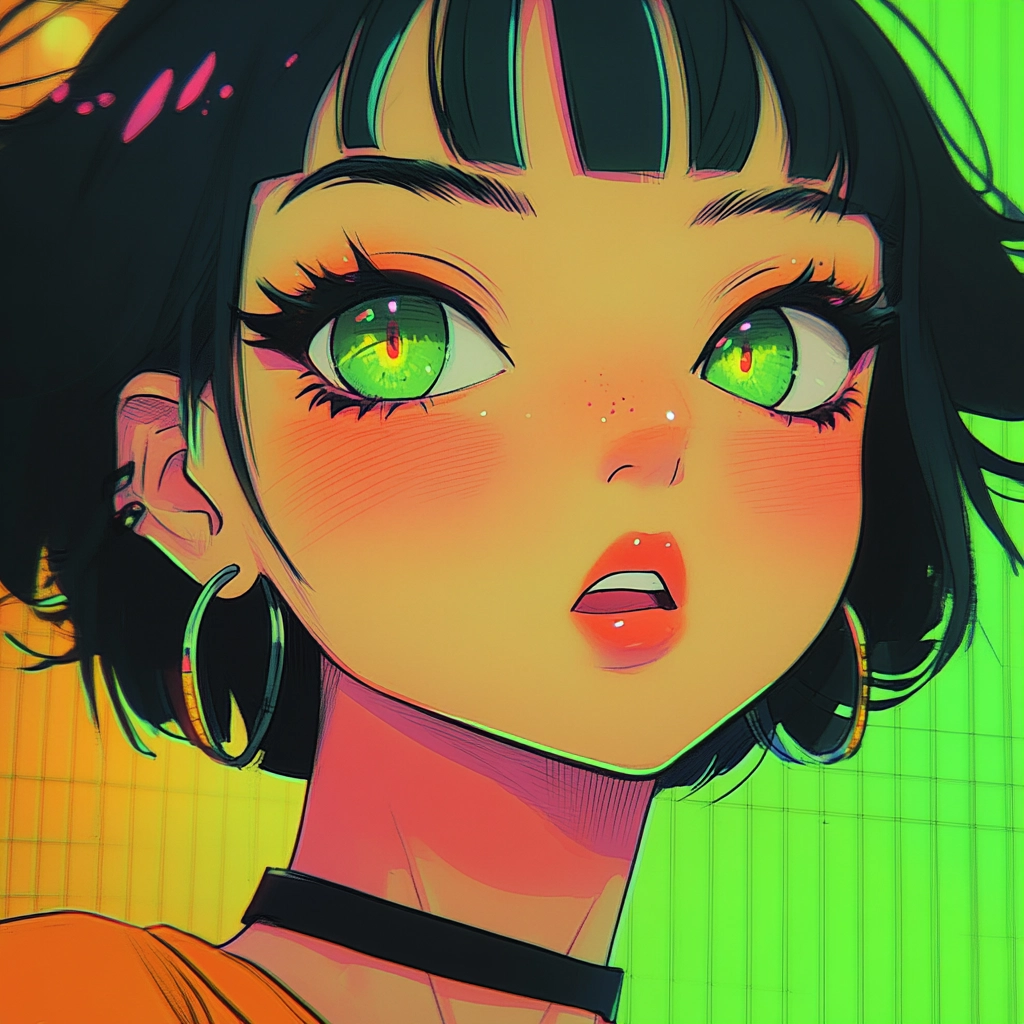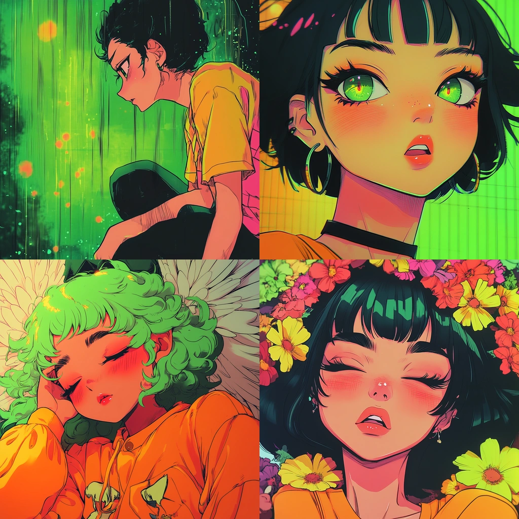 The use of sharp lighting enhances the high contrast between bright green, yellow, and pink tones. The color palette features a strong vibrancy which is accentuated by the use of clean, bold lines and defined textures, providing a clear sense of space.