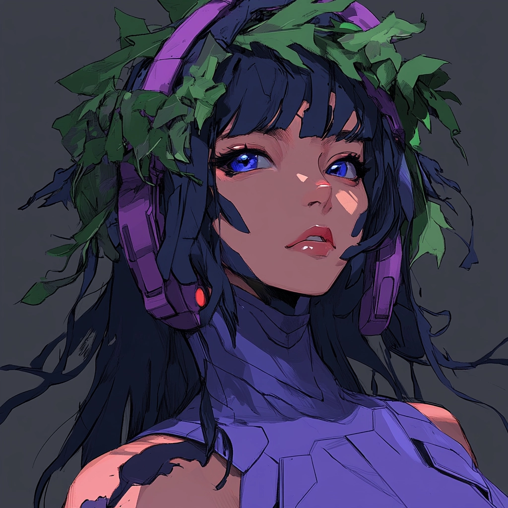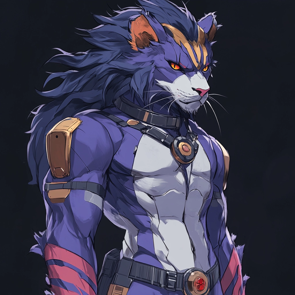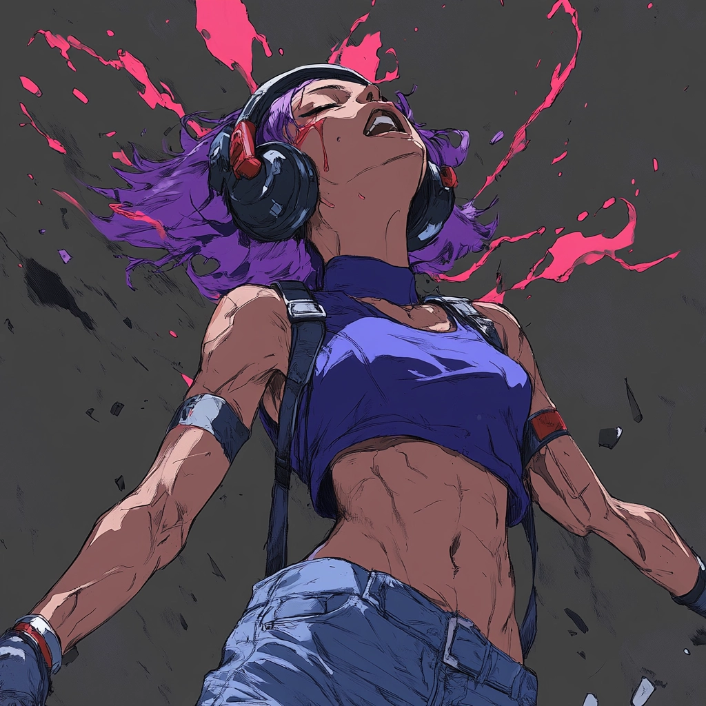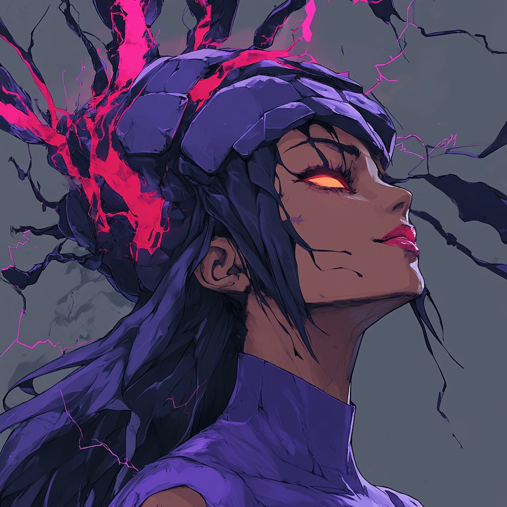 High contrast lighting highlights dynamic poses and expressions, while the use of vibrant purple and pink provides a sense of movement. Textures are meticulously rendered, offering a tactile feel, with neon accents enhancing the striking visual impact.