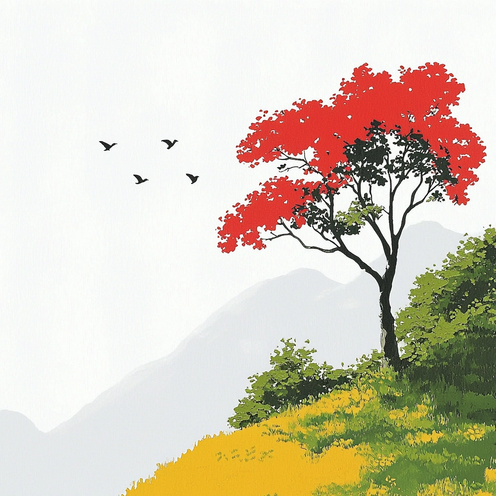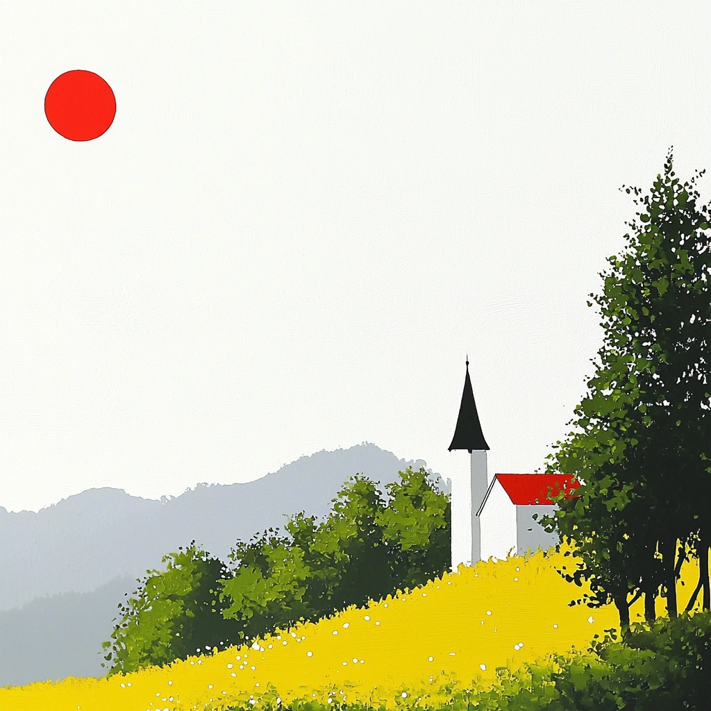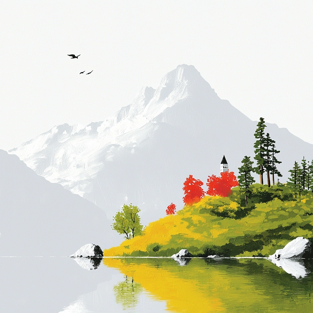 Strong lighting brings out dynamic contrast between shadows and highlights, while vibrant hues enhance the spatial balance. Crisp yet softened lines contribute to the atmospheric depth, and textured brushstrokes add visual interest.