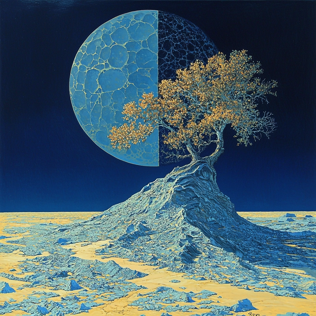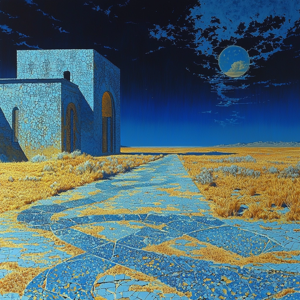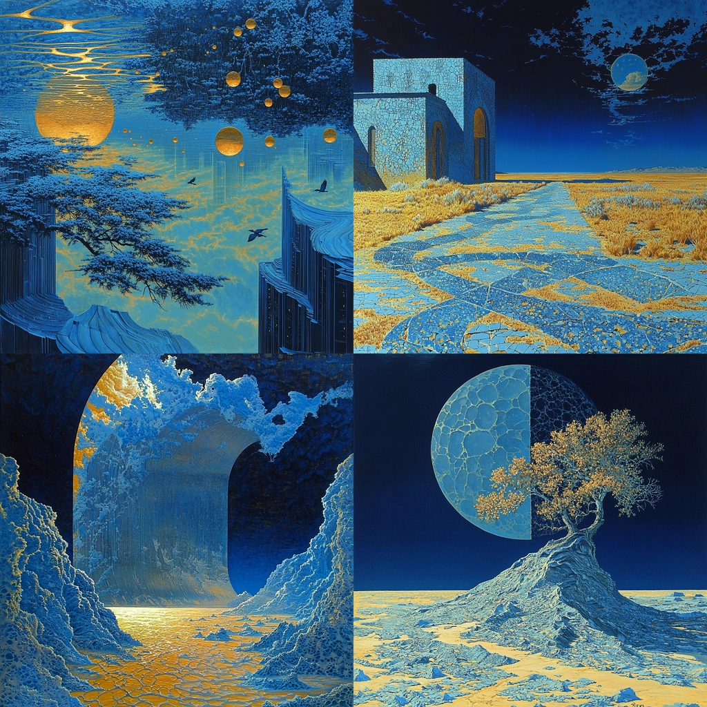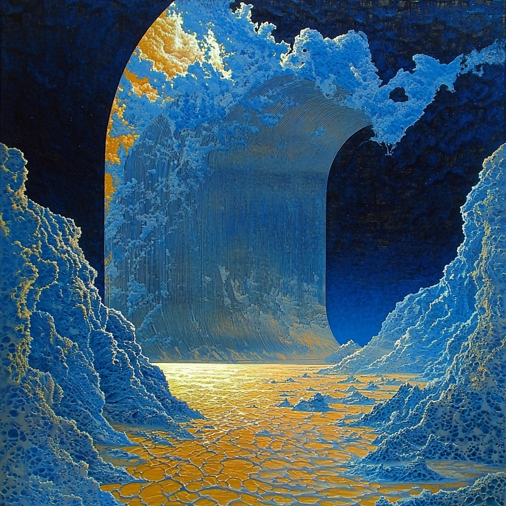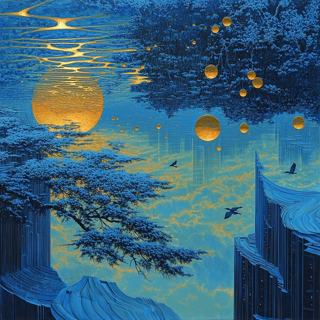 The lighting enhances the contrast between the deep blue and radiant gold, giving a three-dimensional effect. Textures are meticulously detailed, creating a rich visual experience. The spatial arrangement is dynamic, emphasizing depth and perspective play.