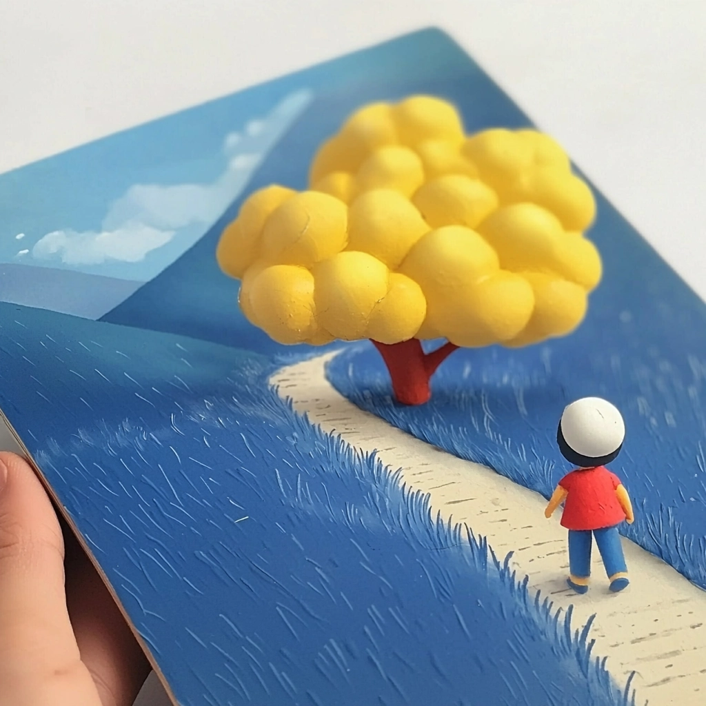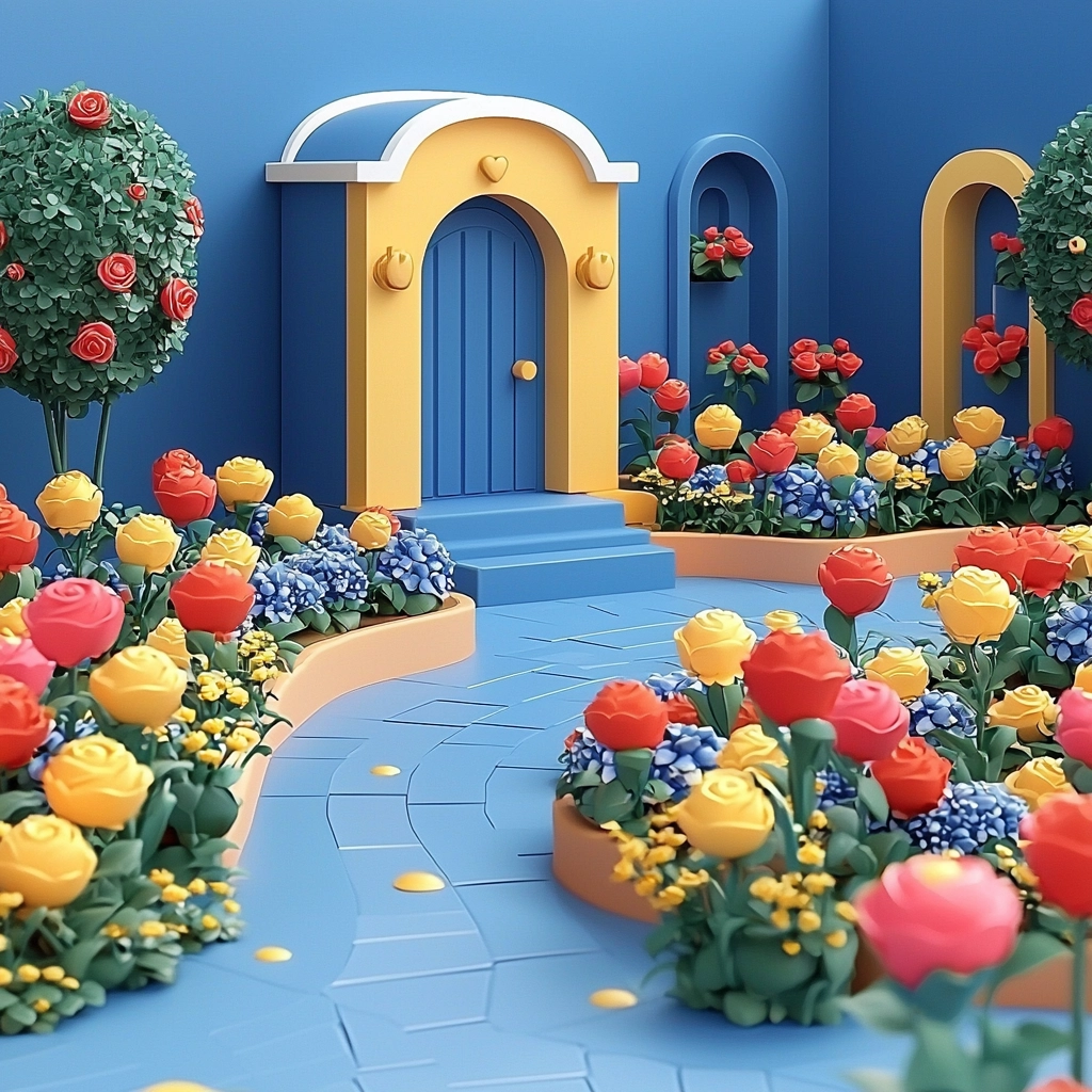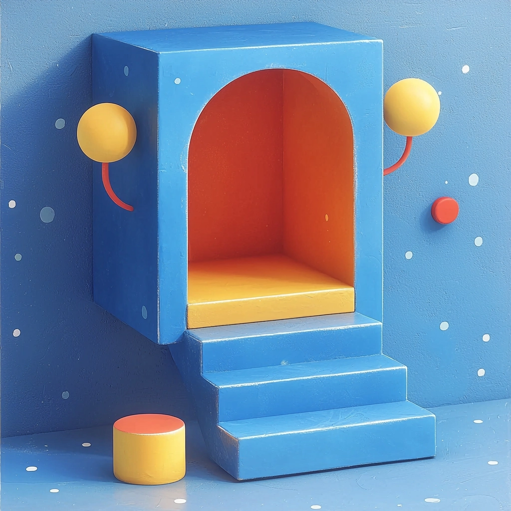 The lighting is flat with consistent brightness, enhancing the boldness of primary colors. Spatial arrangement is simple and organized, while textures are smooth with minimal variation, contributing to a streamlined aesthetic.