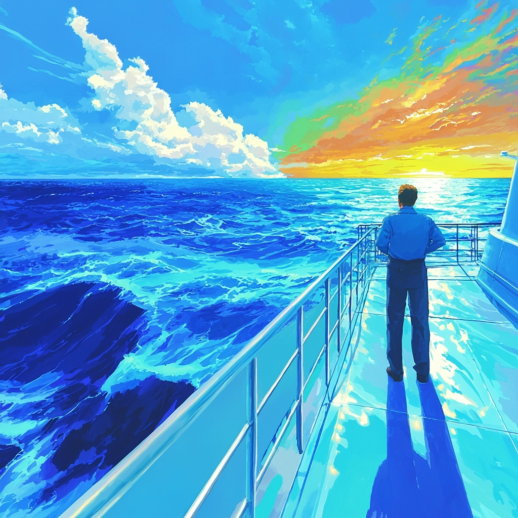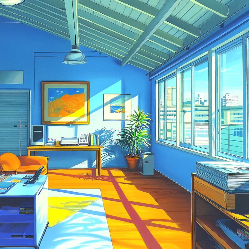 A vibrant blend of saturated blues and greens highlights sunlit sceneries.