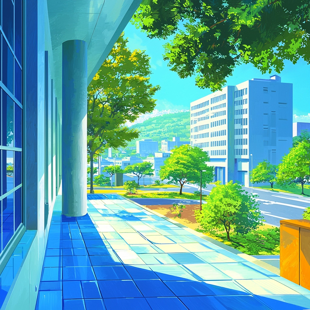 Bright sunlight creates dynamic shadows and highlights, with rich blues and greens conveying depth and atmosphere. Textures are crisp and clean, illustrating a clear sense of space and proportion within the depicted environments.