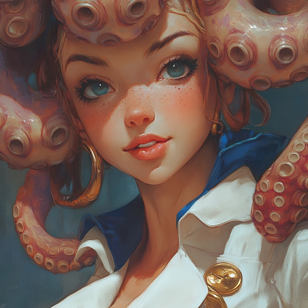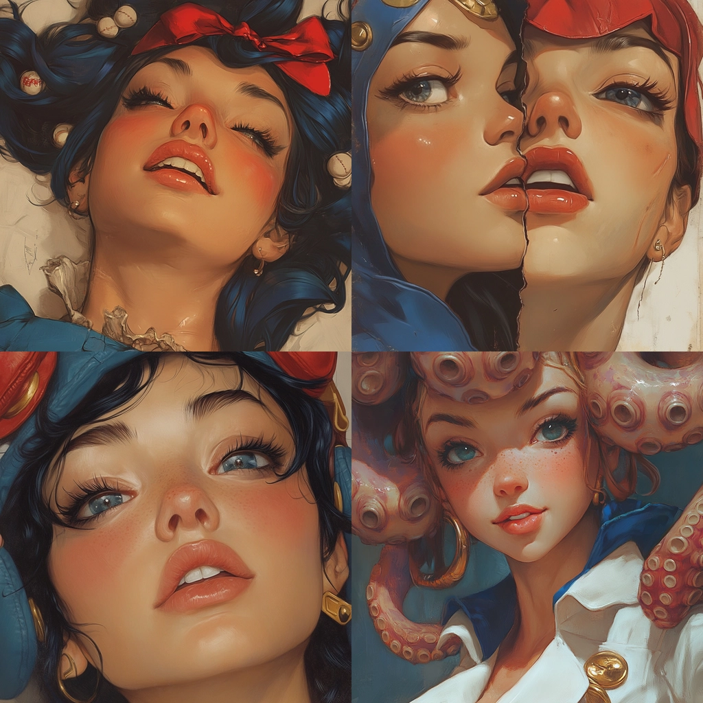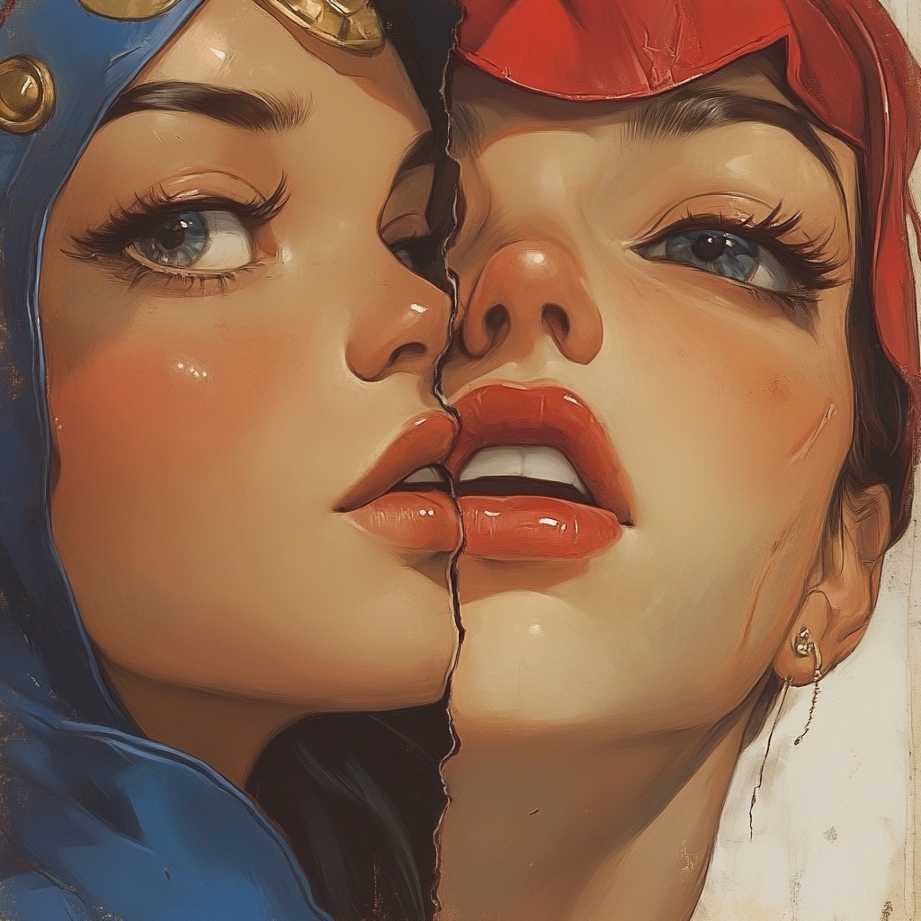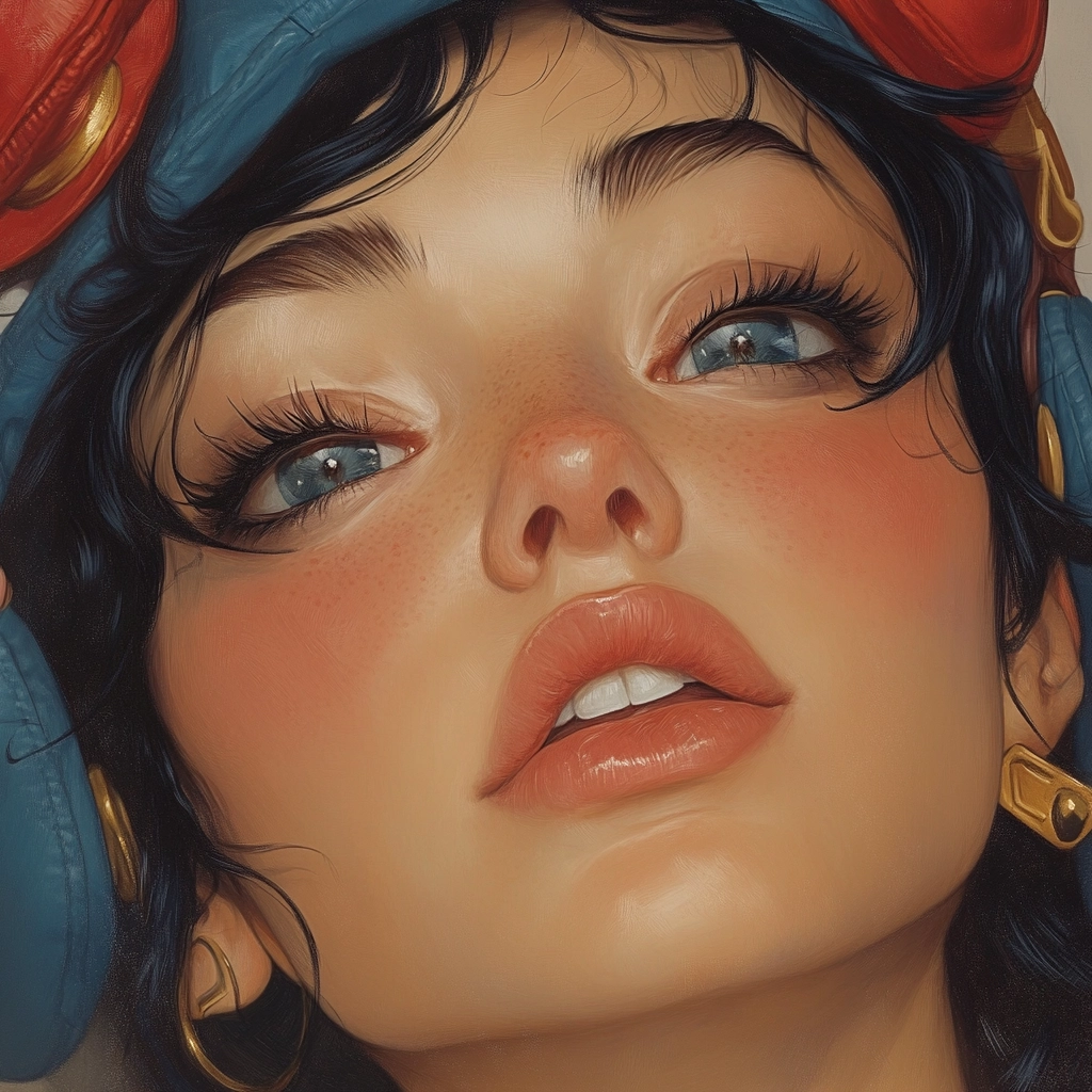 The use of strong lighting accentuates the vivid blue and red colors, creating a dynamic depth. Textures are presented with smooth transitions, and a sense of volume is achieved through delicate shading and fine details.