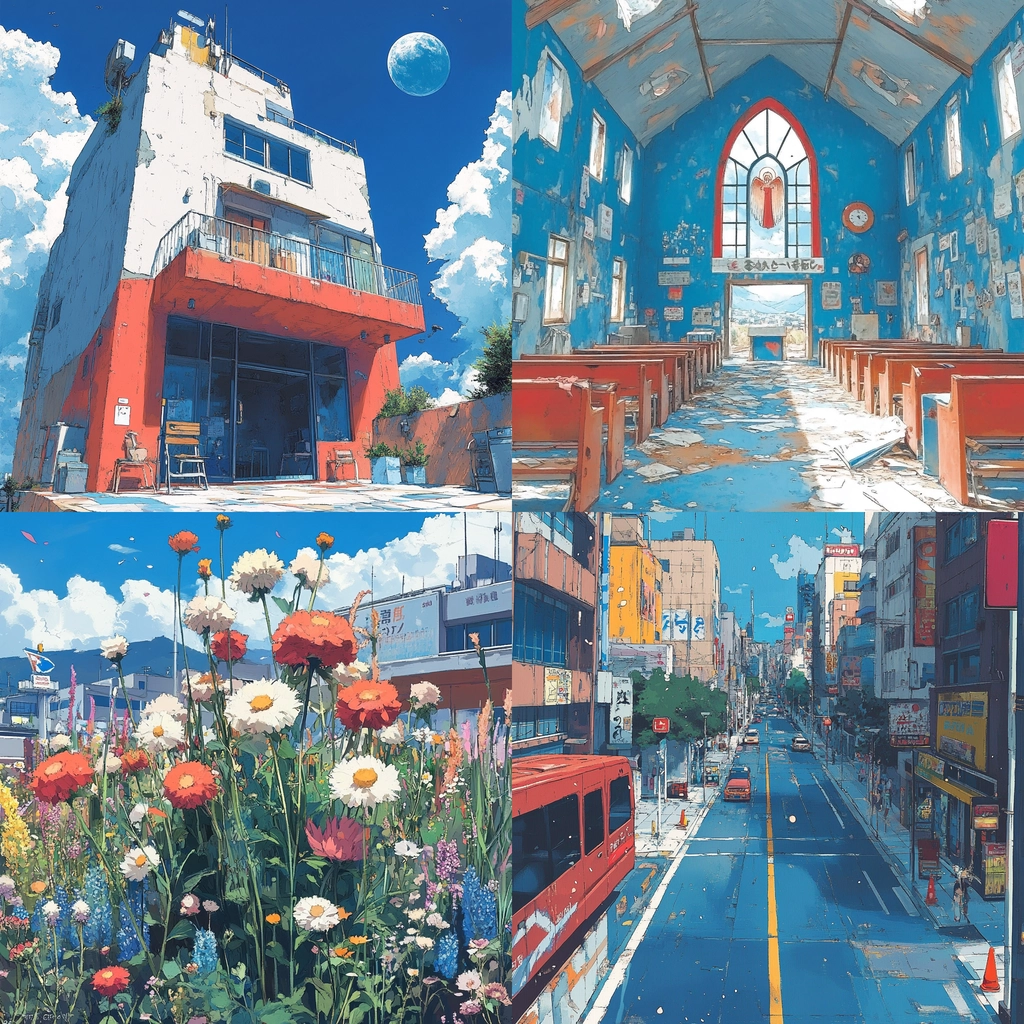 The artwork features detailed architectural compositions with vibrant colors creating a clear spatial definition.