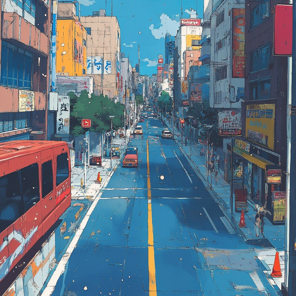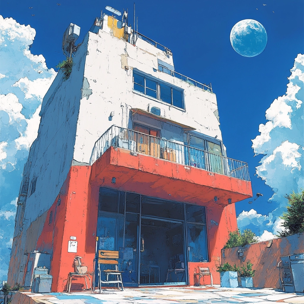 Lighting is crisp and highlights the sharp, distinct structures, with strong contrasts between the vibrant blue sky and saturated red elements. Texture details are finely captured, presenting a vivid interpretation of urban surroundings with meticulous emphasis on form and detail.