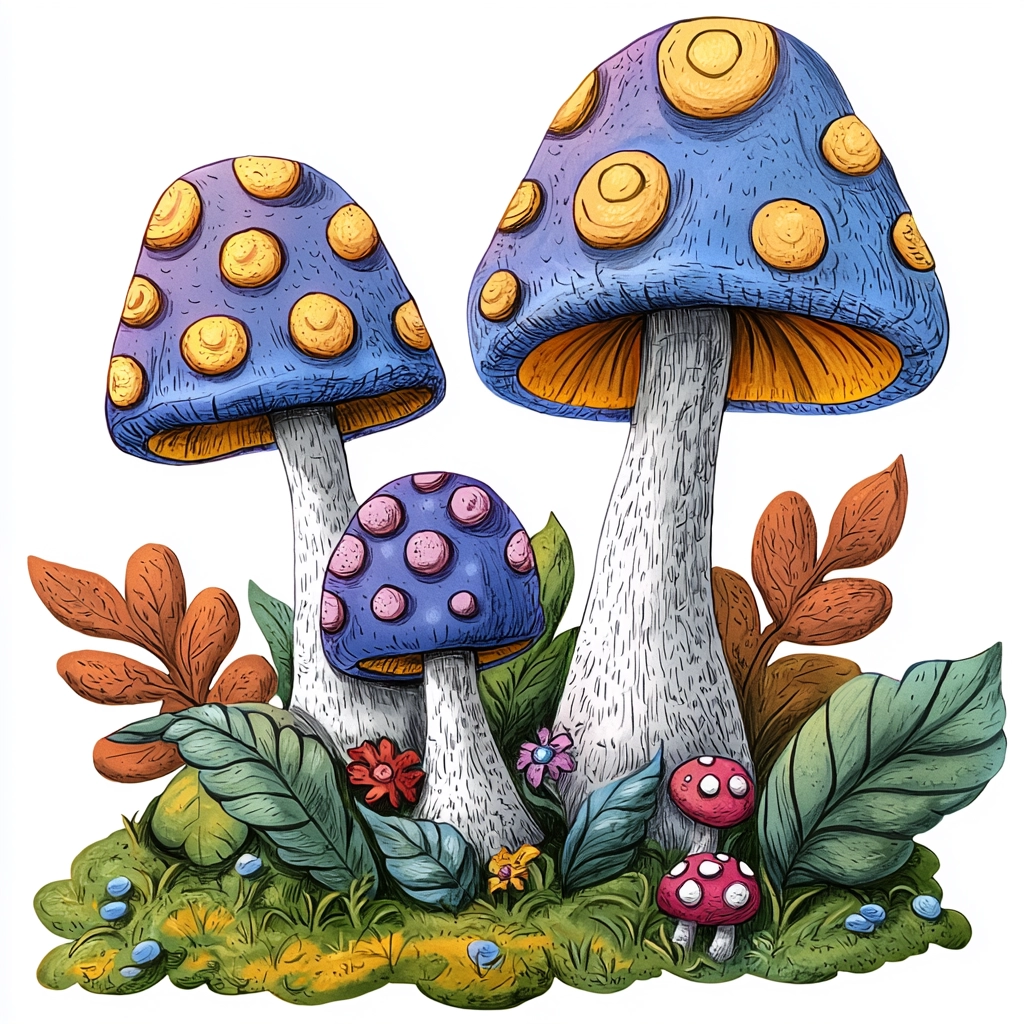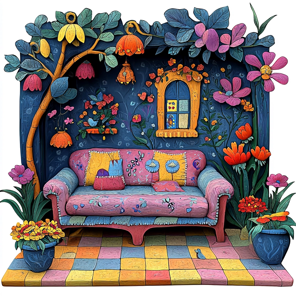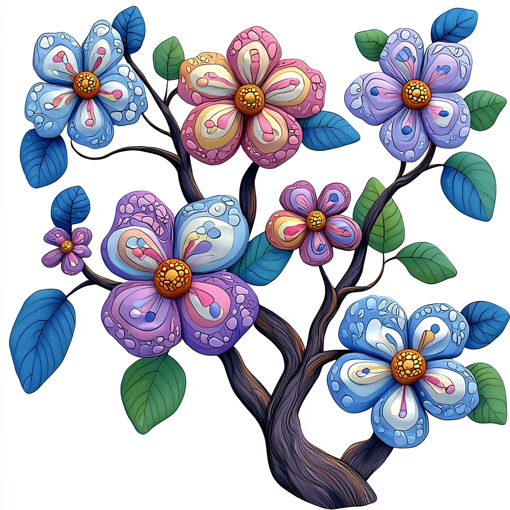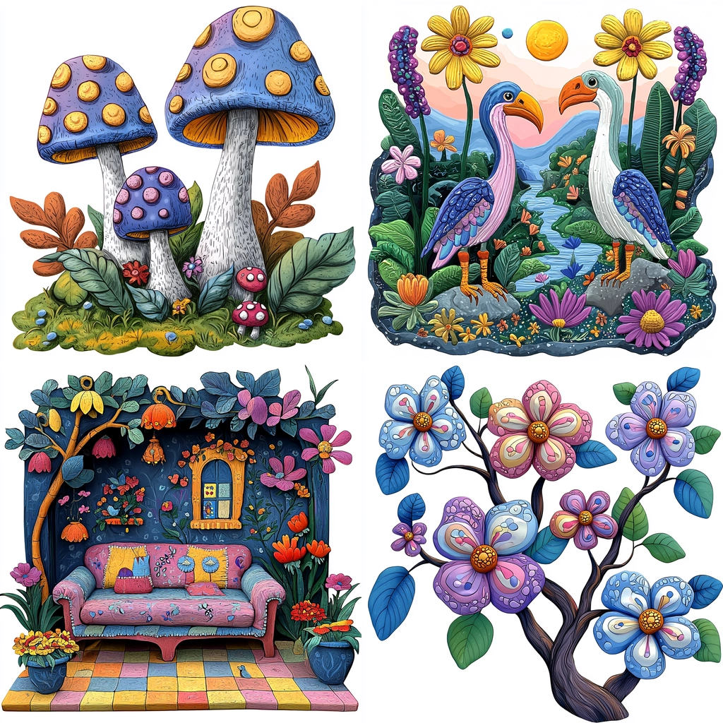 The artwork features strong lighting with clear and bright colors, creating a three-dimensional effect. Textures are pronounced with visible strokes, enriching the tactile sensation of the natural elements. Spatial depth is enhanced by overlapping shapes and gradient shading, adding visual interest.