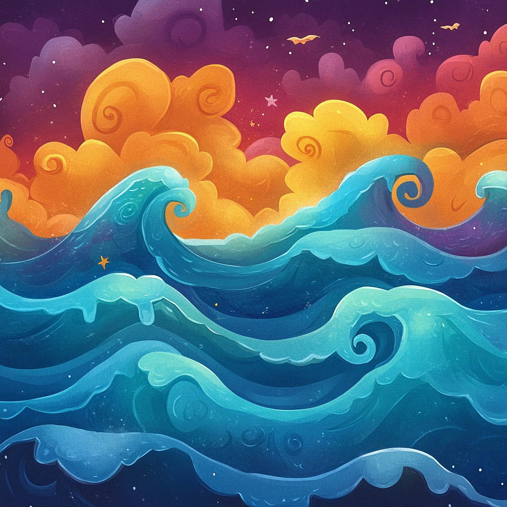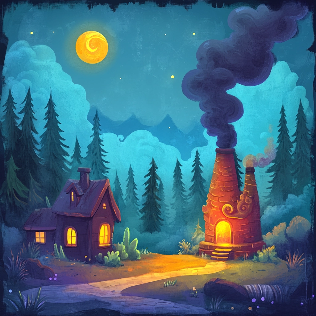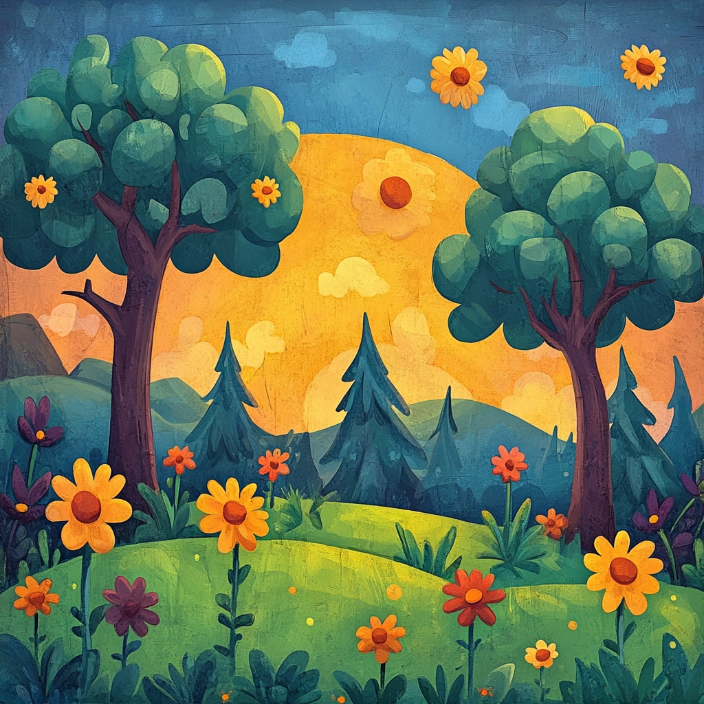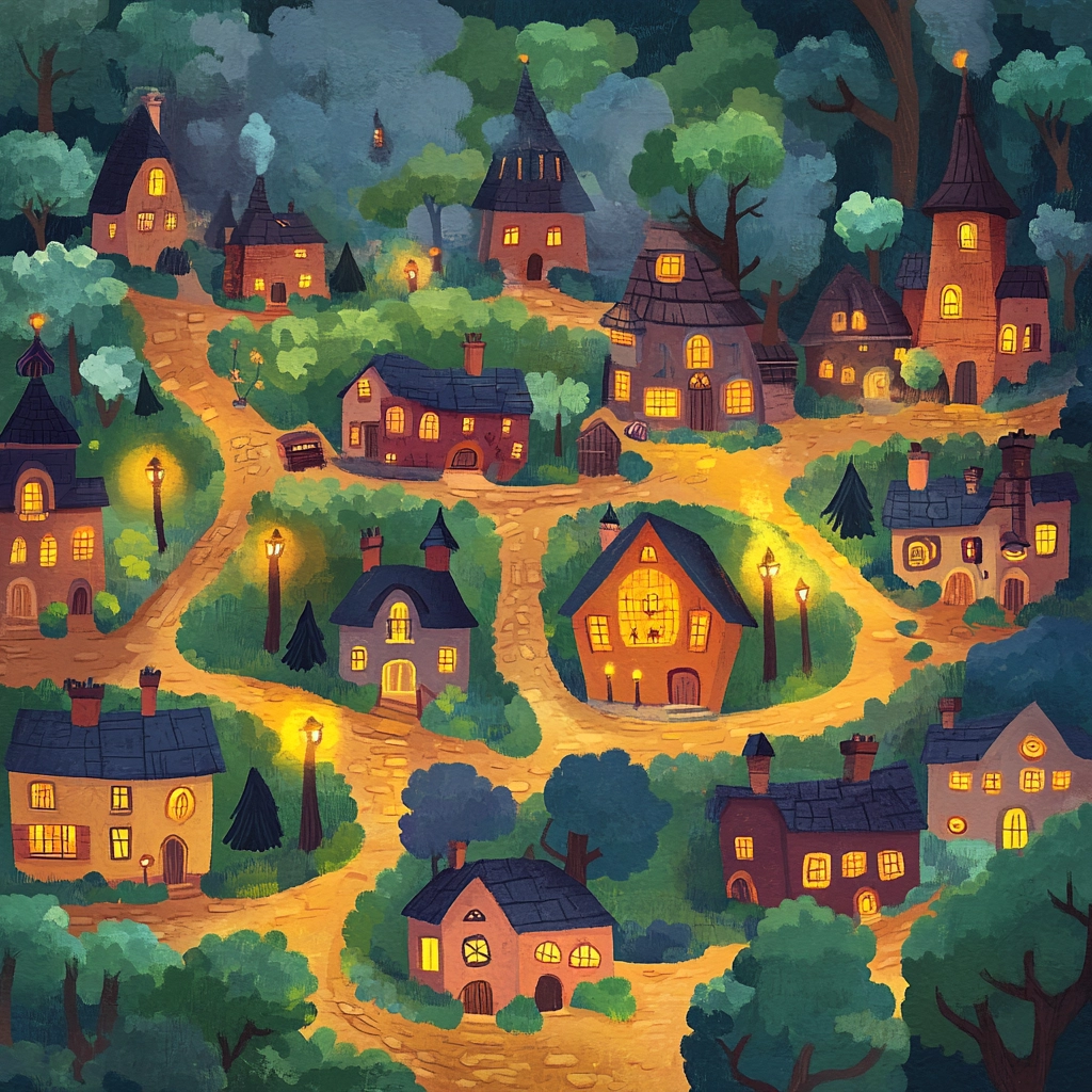 Soft lighting effects highlight warm glows in contrast to a deep blue background. The vibrant colors of orange and green create dynamic scenes, with intricate texture that adds to the depth and dimension of landscapes. Curvilinear elements enhance spatial perception.