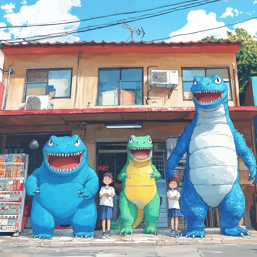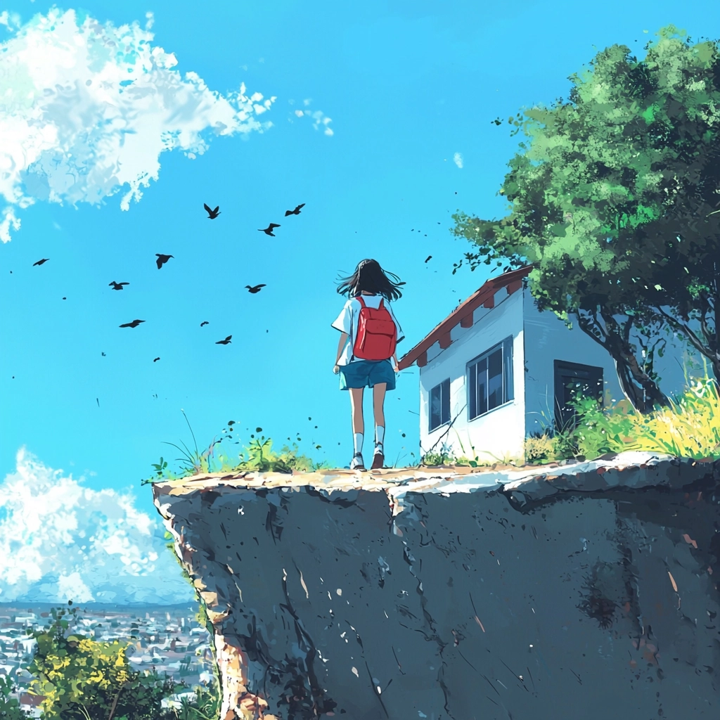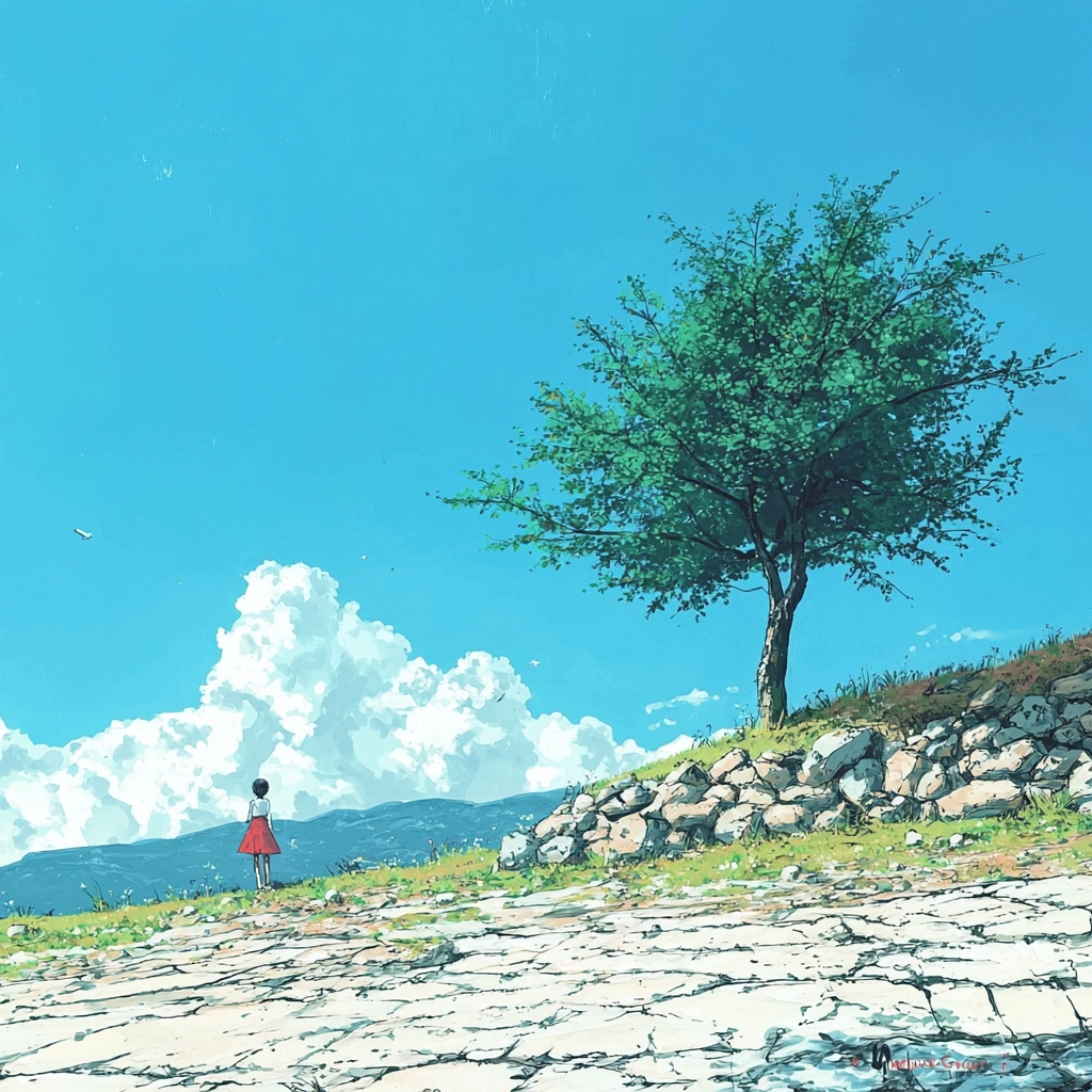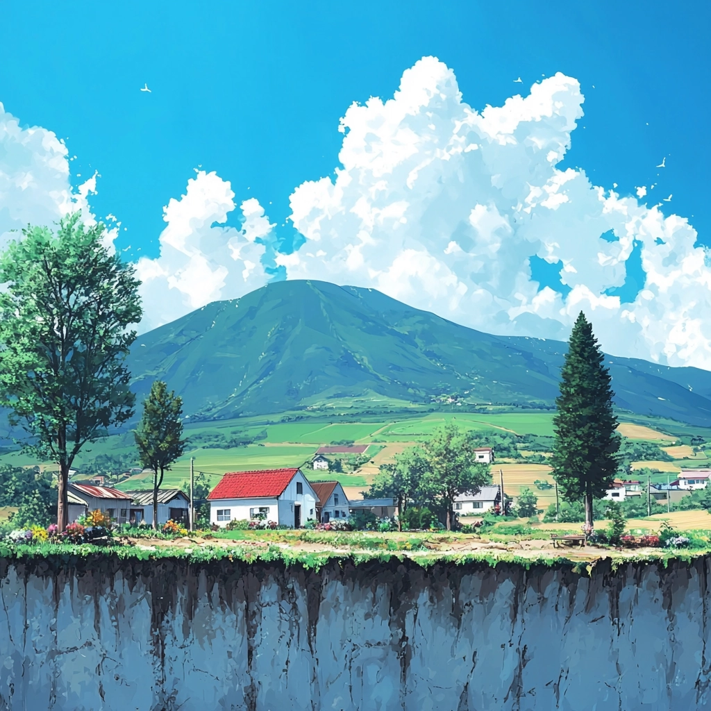 Lighting is crisp with defined shadows, enhancing the vibrant blue sky and lush greenery. The texture is flat yet detailed, capturing a clarity through cel-shading that emphasizes the clean, crisp atmosphere of each scene.