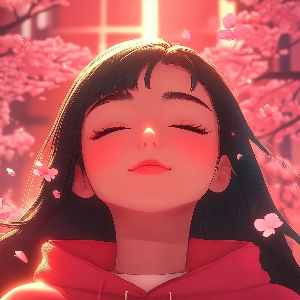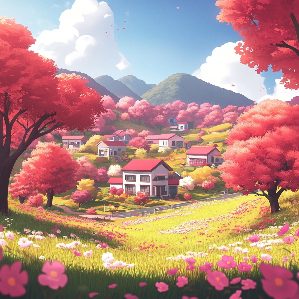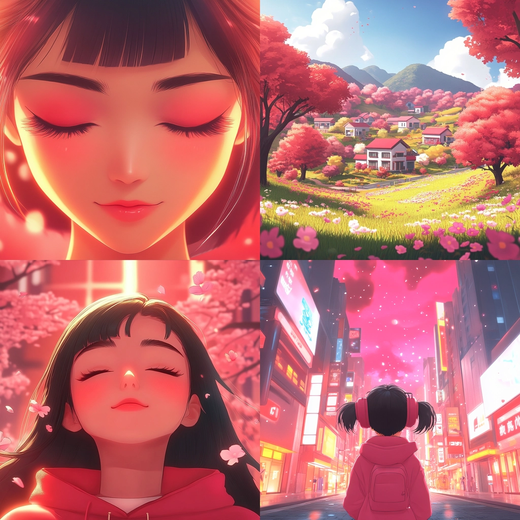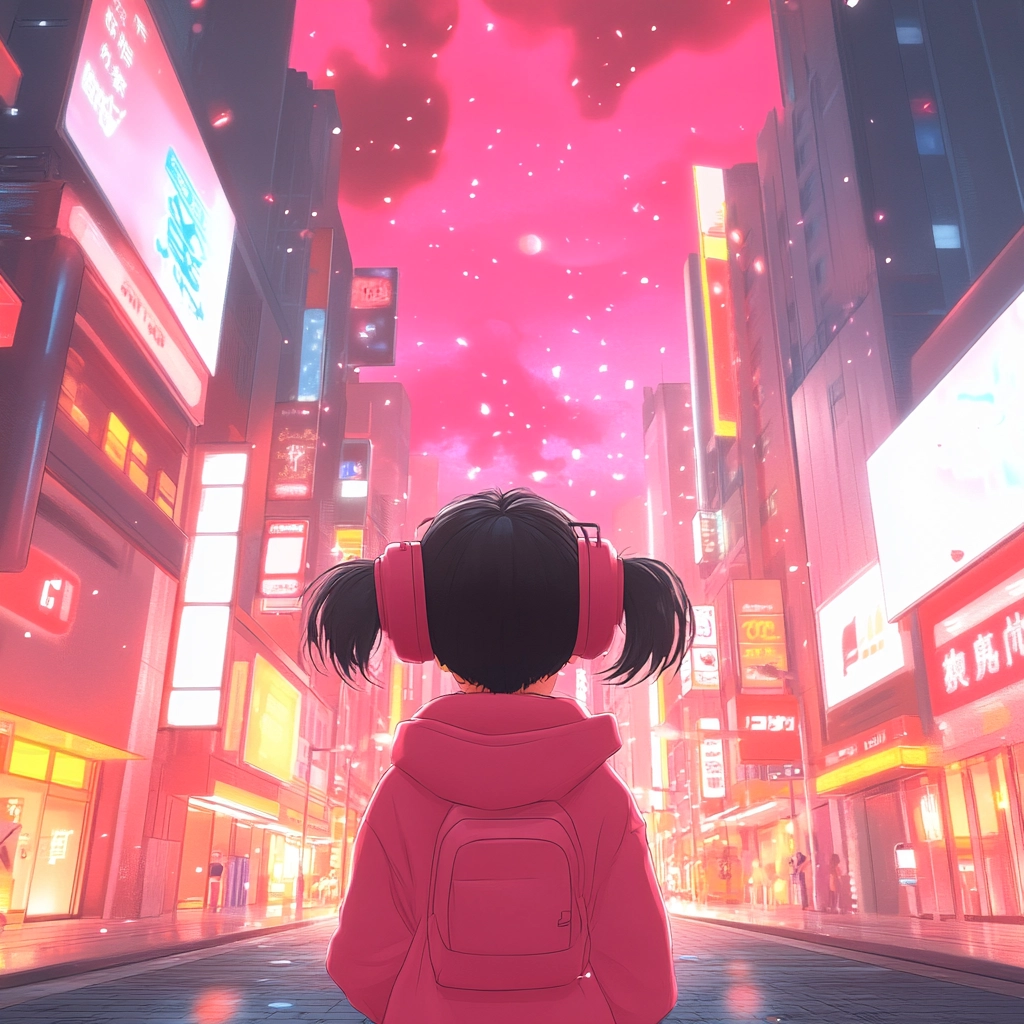 The vivid use of pink and red dominates the scene, providing a lively and energetic atmosphere with hints of blue adding depth.