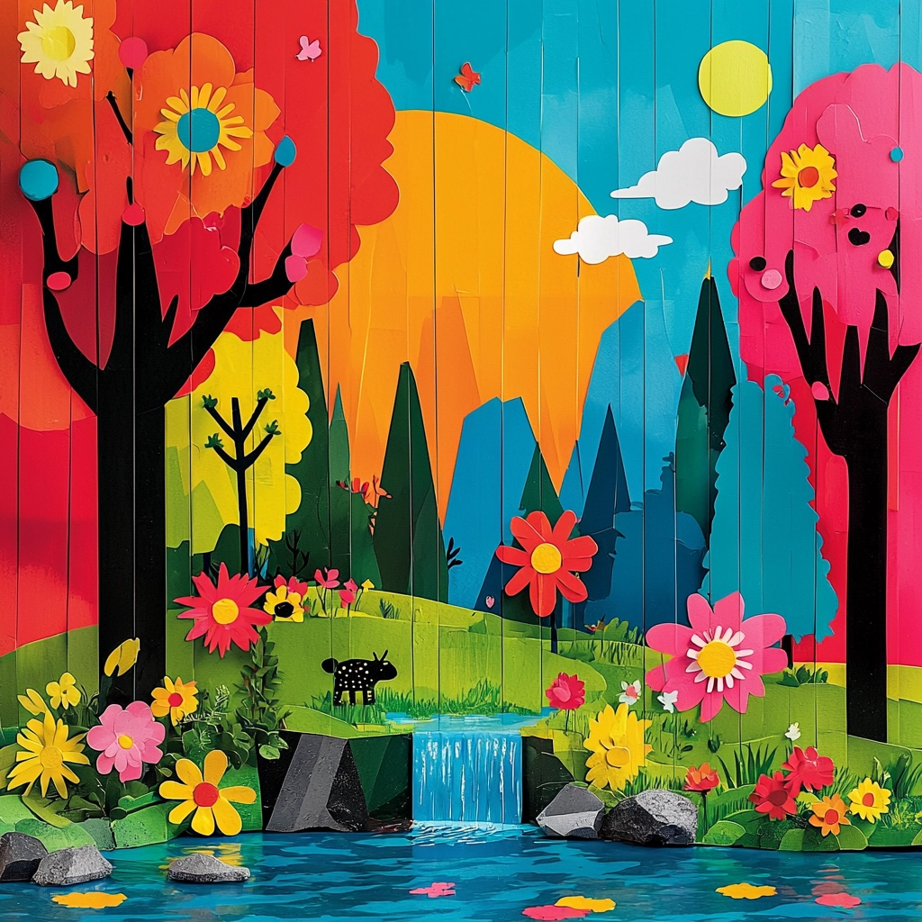Strong light enhances saturated hues, while clear, defined edges emphasize bold shapes. Colors interact dynamically in a flat spatial plane, with textures appearing smooth and cleanly separated.