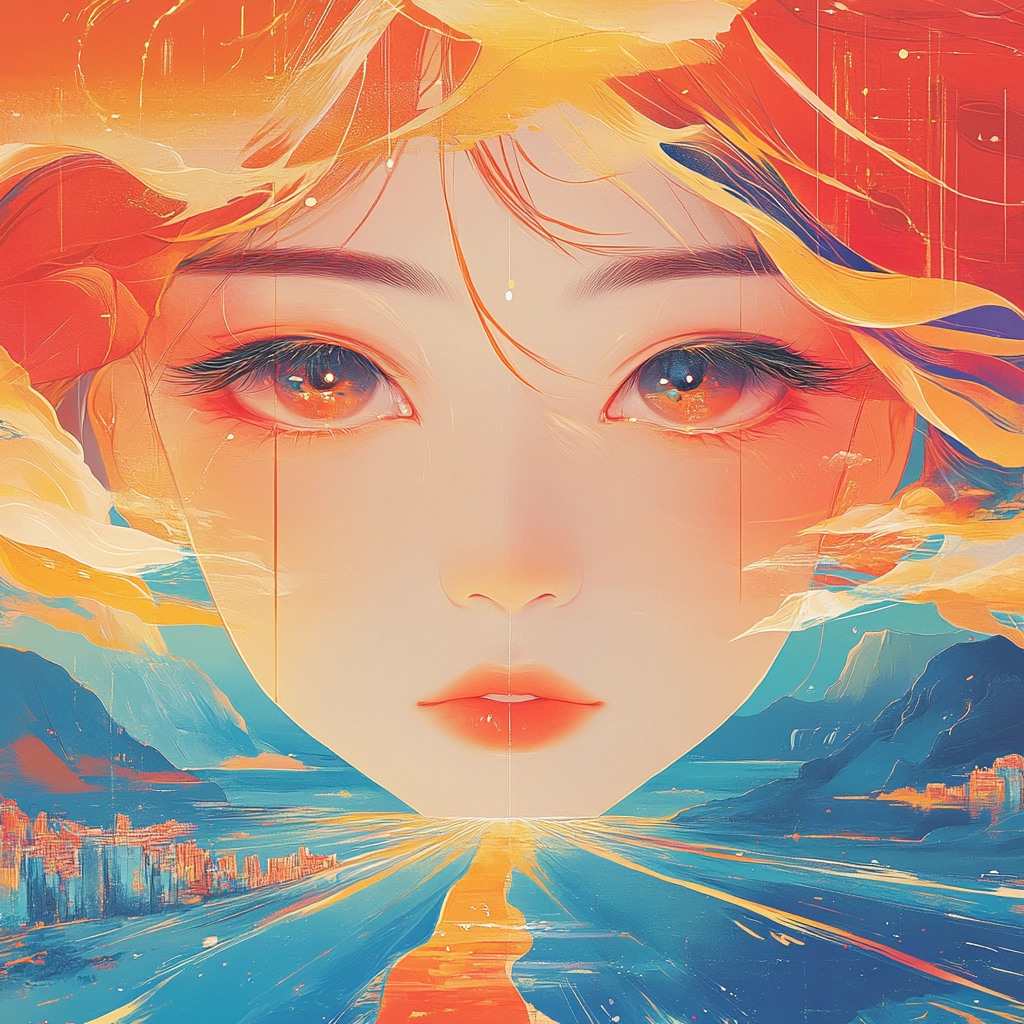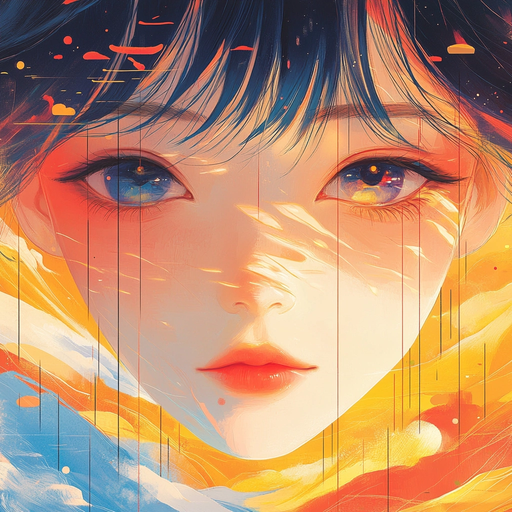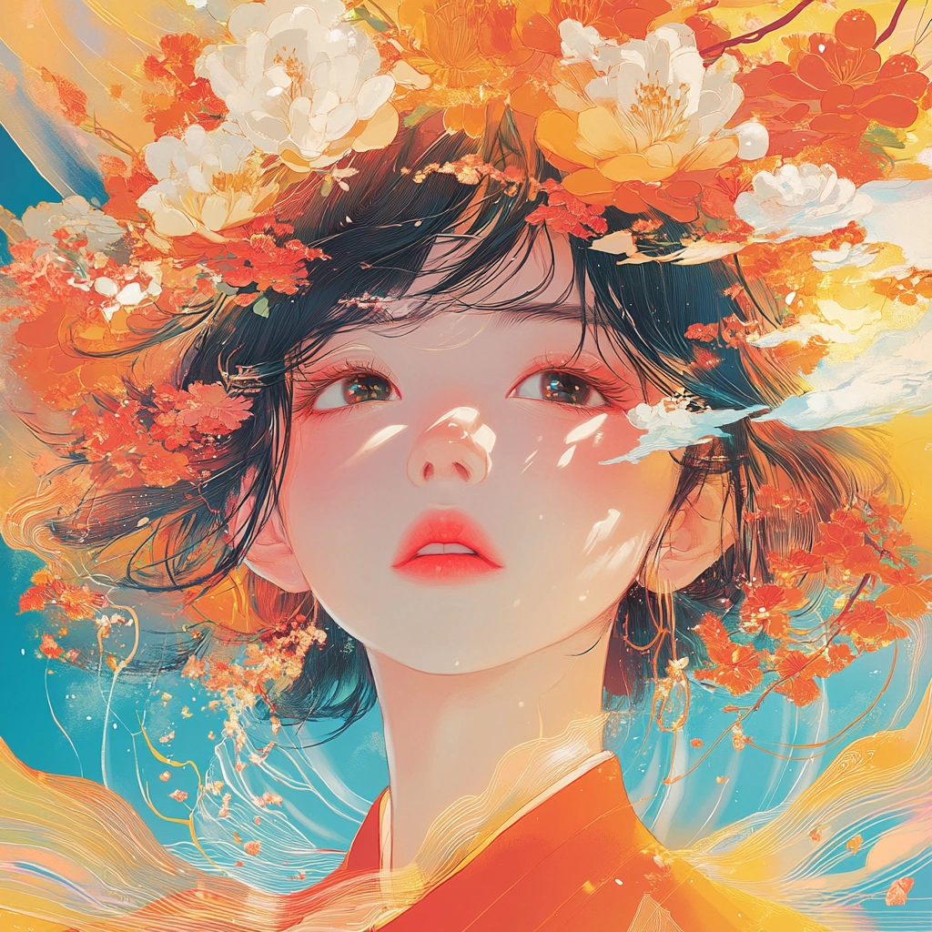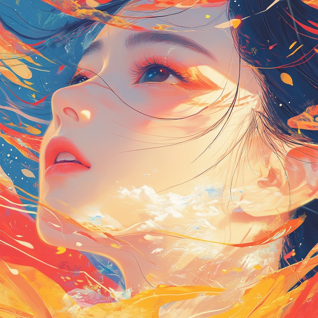 Bright lighting amplifies the saturated hues of orange and blue, creating a vivid and dynamic composition. The elements give an impression of depth and movement through fluid textures and vibrant strokes of color.