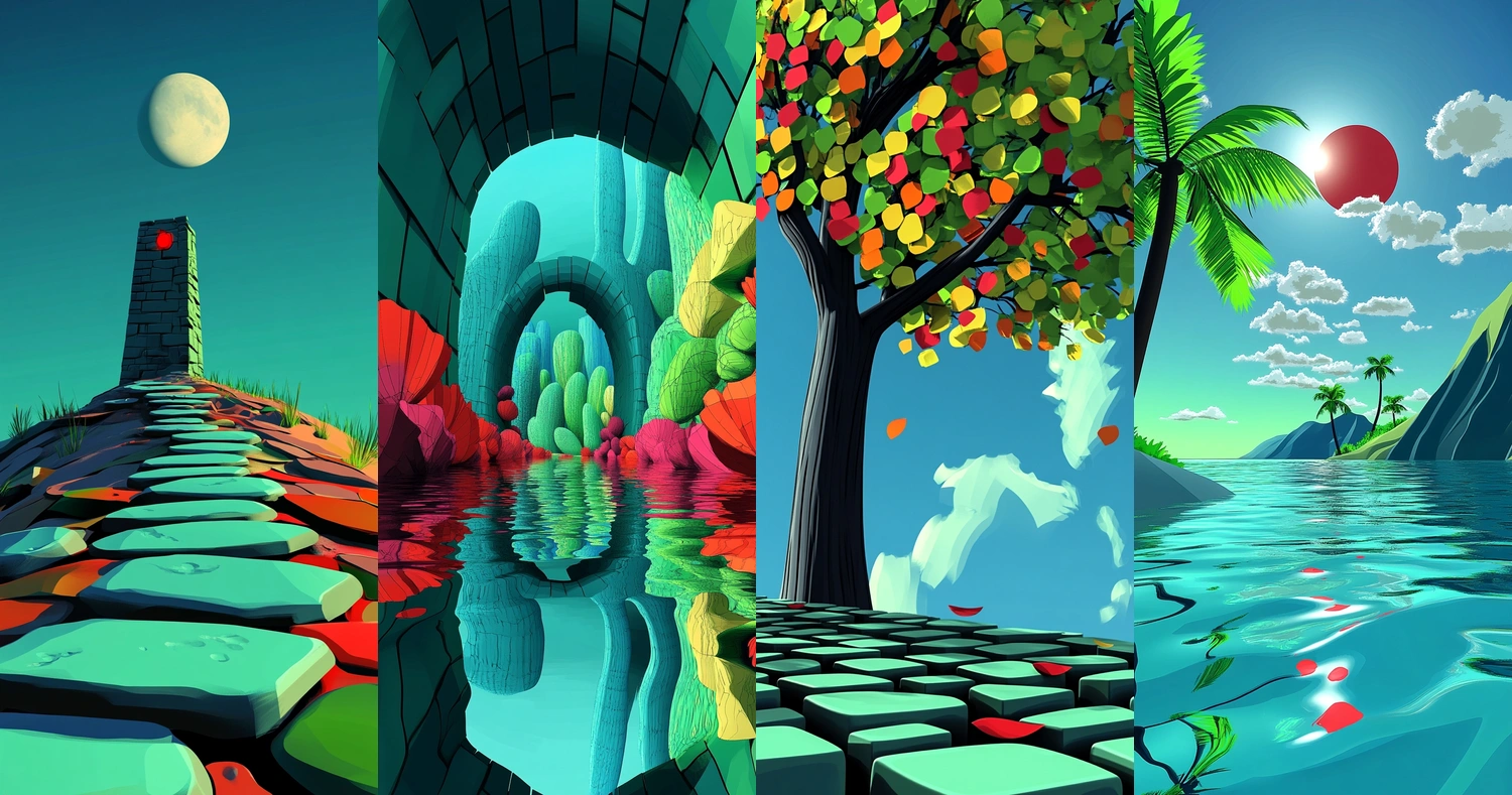 Intricate compositions utilizing vibrant gradients and stark contrasts.