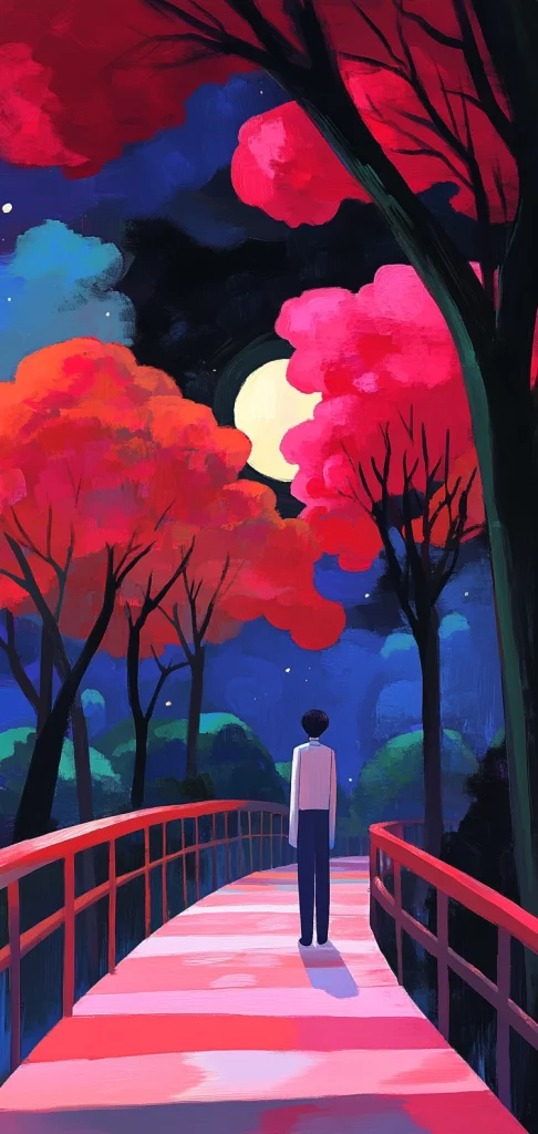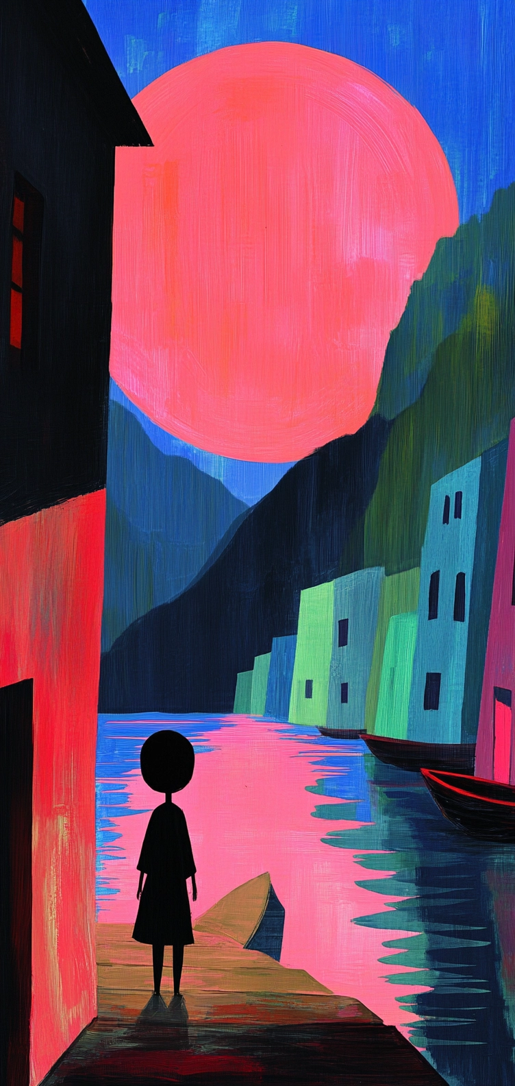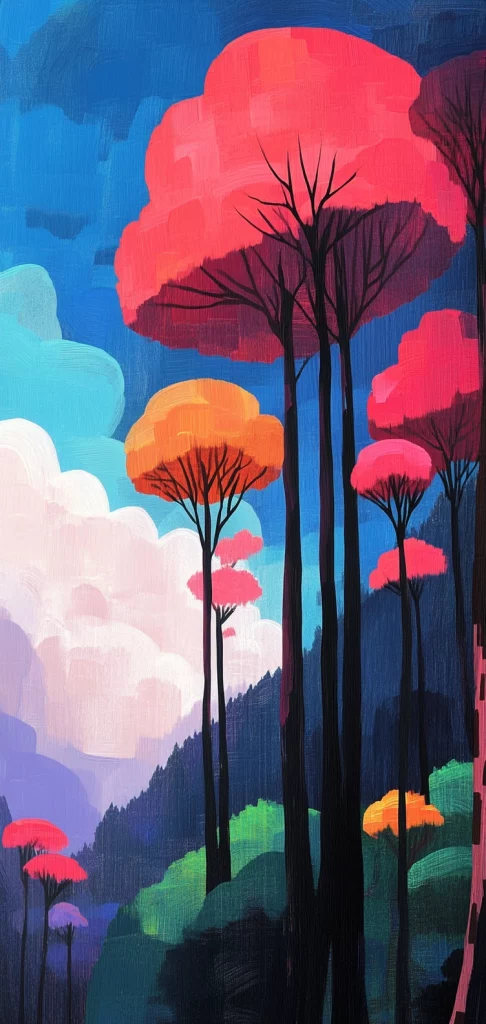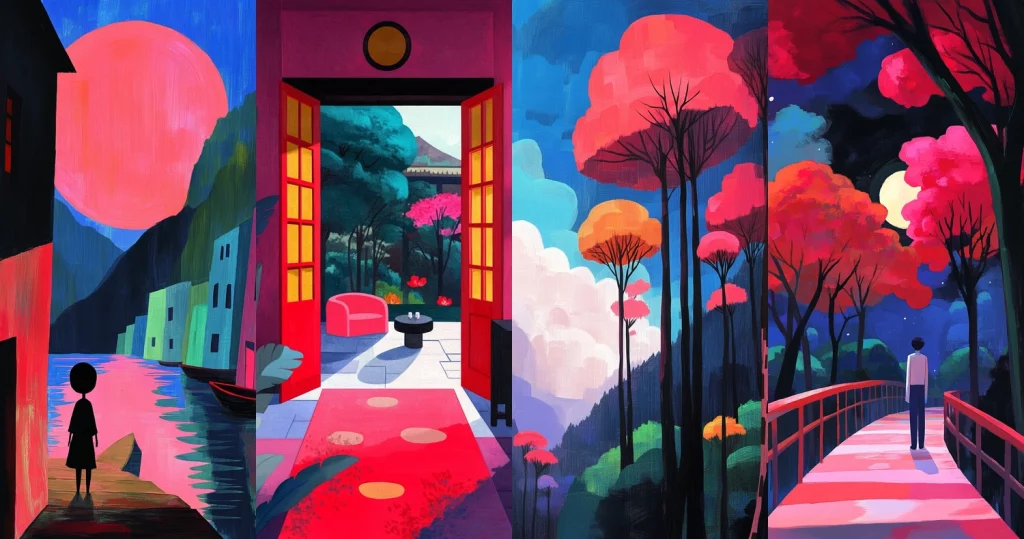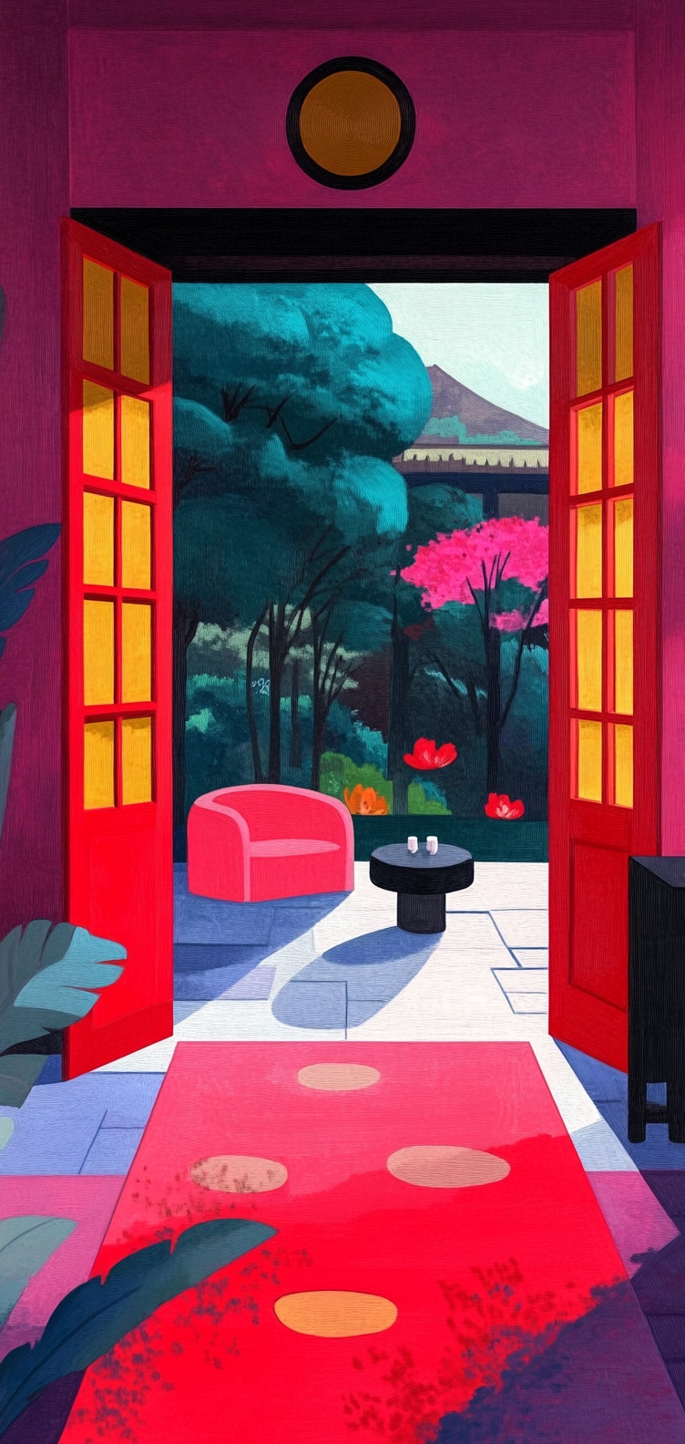 Intense reds contrast with deep blues, crafting a sense of depth and dynamism. Playful use of lighting enhances the interaction of colors, offering a textured, vivid portrayal of space.