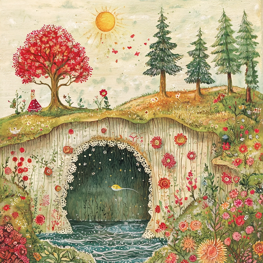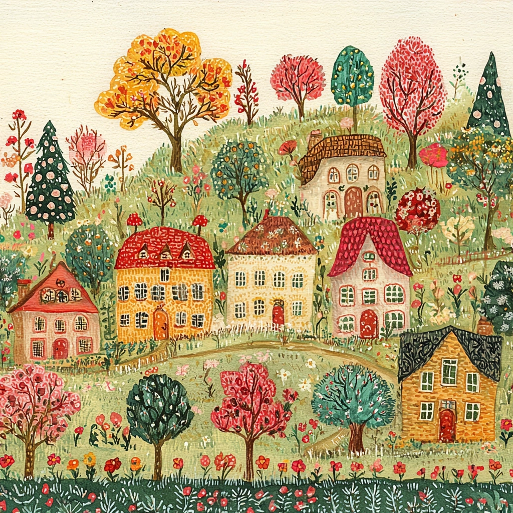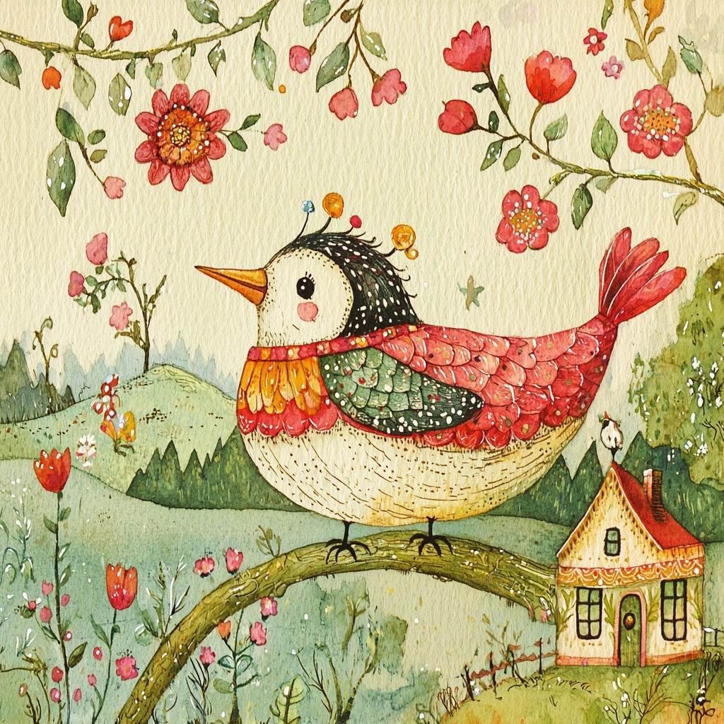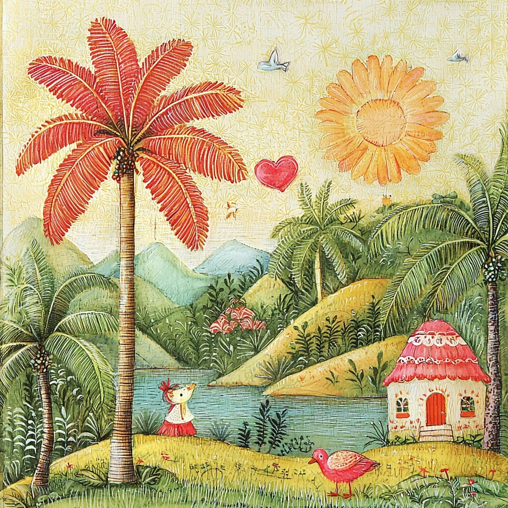 The artwork employs bright and lively colors which draw the eye across playful and fantastical compositions, highlighting fine details with a skilled use of varied textures and shading, offering a textured finish that adds depth.