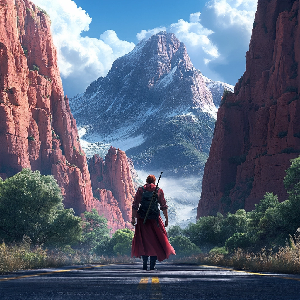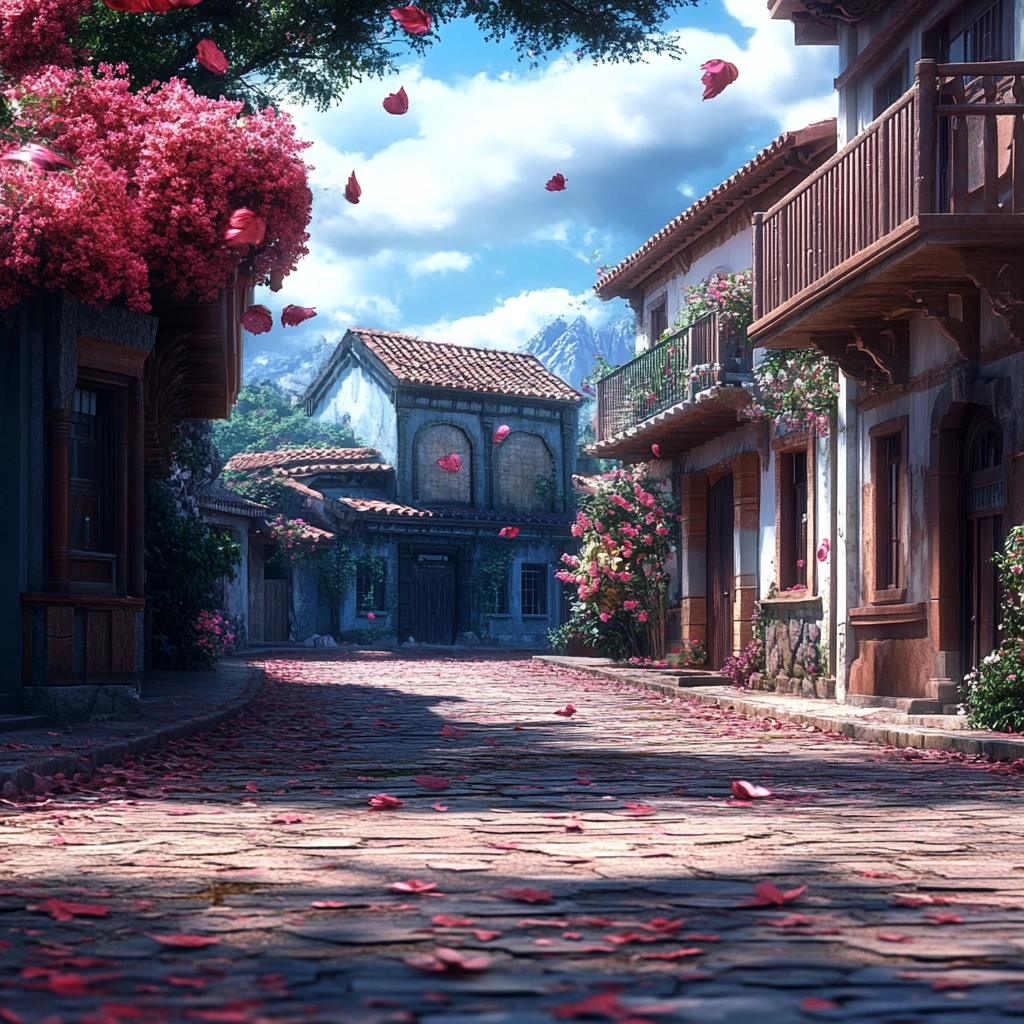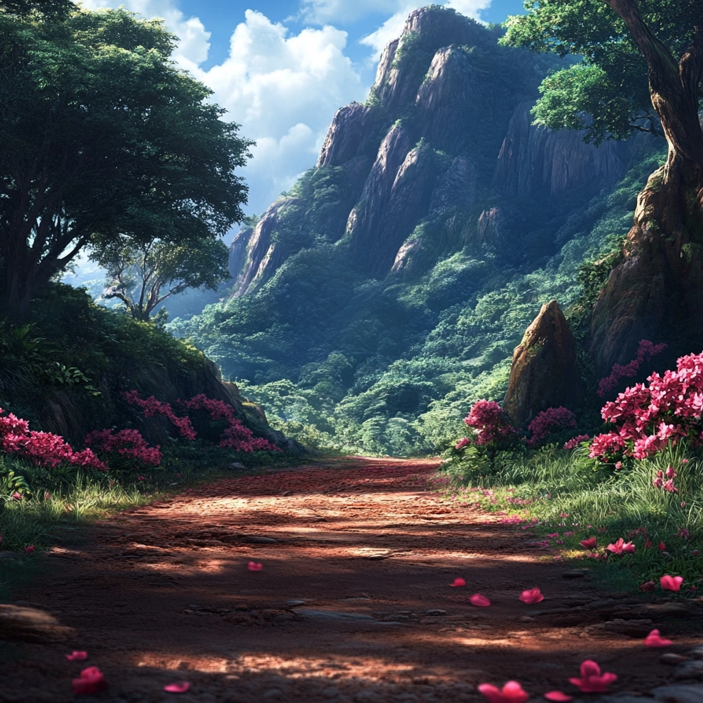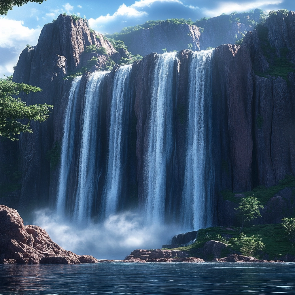 The lighting effects create a vivid clarity, enhancing the contrast between natural and human-made elements. Colors are bright and well-defined, with each component displaying varied textures that simulate the tactile sensations of surfaces like rock, foliage, and water. Spatial sense is deep and intricate, drawing the viewer into an expansive and immersive environment.