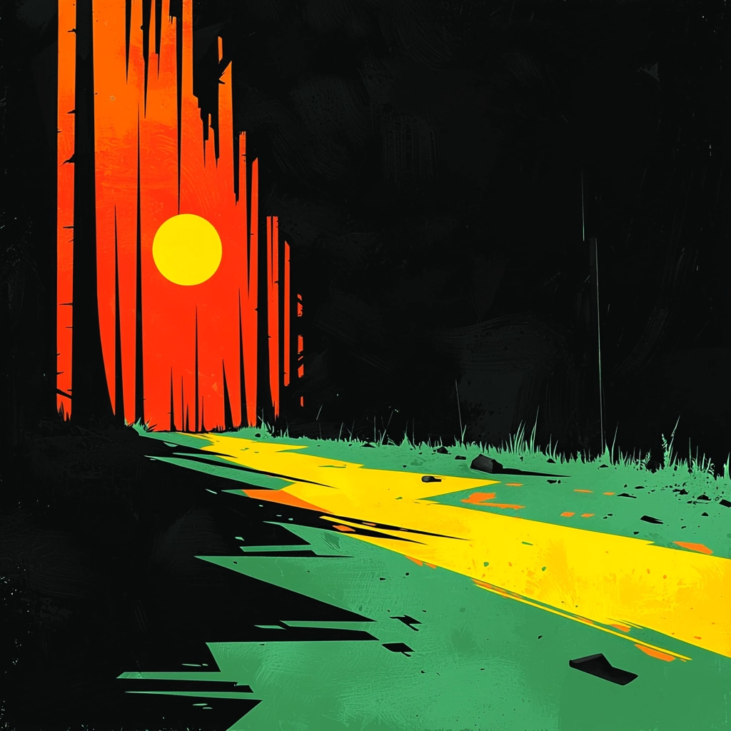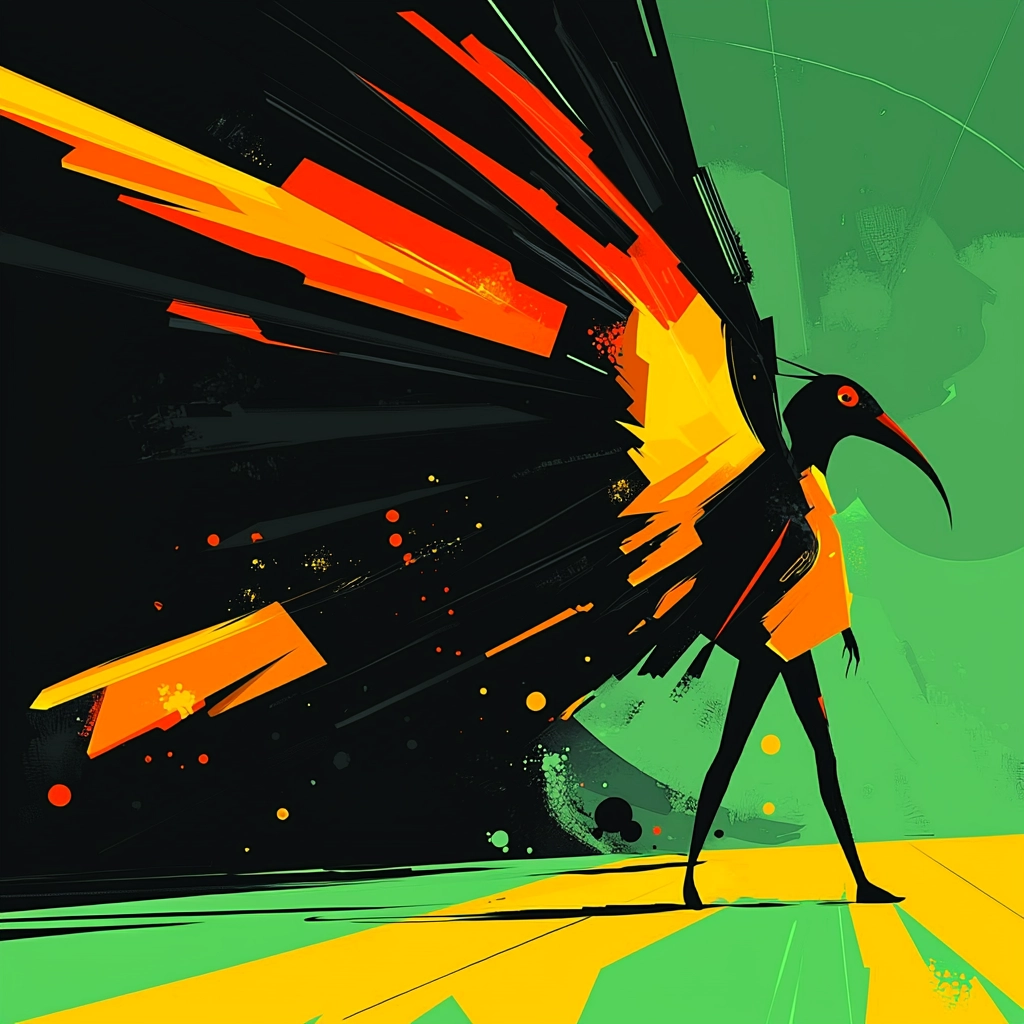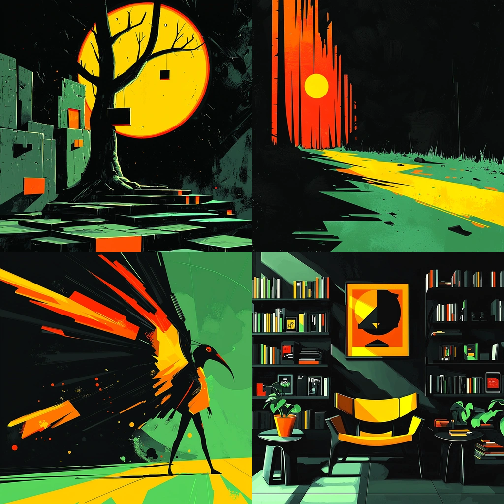 A bold contrast of deep blacks with vivid yellows and greens creates dynamic interactions between light and shadow.