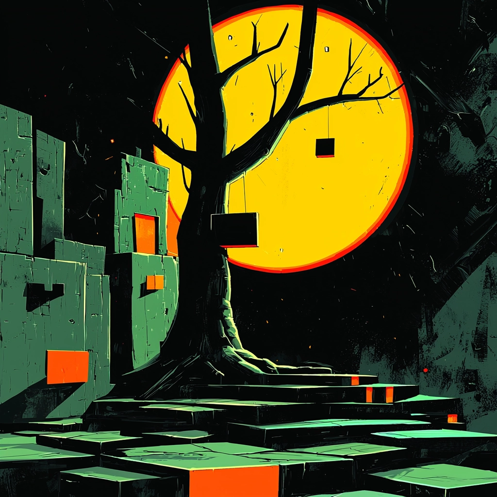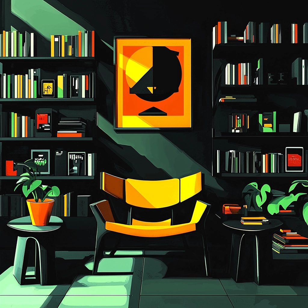 Sharp lighting casts strong, defined shadows emphasizing geometric forms. Vivid colors contrast against deep blacks to create a sense of depth, with smooth textures highlighting spatial elements.