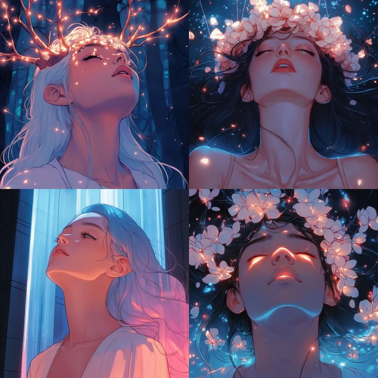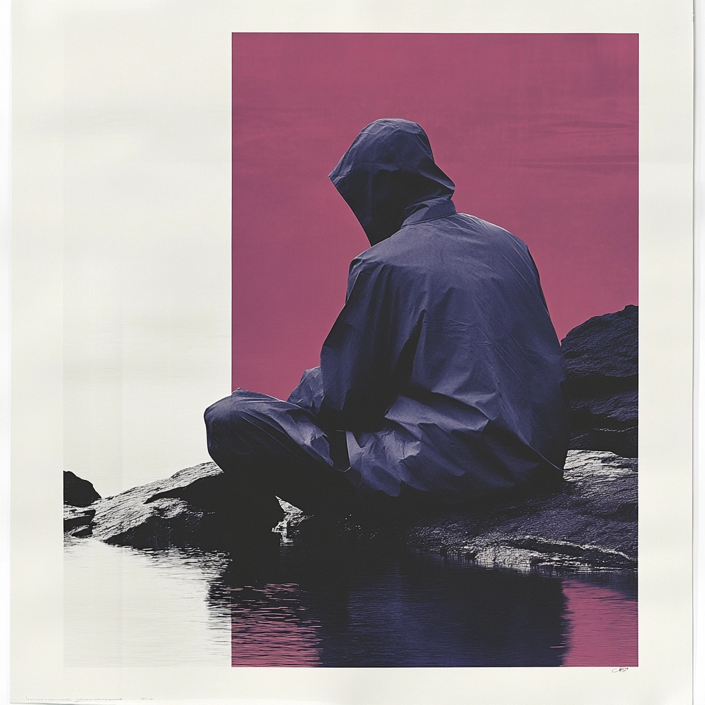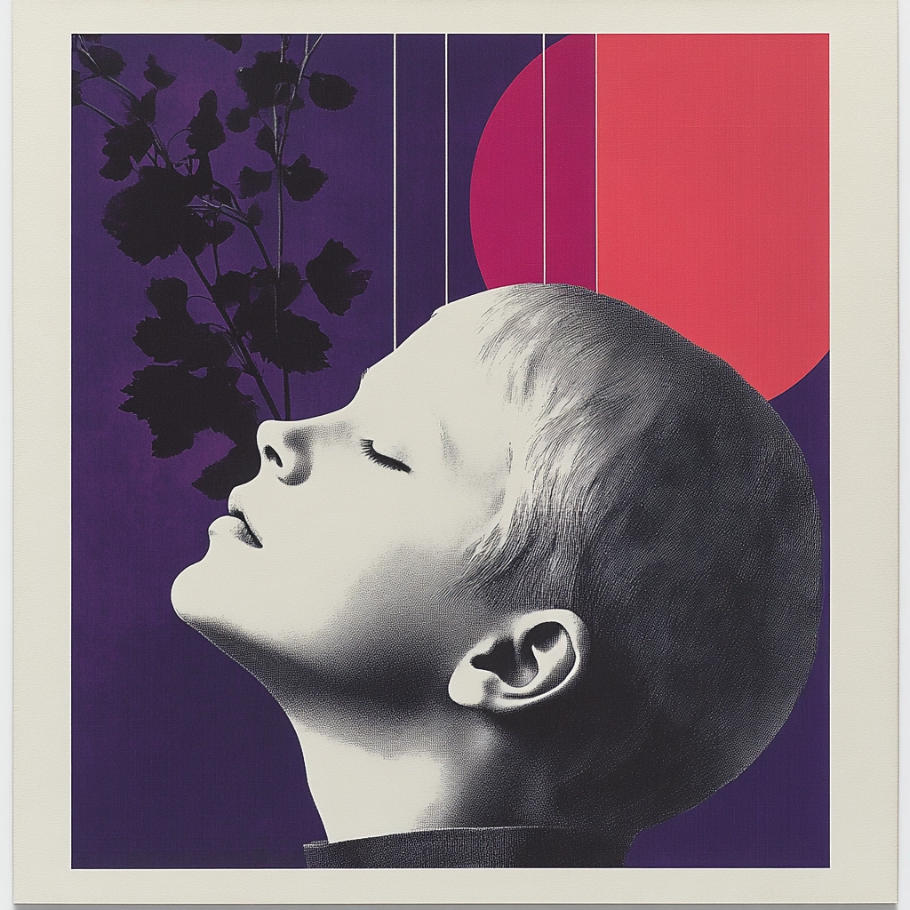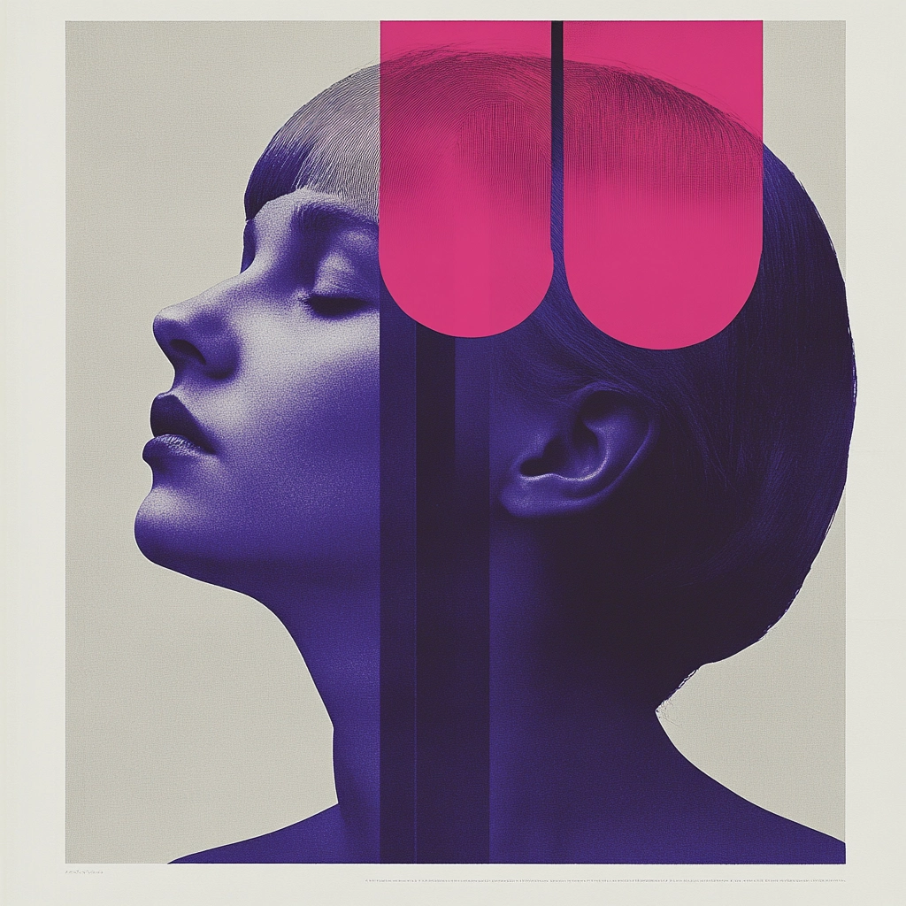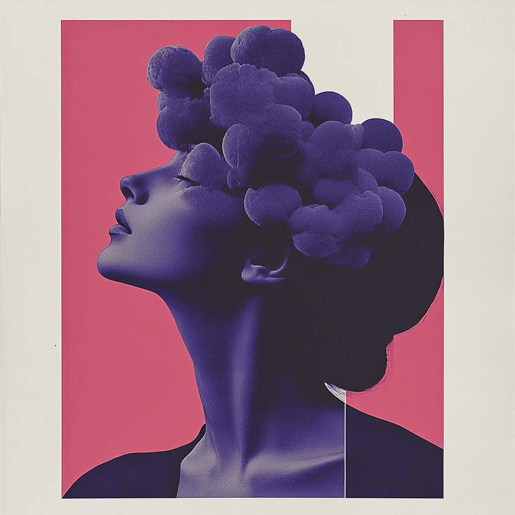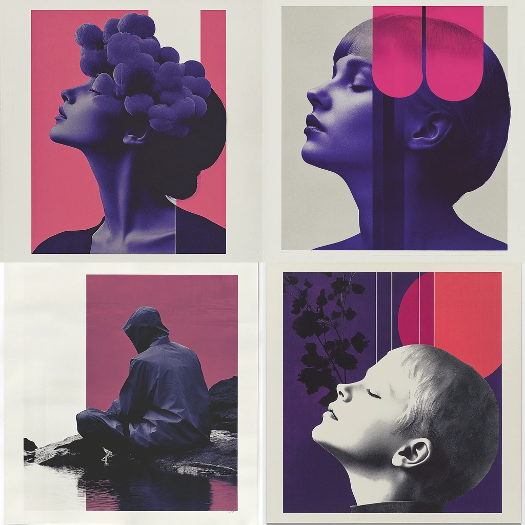 Explores bold contrasts with vivid purple and magenta tones, integrating sharp silhouettes and muted gray shades.