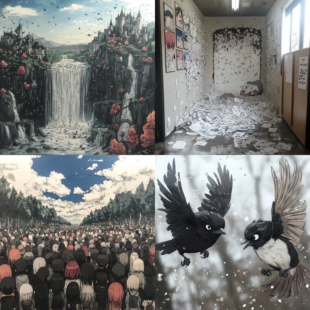 Strong lighting emphasizes depth and vivid blues provide a striking contrast against darker hues, while textures vary from smooth to intricate, capturing spatial complexity across scenes.