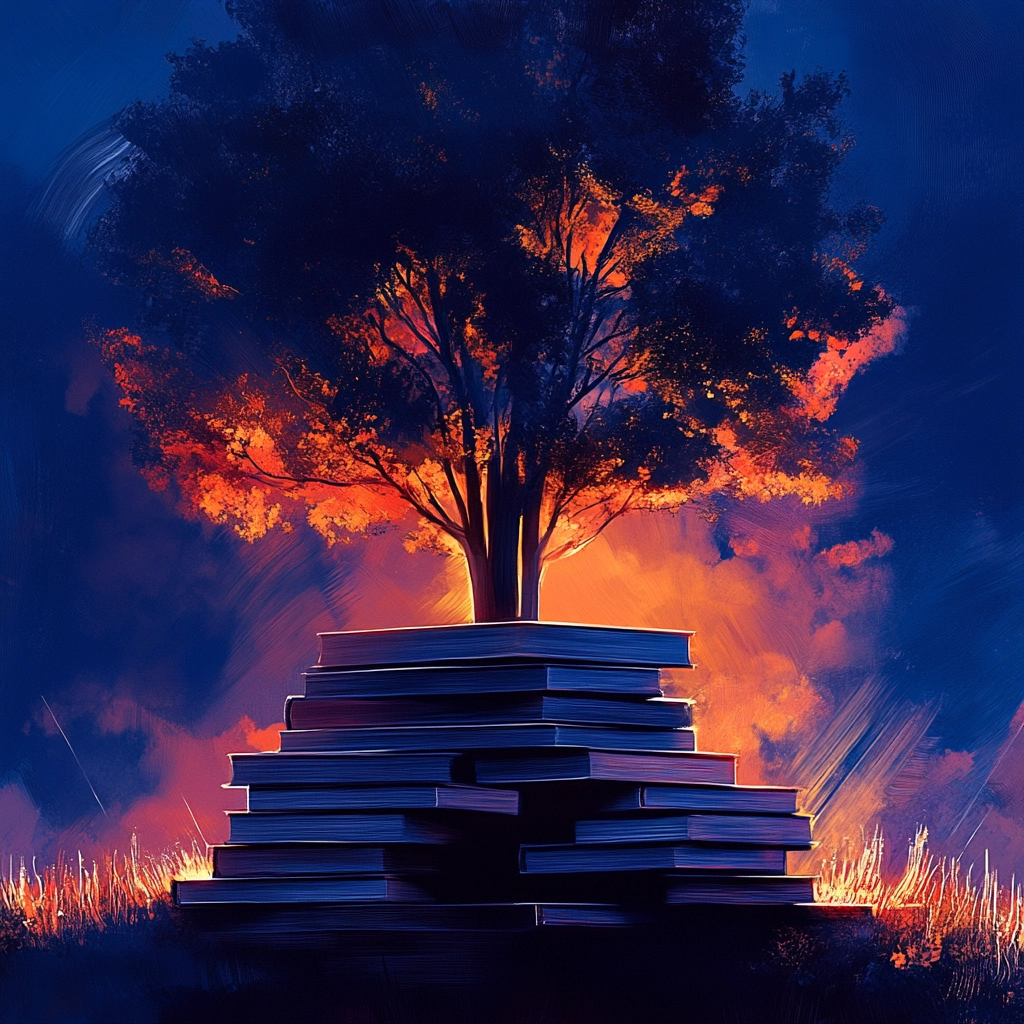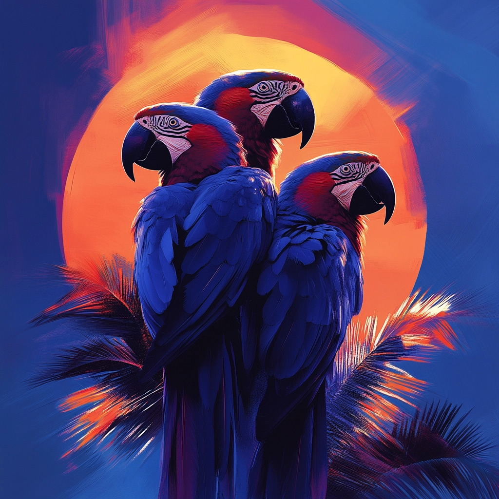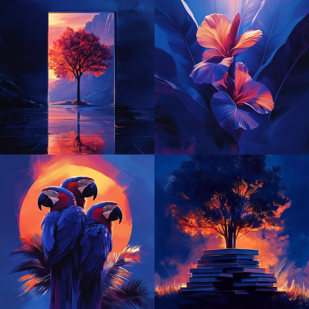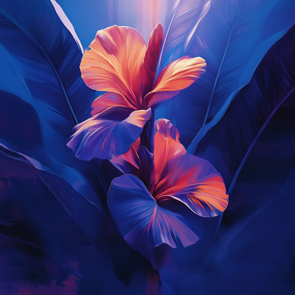The composition showcases a dynamic interplay of intense hues and dramatic contrasts, highlighting the stark juxtaposition between deep blues and vibrant oranges, with controlled lighting and intricate textures adding depth.