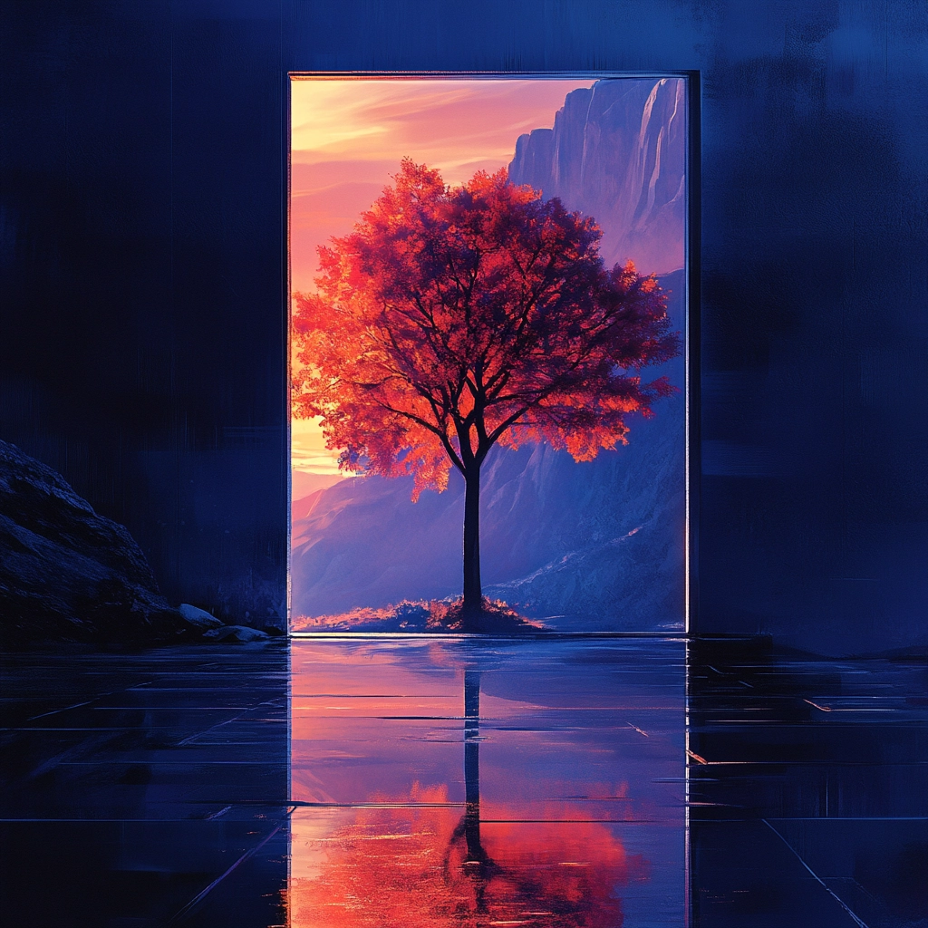 Lighting effects create a striking contrast, accentuating the vibrancy of the orange tones against a rich blue backdrop. The colors are saturated and vibrant, leading to an intense spatial sense where different elements merge through vivid gradients and subtle texture. The use of light enhances dimensionality, while textures add realistic detail.
