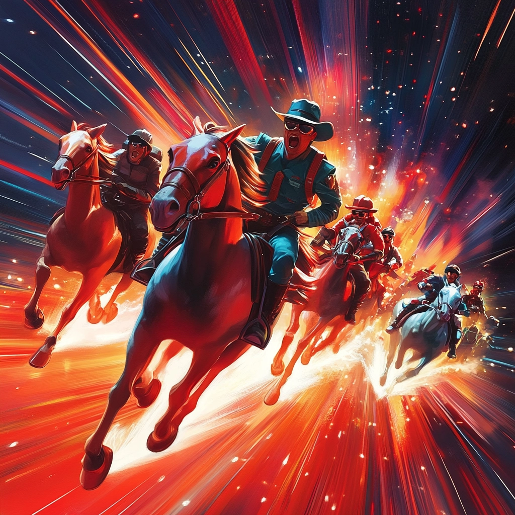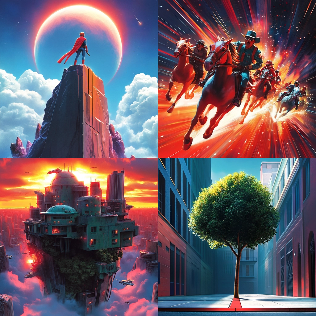 Lighting effects create a sense of action and depth, enhancing the vivid colors. Distinct texture details emphasize motion and space, while compositions play with scale and perspective to evoke intensity.