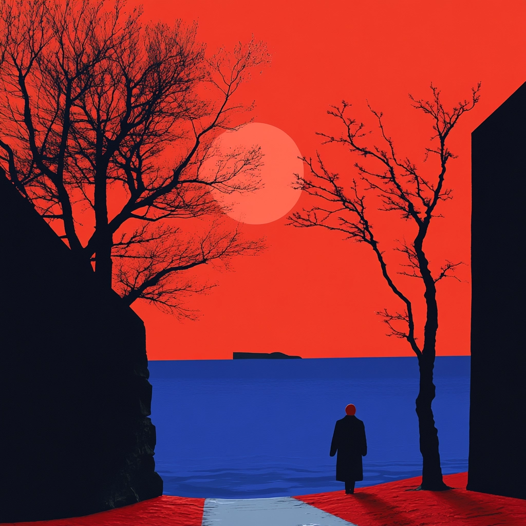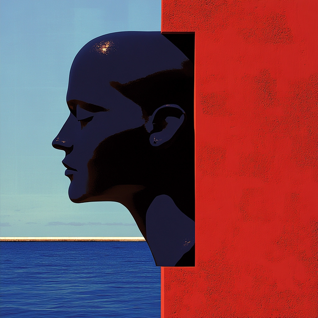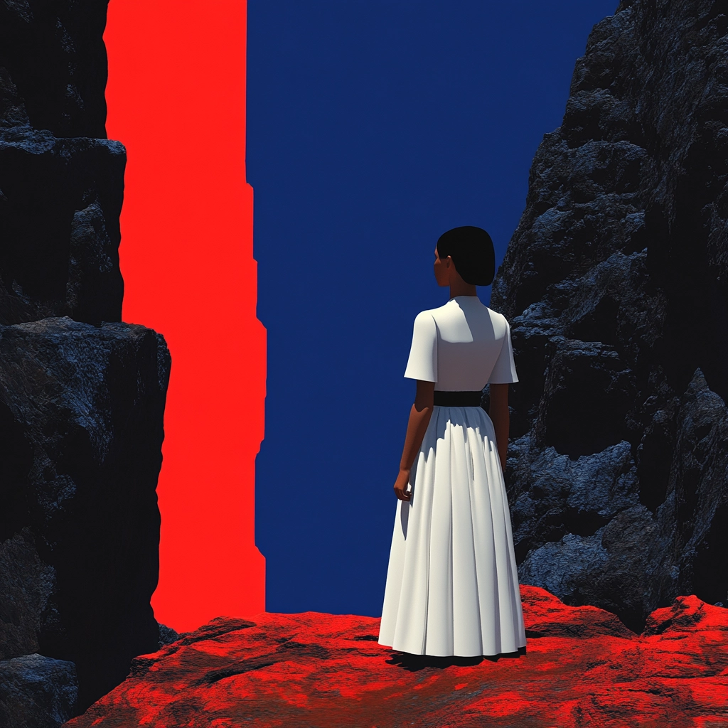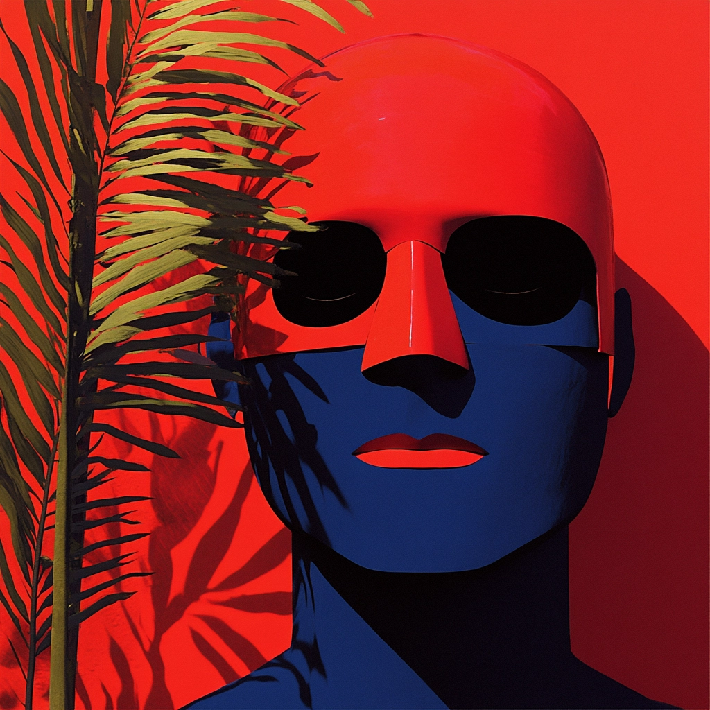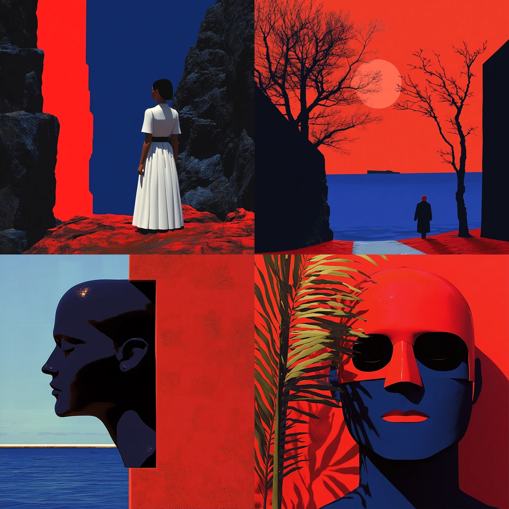 Sharp lighting accentuates strong color separations and textures. The saturated red pairs with deep blue to create dynamic visual tension, while black adds depth. Space feels orderly, with minimal layering of elements.