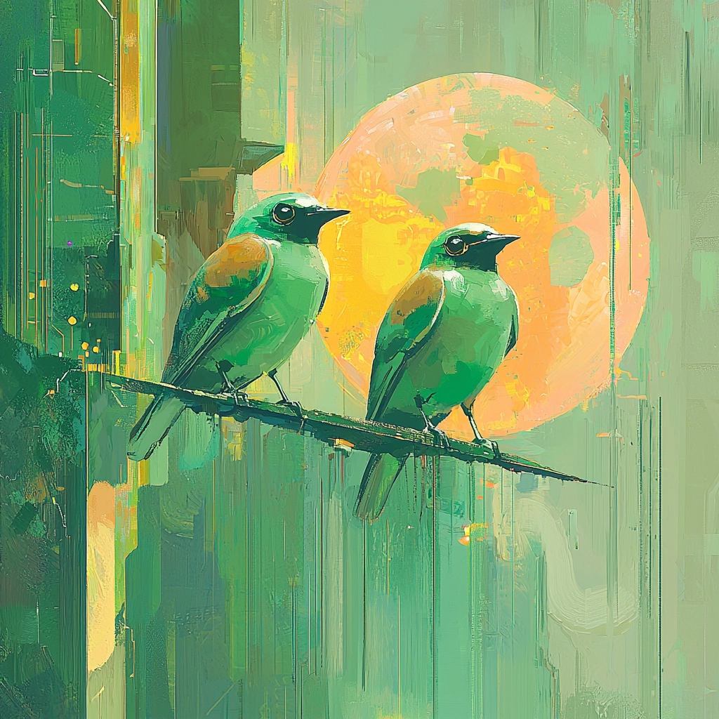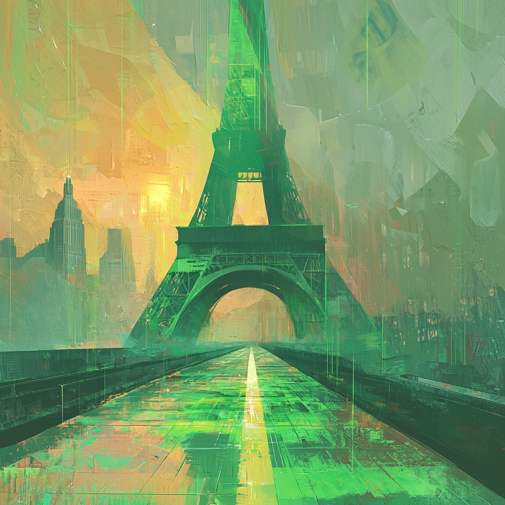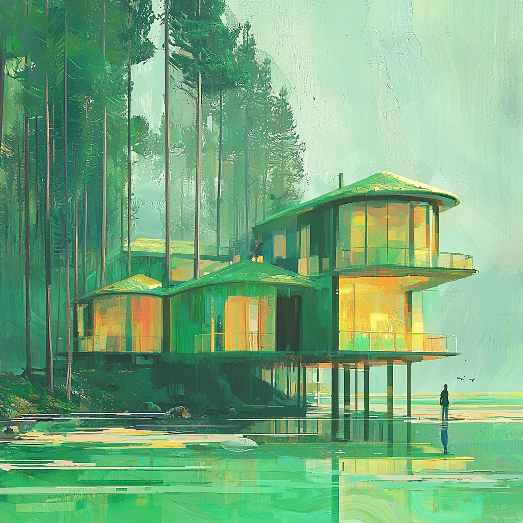 The vivid blend of greens and yellows features atmospheric depth and architectural subjects.