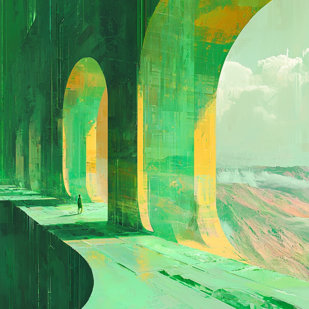 The artwork uses luminous lighting to highlight structural elements, juxtaposing organic and architectural forms. A vibrant interplay of yellows and greens offers a dynamic spatial experience, enhanced by textured surfaces that emphasize artistic detail.