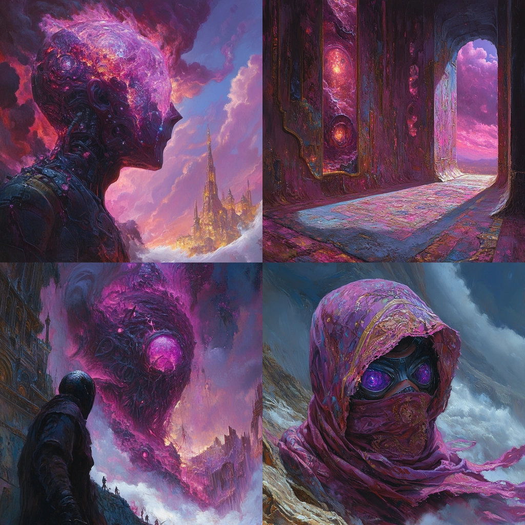 Lighting effects accentuate the complexity of textures, blending bright purples, pinks, and deep blues with varying intensity. Spatial sense is heightened by layered compositions and use of depth, with textures expressed through meticulous detailing and contrasting materials.
