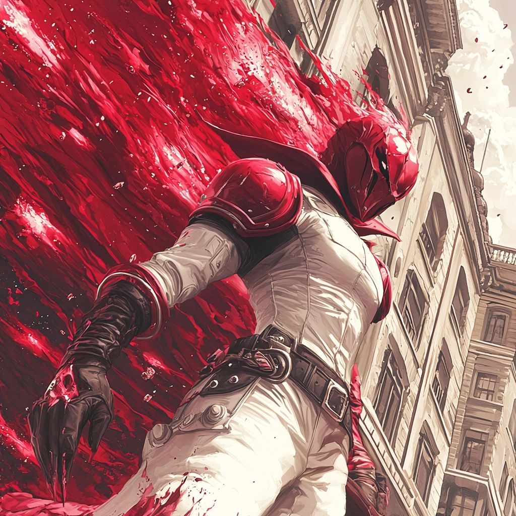 Lighting is dramatic with highlights accentuating the muscular build and textures. The red color is bold, almost explosive in its presence, creating dynamic movement within a clearly defined space. The textures are meticulously detailed, giving a sense of depth and intensity.